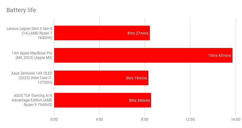 Về thời lượng pin, viên pin 73.6Wh cho kết quả khá tốt. Trong bài kiểm tra phát lại video bằng VLC, máy hoạt động liên tục trong 8 giờ 27 phút. Thời gian này đủ cho một ngày làm việc văn phòng nếu không sử dụng GPU rời cho các tác vụ nặng.