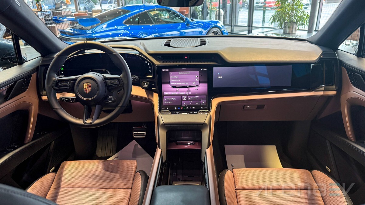 Khoang nội thất Cayenne Electric được làm mới gần như hoàn toàn, ngoại trừ vô-lăng giữ nguyên từ các mẫu Porsche khác. Phía sau vô-lăng là cảm biến quét mắt nhằm phát hiện tình trạng buồn ngủ của người lái.