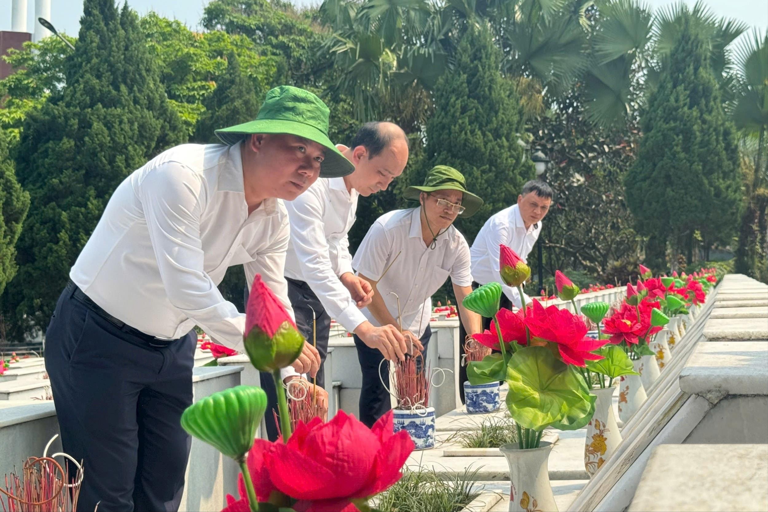 Thắp hương tại các phần mộ liệt sĩ ở Nghĩa trang Liệt sĩ Quốc gia Vị Xuyên. Ảnh: Mai Hoa