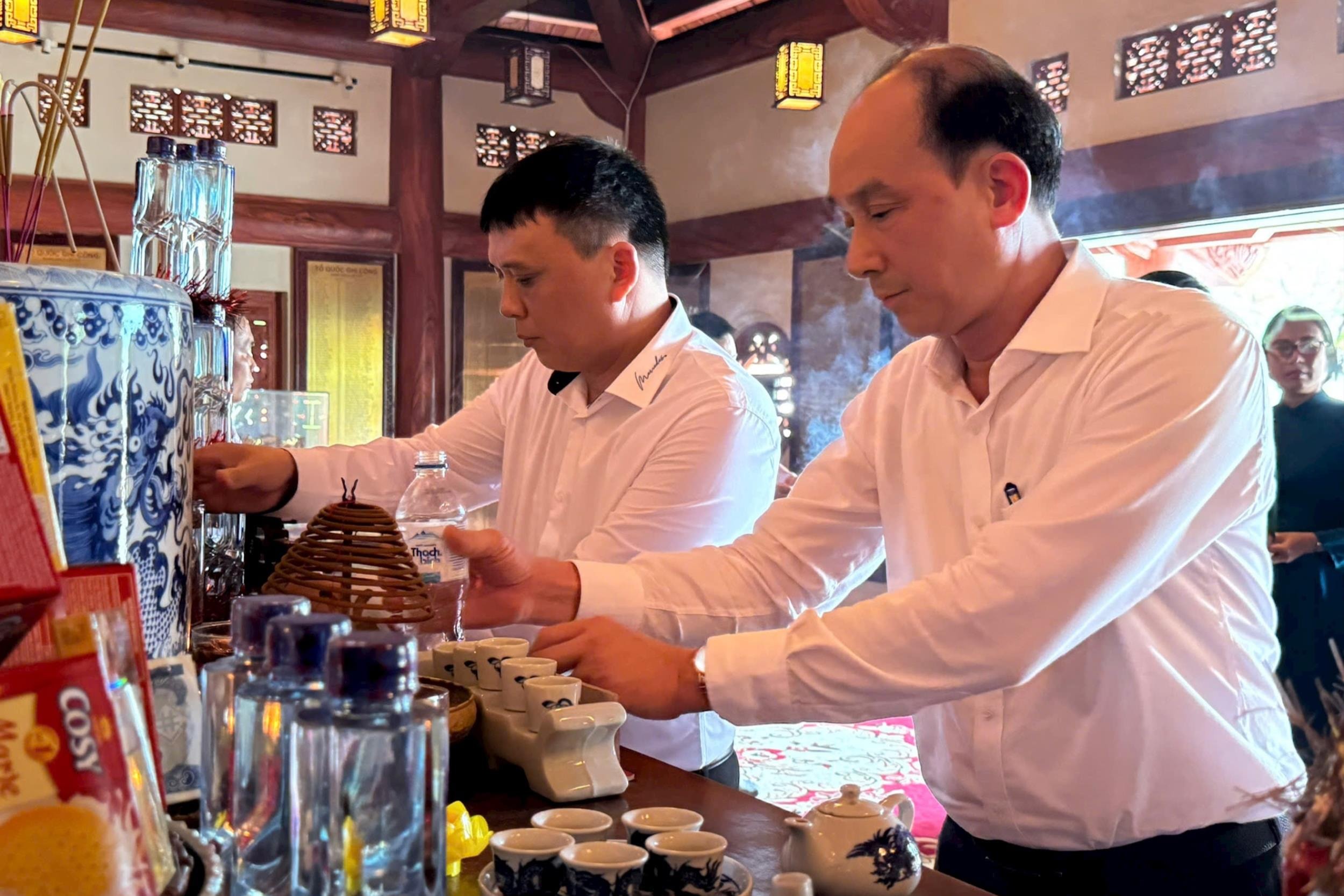 Đồng chí Nguyễn Minh Long, Thành ủy viên, Bí thư Đảng ủy, Giám đốc Sở Nội vụ Hà Nội; cùng Phó Giám đốc Sở Nội vụ Hà Nội Nguyễn Tây Nam thực hiện nghi thức dâng lễ trước bàn thờ các anh hùng liệt sĩ tại tỉnh Tuyên Quang. Ảnh: Mai Hoa