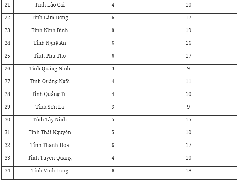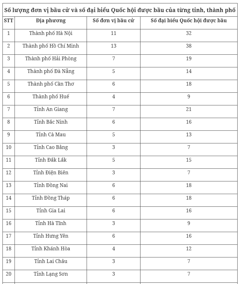 Số lượng đơn vị bầu cử và số đại biểu Quốc hội được bầu của từng tỉnh, thành phố cụ thể như sau: