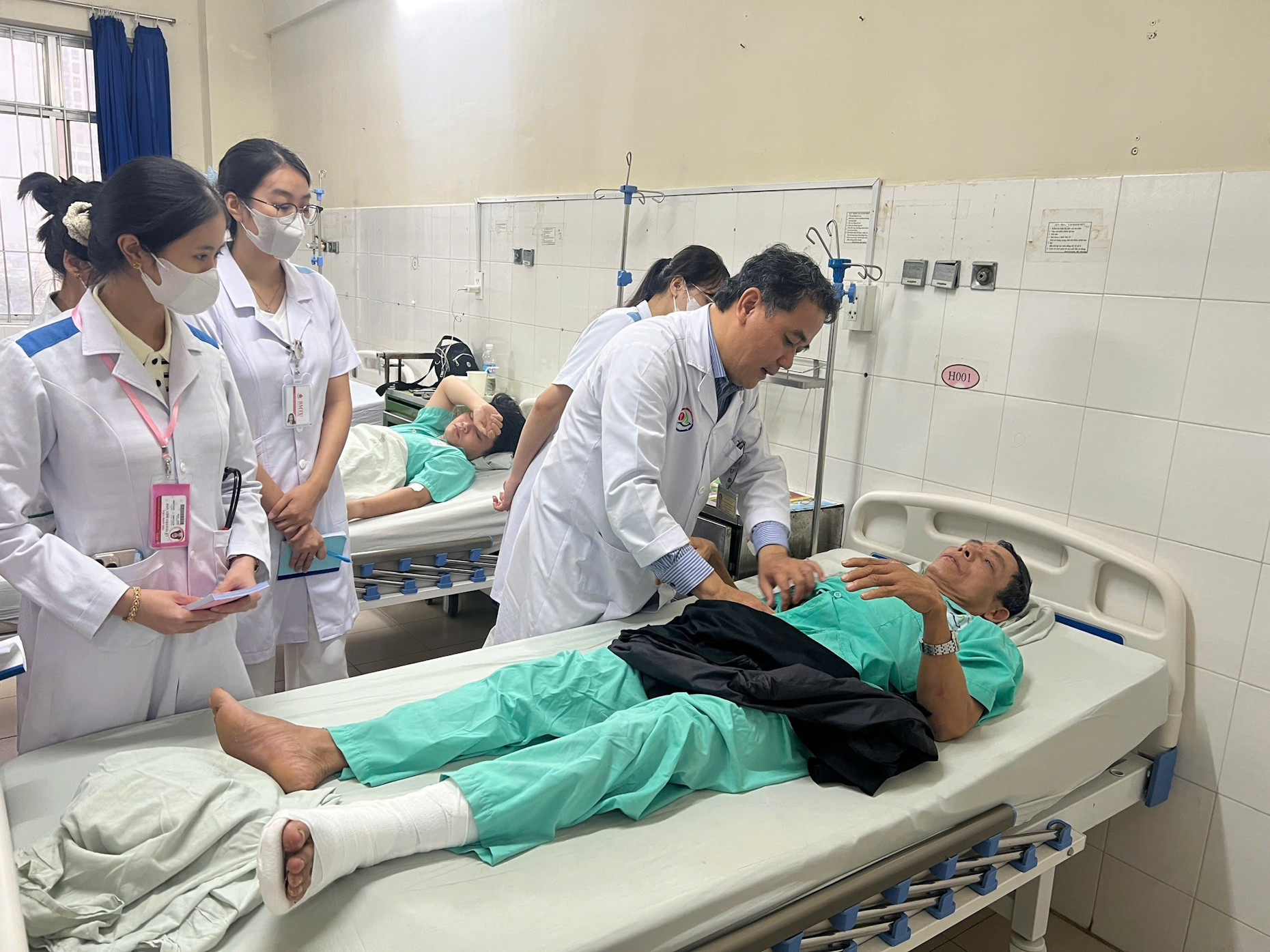 Bác sĩ kiểm tra sức khỏe các bệnh nhân bị thương trong vụ sạt lở đất đá đè ô tô khách trên đèo Khánh Lê. Ảnh: XN
