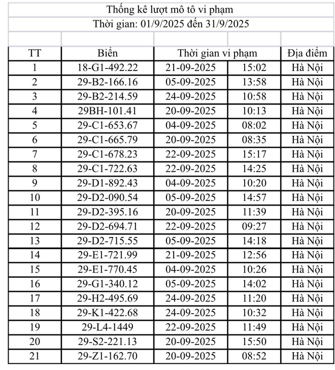Trong tháng 9/2025, Phòng Cảnh sát giao thông (Công an thành phố Hà Nội) ghi nhận 221 phương tiện vi phạm trật tự an toàn giao thông bị xử lý phạt nguội qua hệ thống camera giám sát. Các trường hợp này bao gồm cả ô tô và mô tô, tập trung chủ yếu tại các tuyến đường trung tâm có mật độ phương tiện cao.