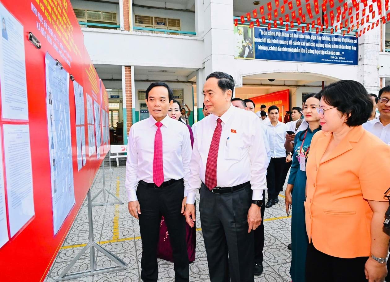 Chủ tịch Quốc hội Trần Thanh Mẫn và Bí thư Thành ủy TPHCM Trần Lưu Quang đến dự lễ khai mạc Ngày bầu cử ĐBQH khóa XVI và đại biểu HĐND các cấp nhiệm kỳ 2026-2031 tại khu vực bỏ phiếu số 14 (Trường THCS Đỗ Văn Dậy, xã Hóc Môn, TPHCM). Ảnh: Sài Gòn Giải Phóng