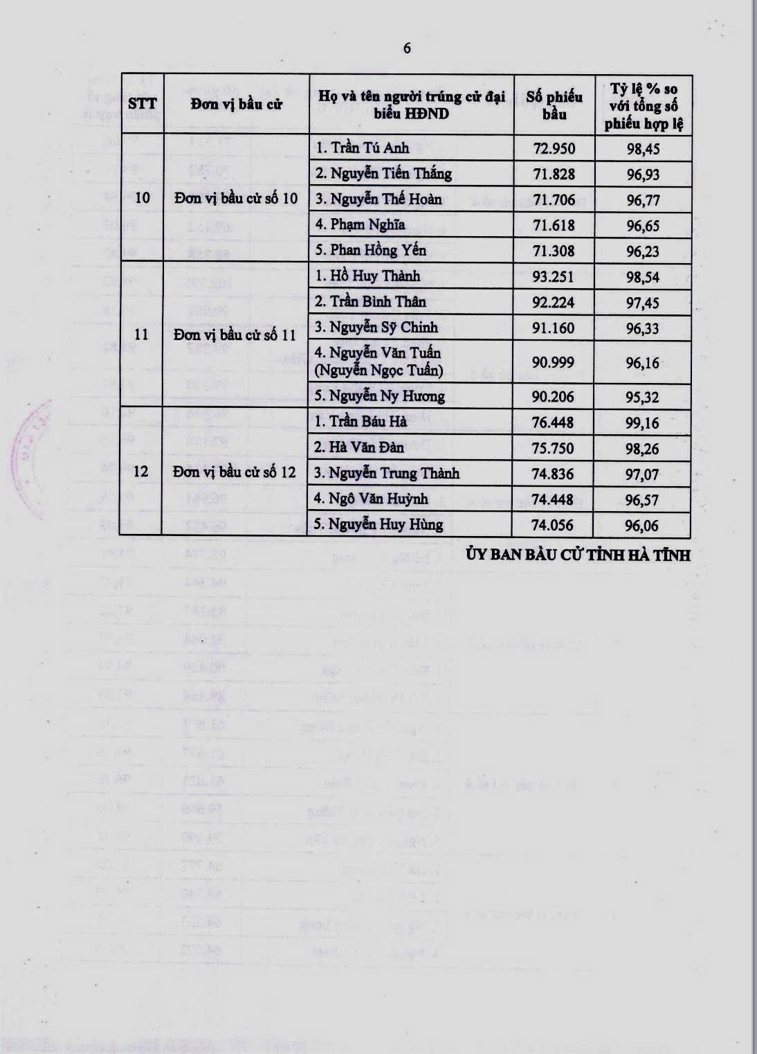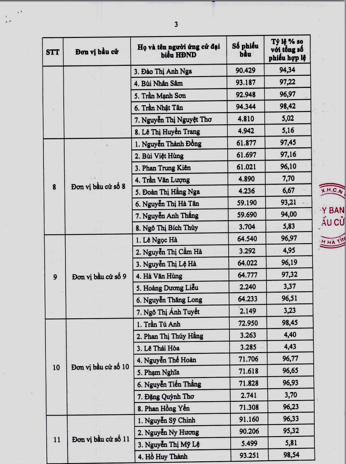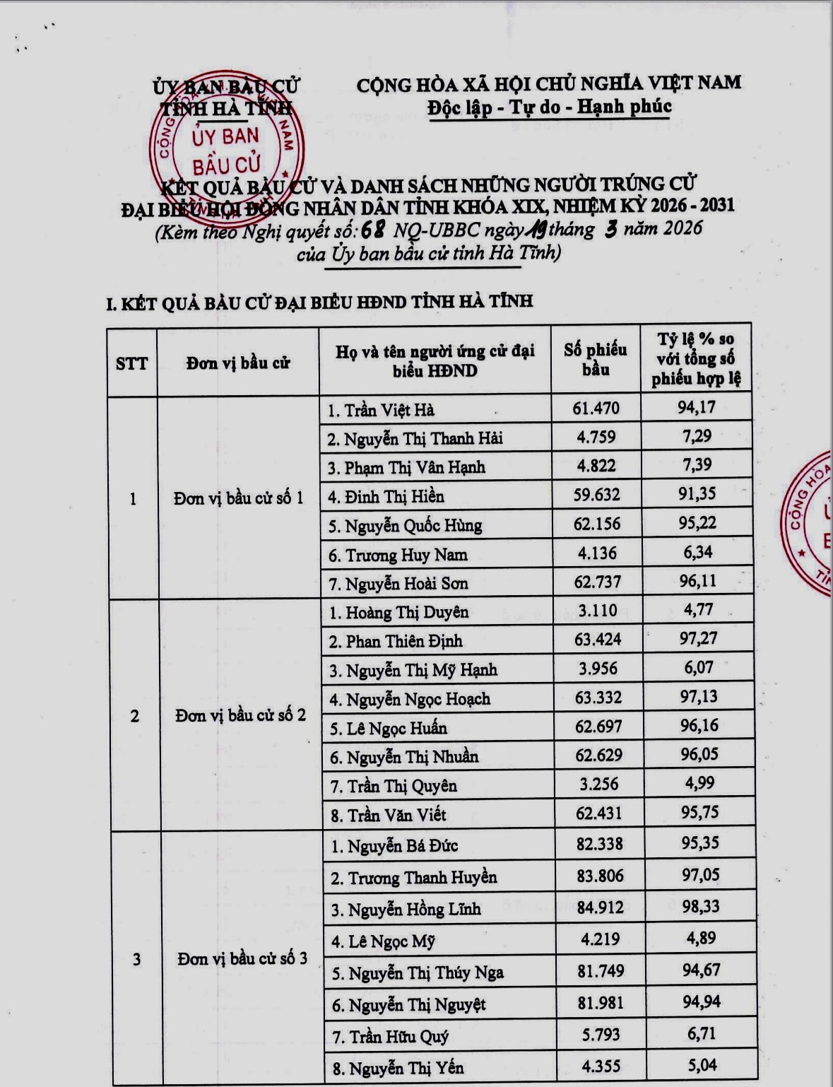 Theo đó, HĐND tỉnh Hà Tĩnh nhiệm kỳ 2026 - 2031 có 58 đại biểu, được bầu từ 94 ứng cử viên, với tỷ lệ phiếu bầu đạt cao, từ 91,35% đến 99,16%. Các đại biểu trúng cử bảo đảm tiêu chuẩn, điều kiện theo quy định, cơ cấu hợp lý về giới tính, độ tuổi, trình độ chuyên môn; đại diện cho các tầng lớp Nhân dân, dân tộc, tôn giáo trên địa bàn.