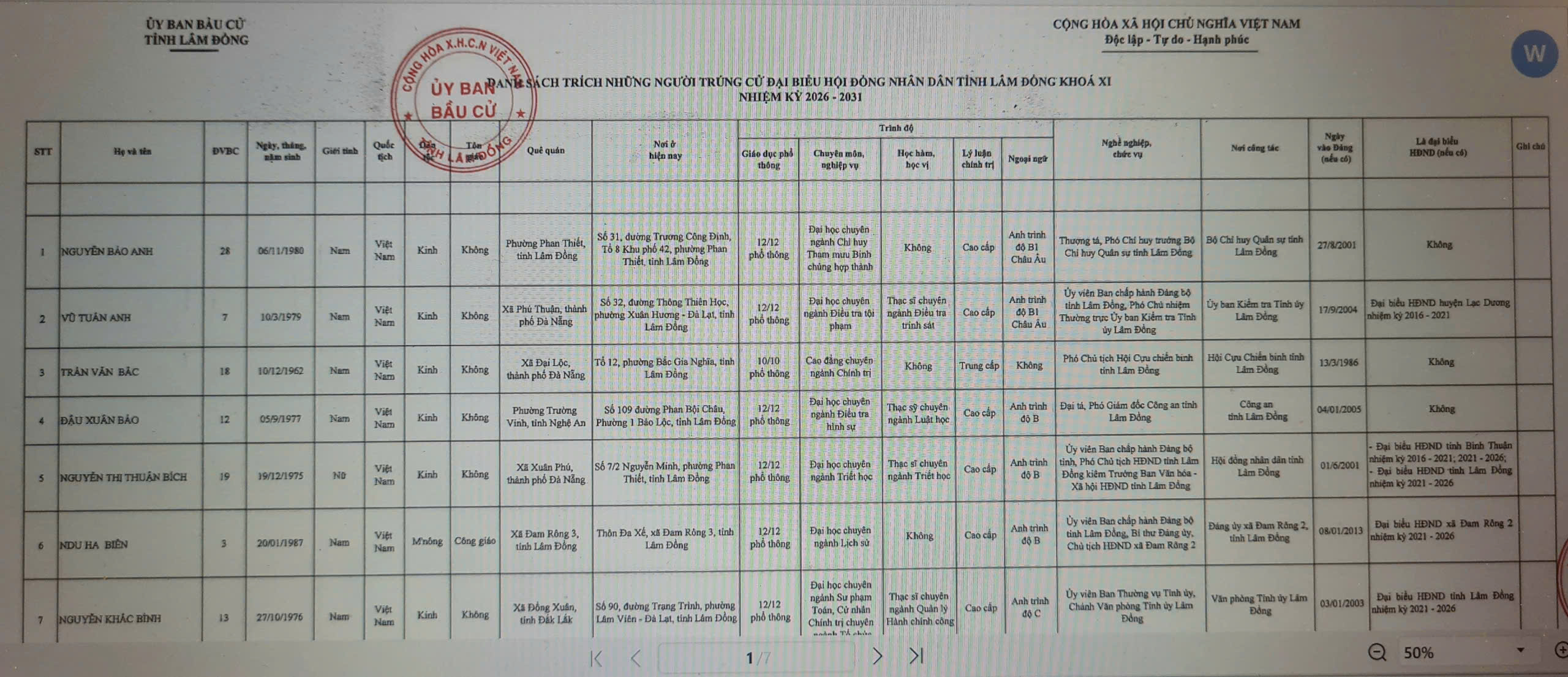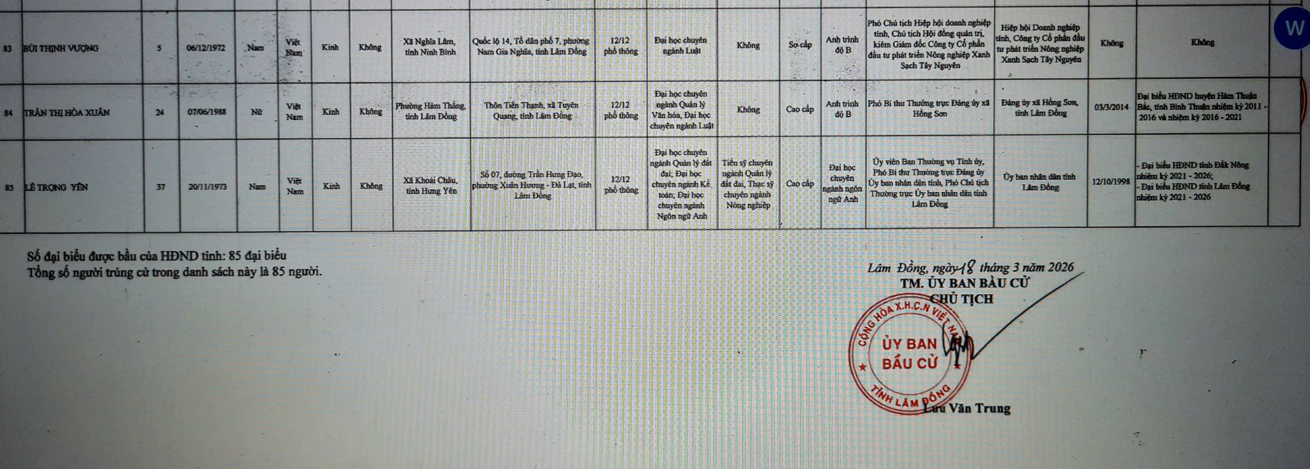 Ngày 19/3, Ủy ban Bầu cử tỉnh Lâm Đồng công bố kết quả bầu cử và danh sách những người trúng cử đại biểu HĐND tỉnh Lâm Đồng khóa XI, nhiệm kỳ 2026 - 2031.