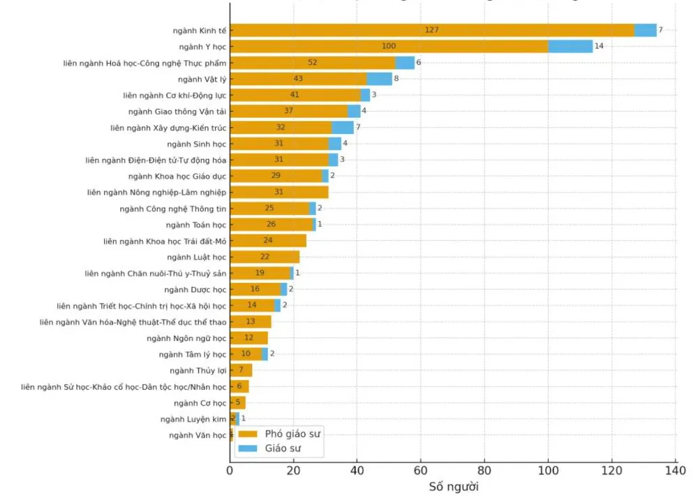 Kinh tế là ngành có nhiều ứng viên đạt chuẩn giáo sư, phó giáo sư nhất với 134 người, tiếp đến là y học với 114 người, liên ngành hóa học - công nghệ thực phẩm 58 người, ngành vật lý 51 người.