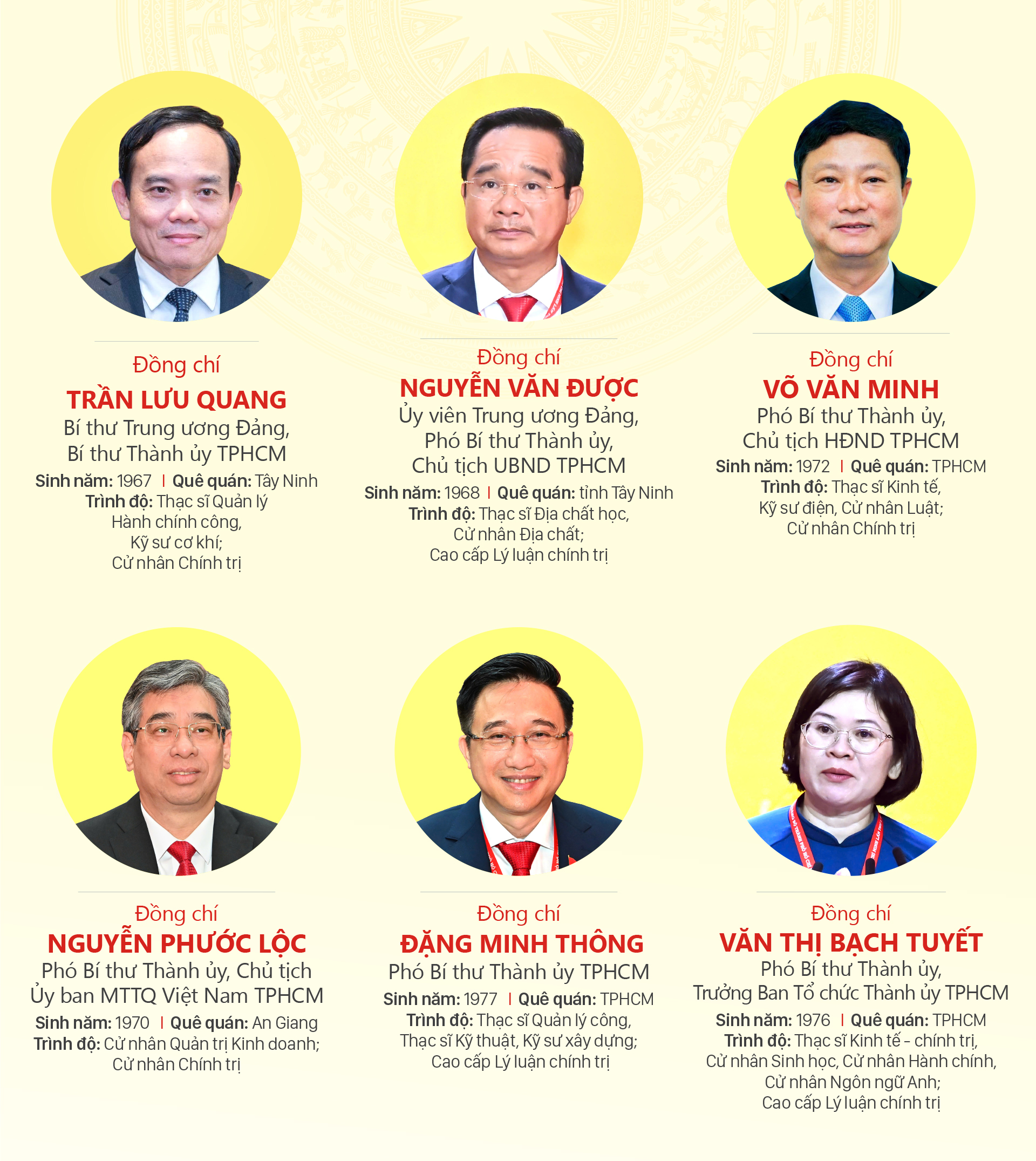 Các Phó Bí thư Thành ủy TPHCM nhiệm kỳ 2025-2030 gồm các đồng chí: Nguyễn Văn Được, Võ Văn Minh, Nguyễn Phước Lộc, Đặng Minh Thông, Văn Thị Bạch Tuyết.