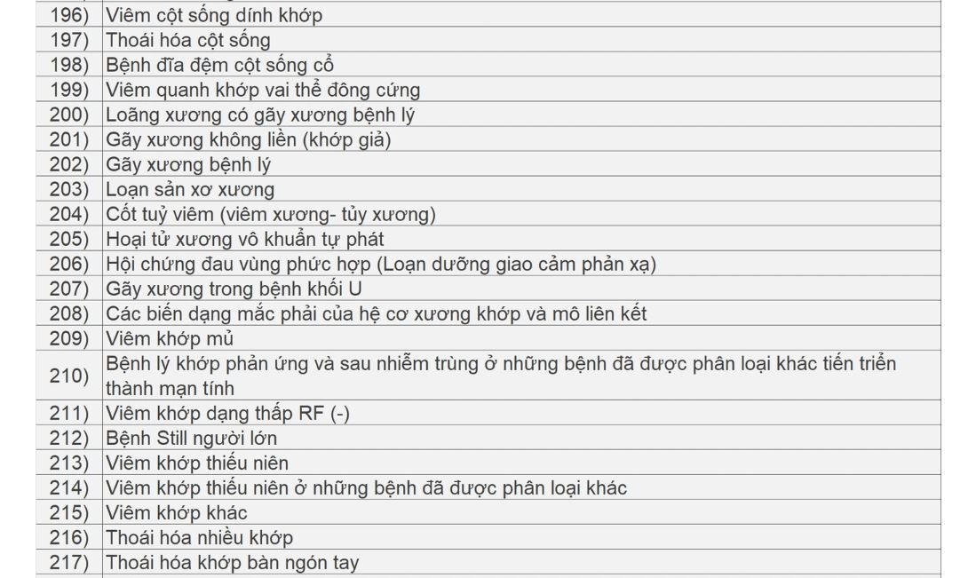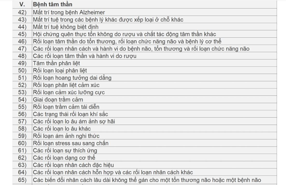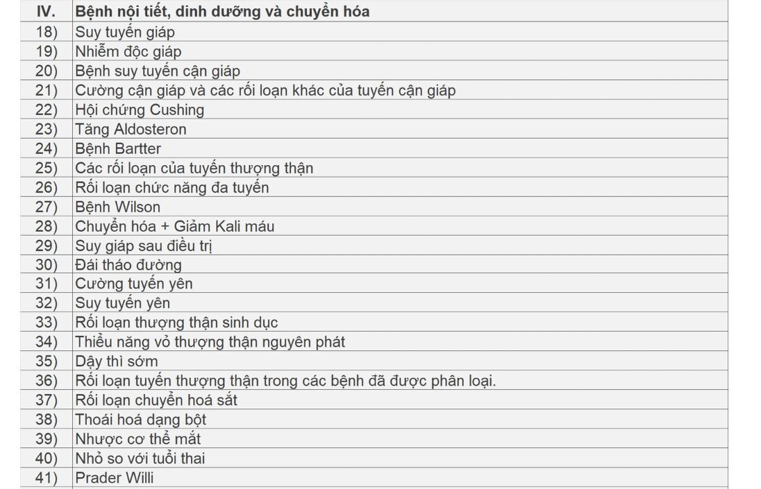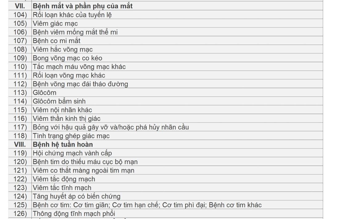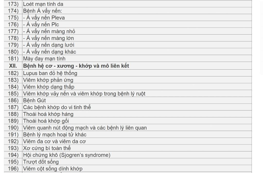 Danh mục gồm 16 nhóm bệnh lớn, với tổng cộng 252 bệnh và nhóm bệnh mạn tính. Trong đó nhiều bệnh phổ biến như tăng huyết áp, tiểu đường, COPD, hen phế quản, viêm gan B mạn tính, HIV/AIDS, Parkinson, Alzheimer, trầm cảm, rối loạn lo âu, tan máu bẩm sinh (Thalassemia), suy giáp, suy tuyến yên, sa sút trí tuệ và các bệnh phụ khoa ở tuổi vị thành niên như rong kinh tuổi dậy thì.