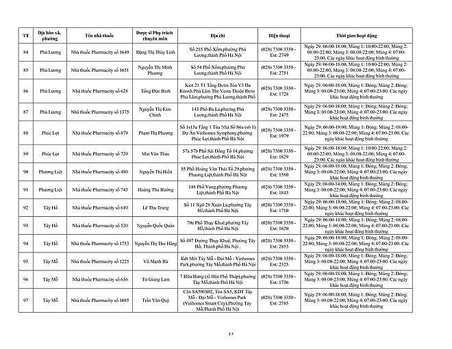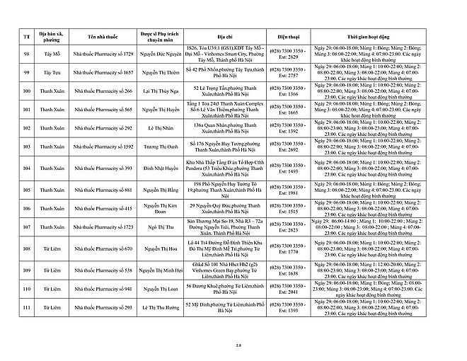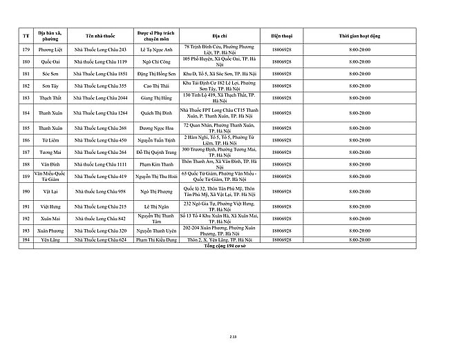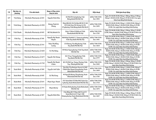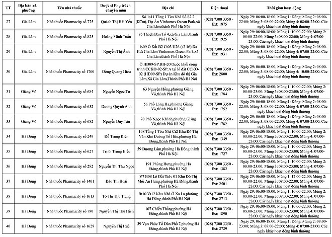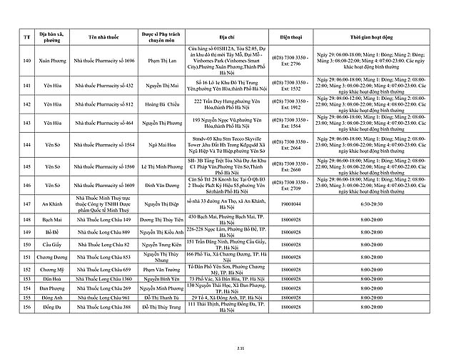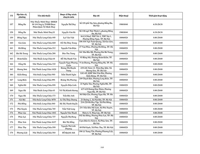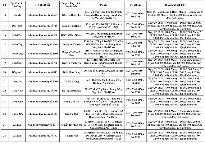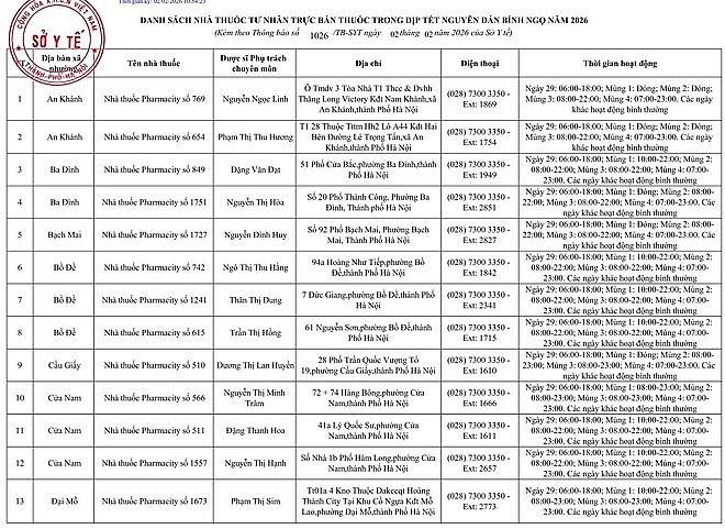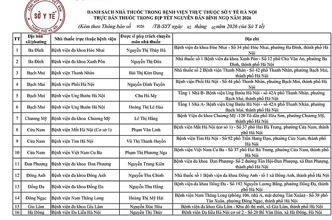 Theo đó, có 40 nhà thuốc trong bệnh viện trực thuộc Sở Y tế và 194 nhà thuốc tư nhân trên toàn thành phố trực bán thuốc trong dịp tết Nguyên đán Bính Ngọ 2026. Đồng thời, danh sách cũng thông báo cụ thể địa bàn xã/phường, tên nhà thuốc, dược sĩ phụ trách chuyên môn, địa chỉ, điện thoại, thời gian hoạt động của các nhà thuốc trực bán thuốc.