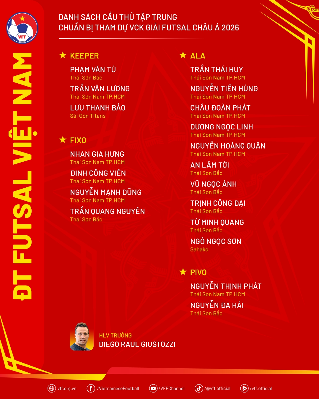 Đáng chú ý, Châu Đoàn Phát vừa được vinh danh với danh hiệu Quả bóng Vàng Futsal 2025, trong khi Từ Minh Quang và Nguyễn Đa Hải - chủ nhân Quả bóng bạc và Quả bóng đồng Futsal 2025 - cũng tiếp tục góp mặt trong đợt tập trung này.