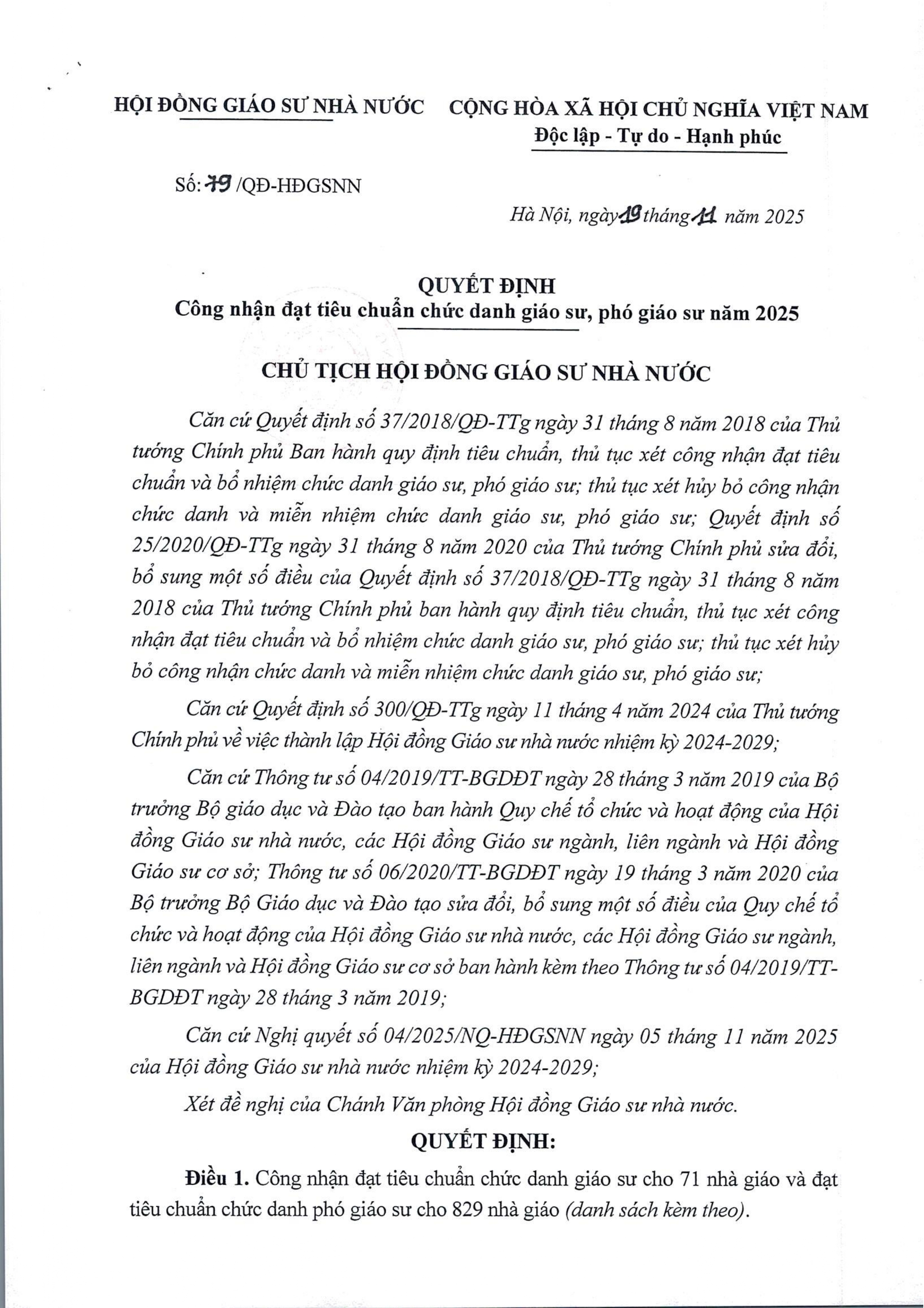 PGS.TS Dương Nghĩa Bang, Phó Chánh văn phòng Hội đồng Giáo sư nhà nước cho biết, Chủ tịch Hội đồng Giáo sư nhà nước Nguyễn Kim Sơn vừa ký Quyết định số 79/QĐ-HĐGSNN ngày 19/11/2025 công nhận đạt tiêu chuẩn chức danh giáo sư cho 71 nhà giáo và đạt tiêu chuẩn chức danh phó giáo sư cho 829 nhà giáo.
