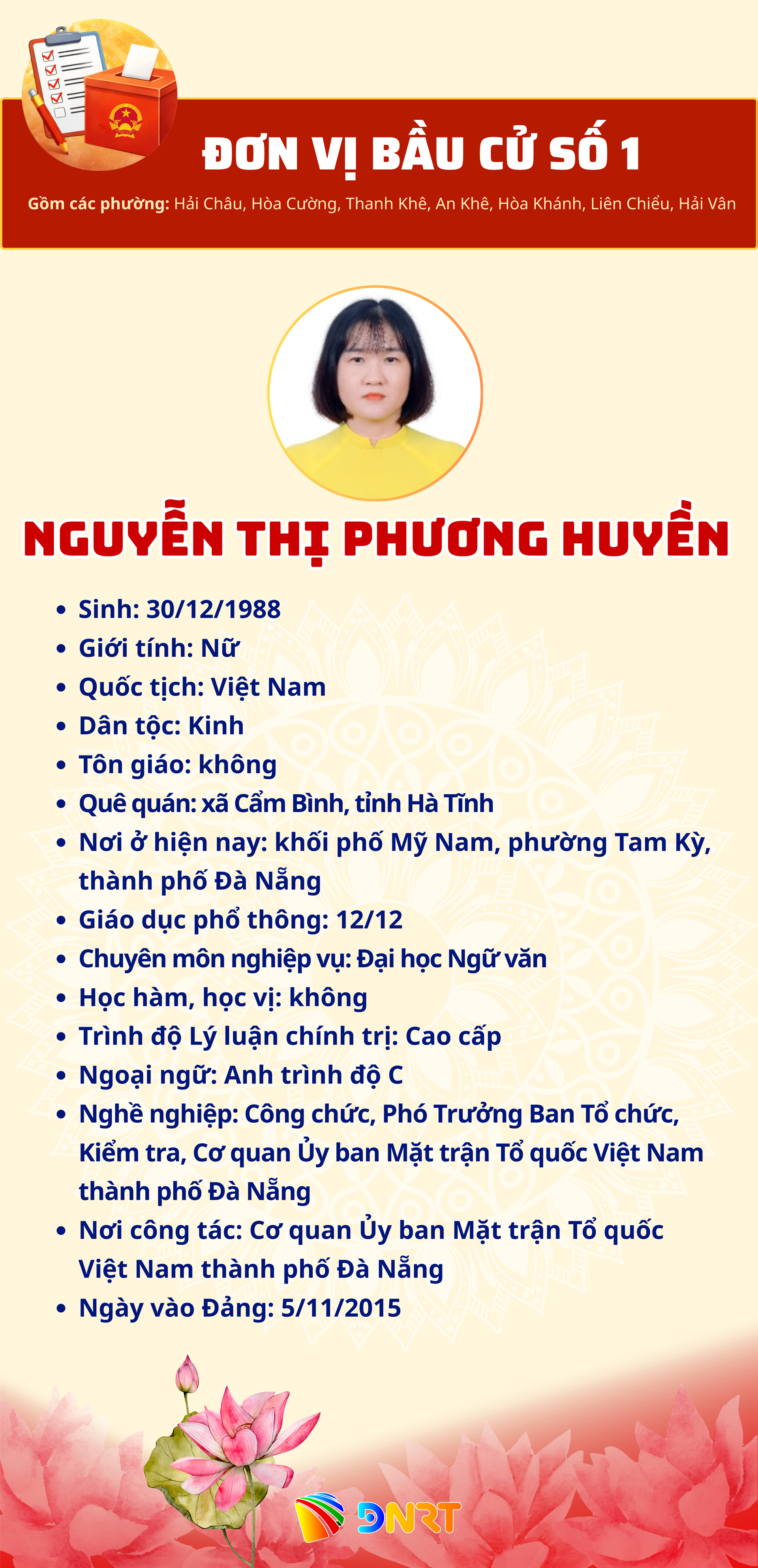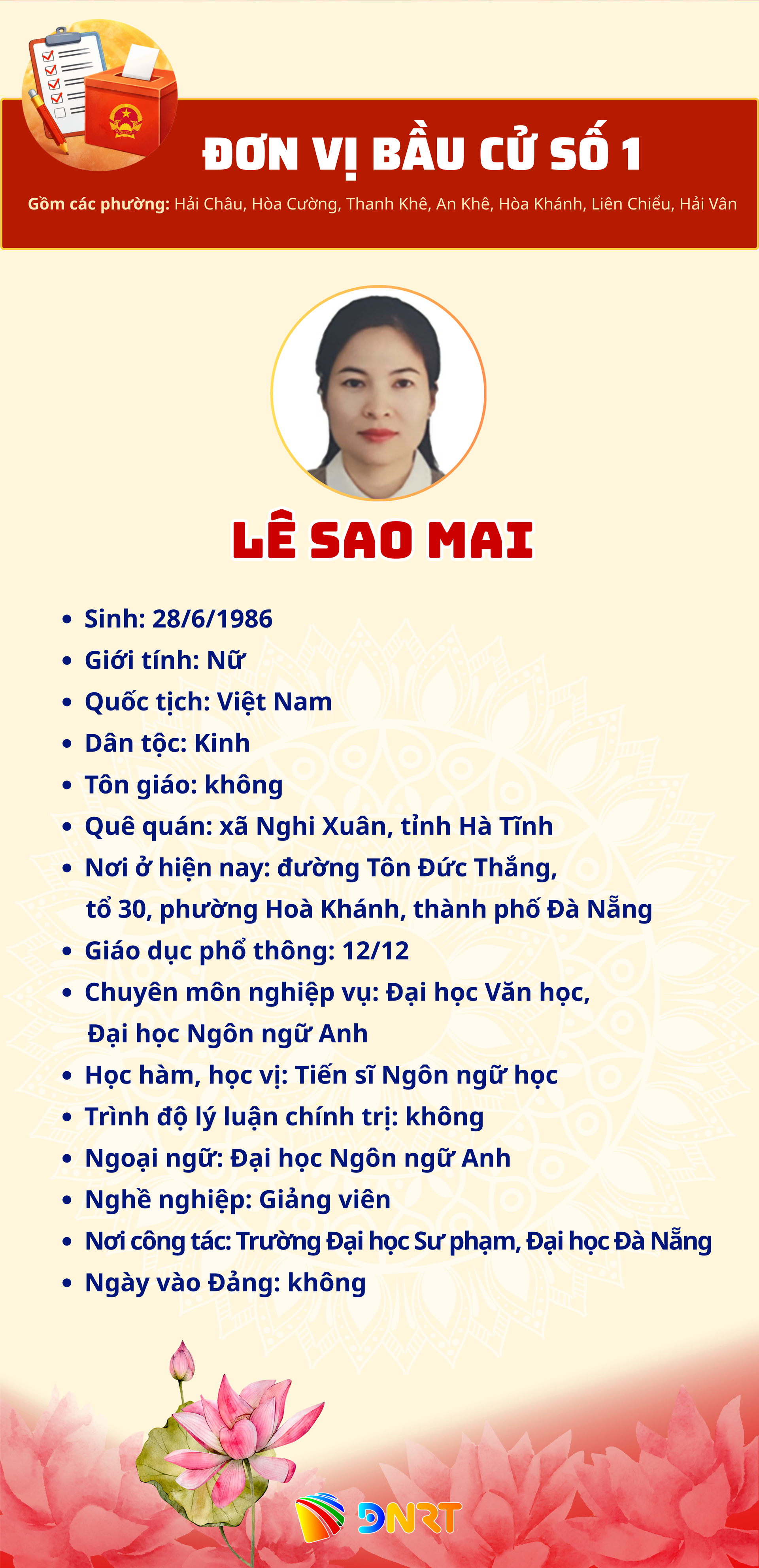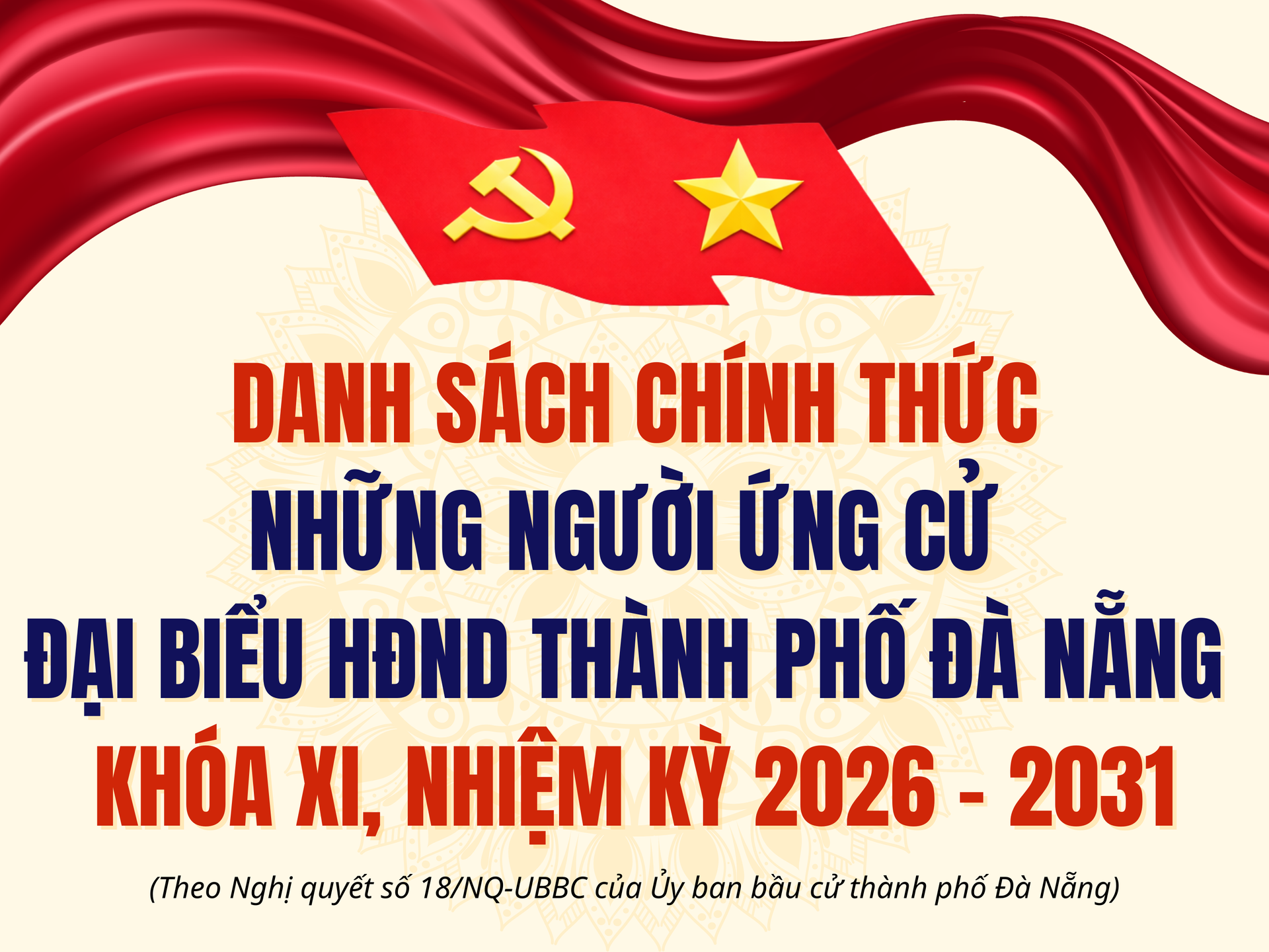 - DANH SÁCH NHỮNG NGƯỜI ỨNG CỬ ĐẠI BIỂU HĐND THÀNH PHỐ ĐÀ NẴNG KHÓA XI, NHIỆM KỲ 2026 - 2031 (Đơn vị bầu cử số 1)