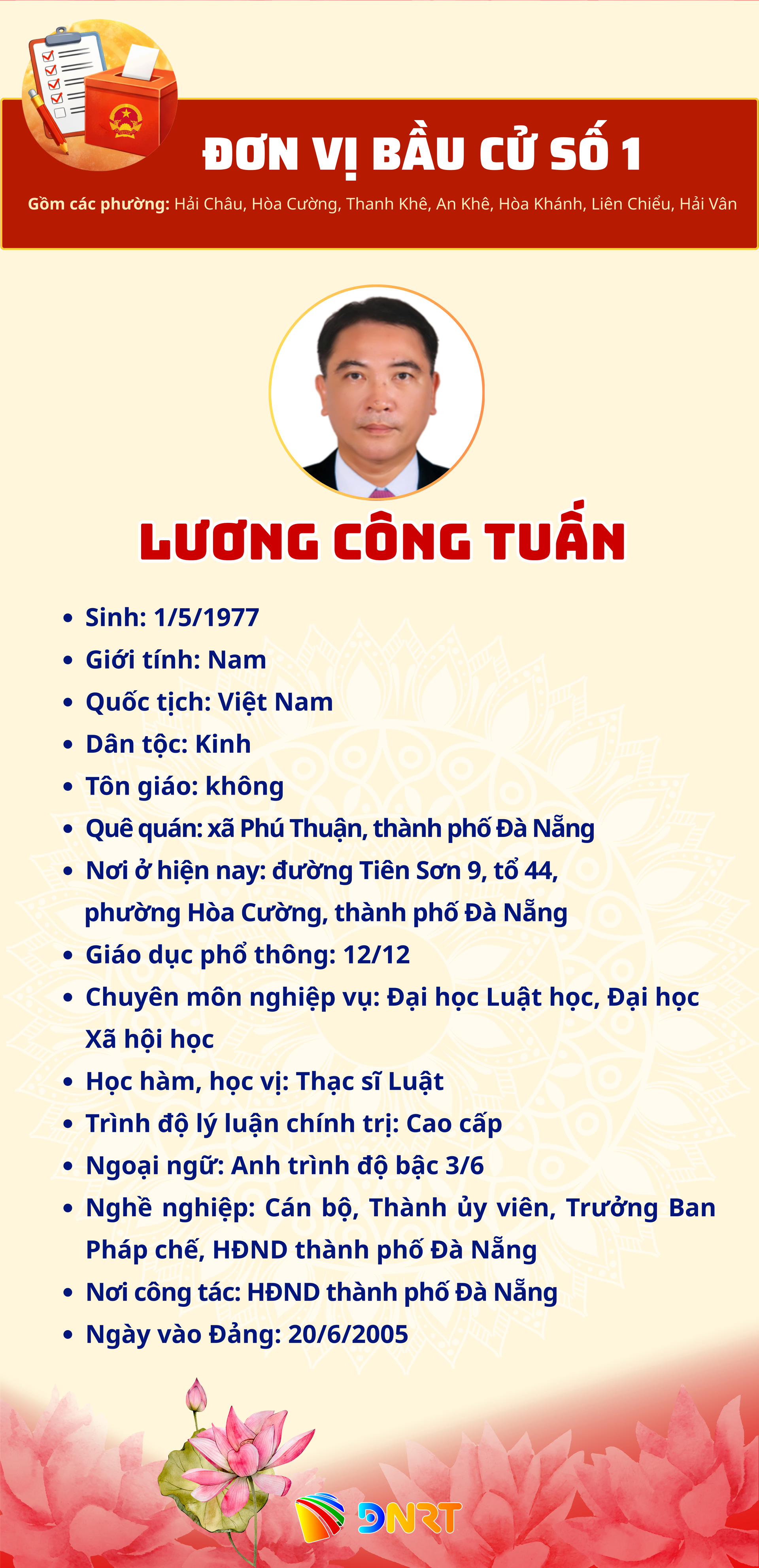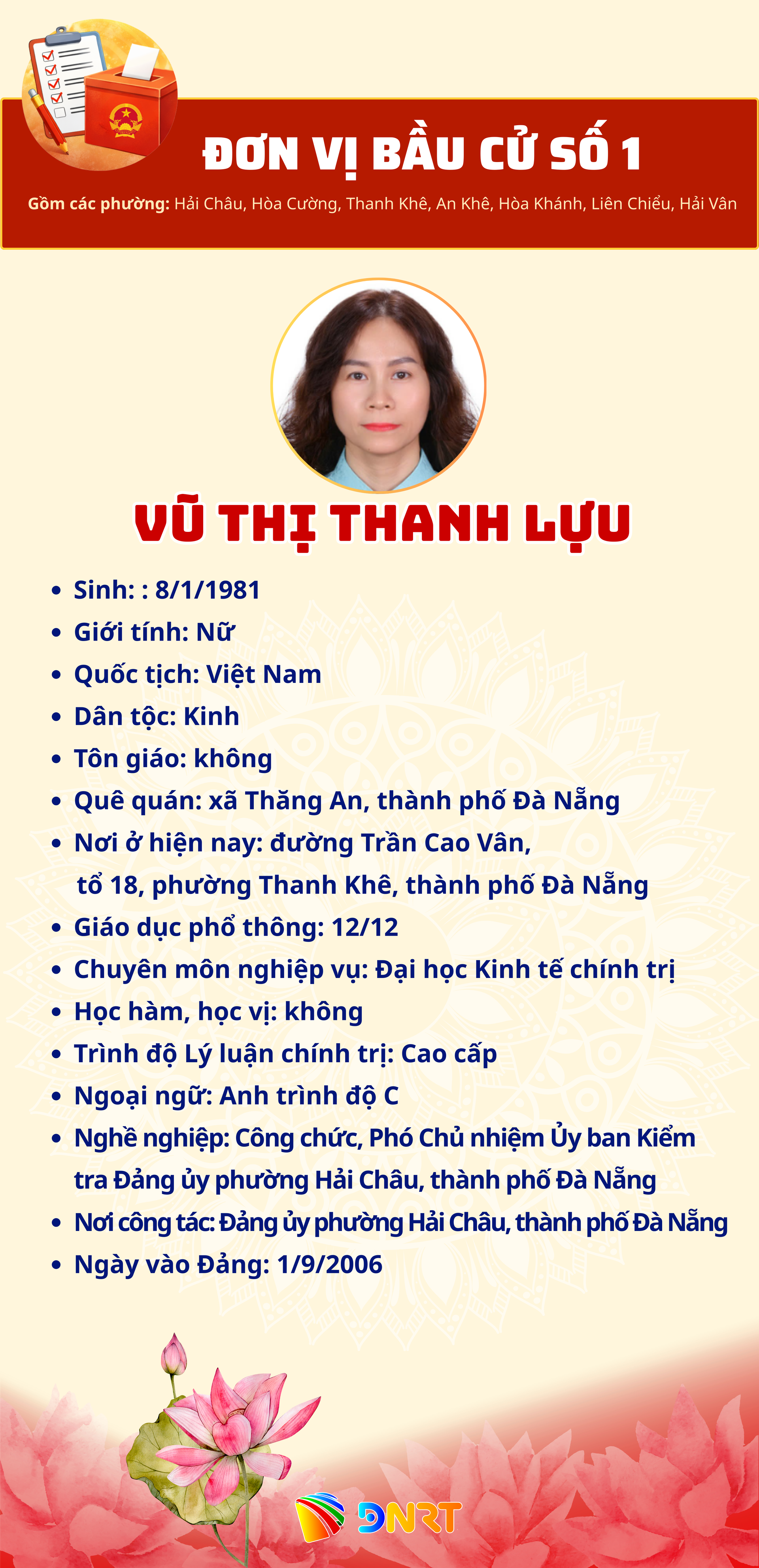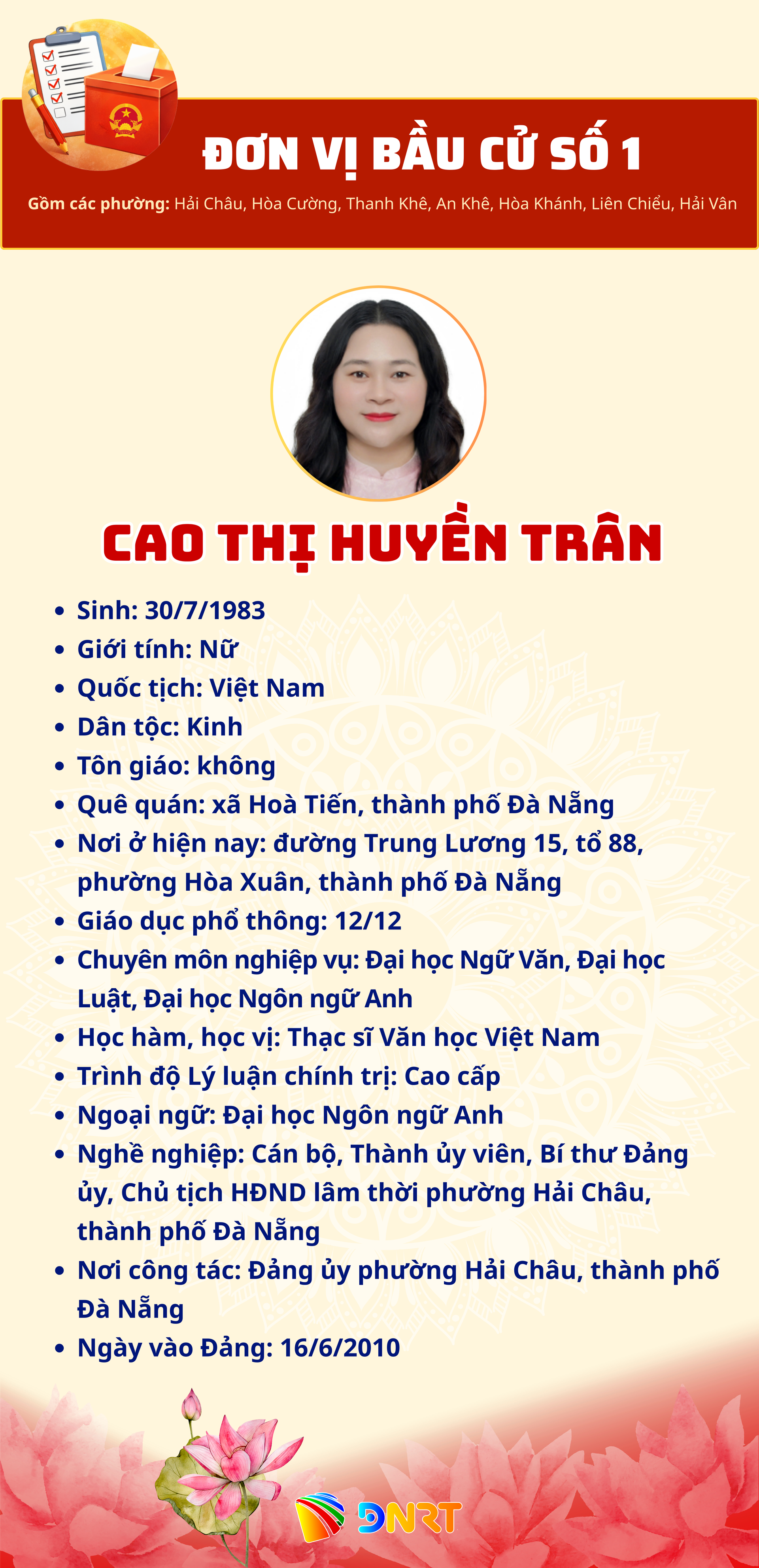 - DANH SÁCH NHỮNG NGƯỜI ỨNG CỬ ĐẠI BIỂU HĐND THÀNH PHỐ ĐÀ NẴNG KHÓA XI, NHIỆM KỲ 2026 - 2031 (Đơn vị bầu cử số 1)