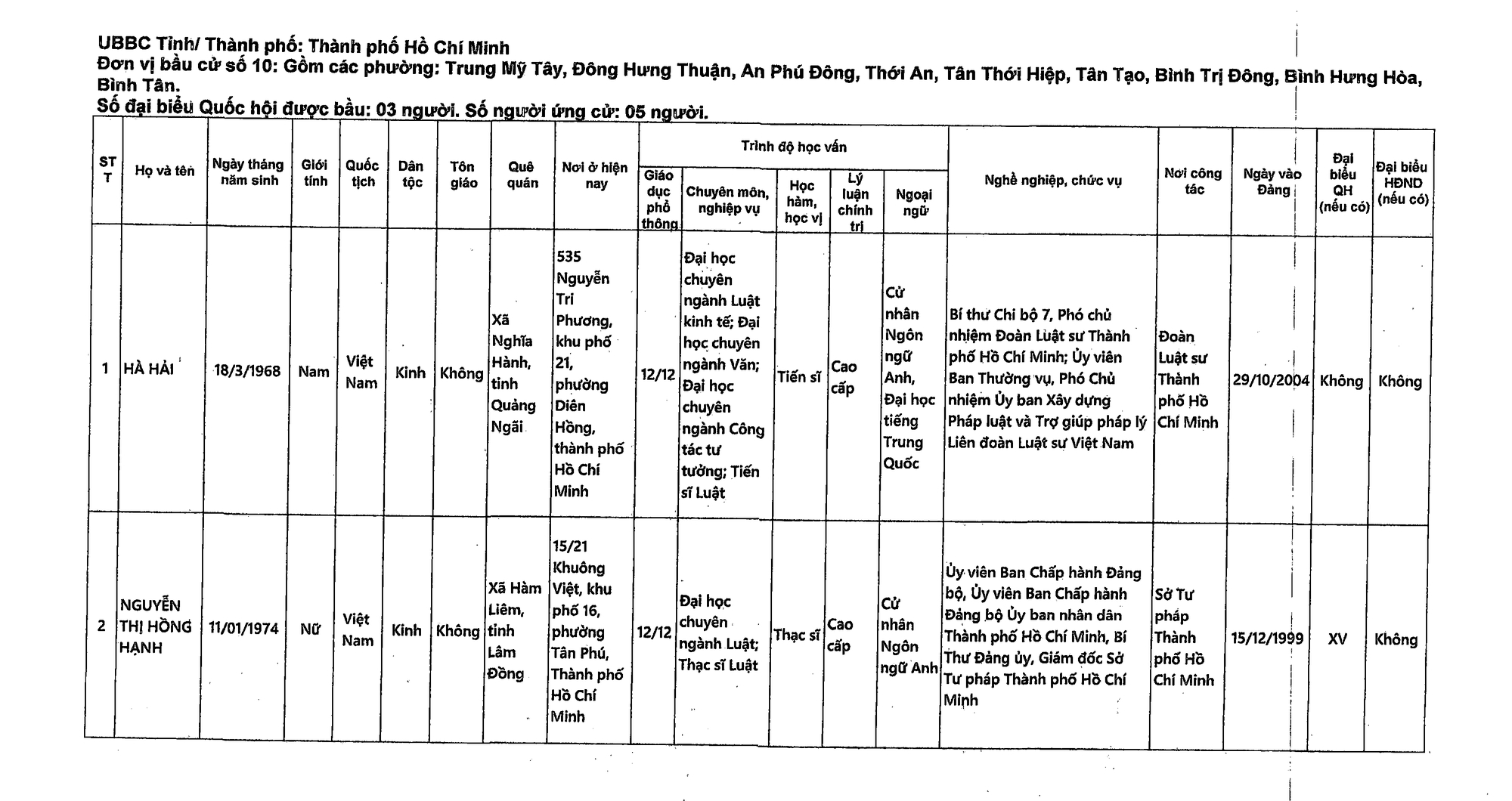 Đơn vị bầu cử số 10 gồm các phường: Trung Mỹ Tây, Đông Hưng Thuận, An Phú Đông, Thới An, Tân Thới Hiệp, Tân Tạo, Bình Trị Đông, Bình Hưng Hòa, Bình Tân