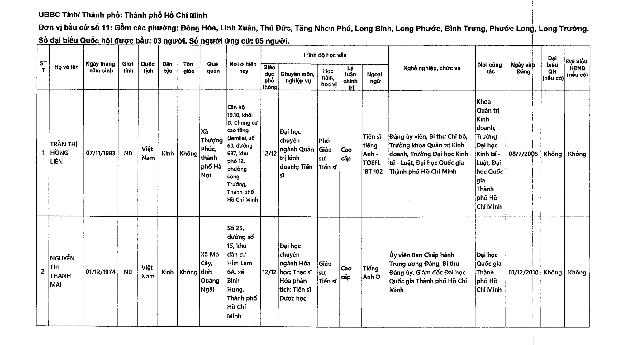 Đơn vị bầu cử số 11 gồm các phường: Đông Hòa, Linh Xuân, Thủ Đức, Tăng Nhơn Phú, Long Bình, Long Phước, Bình Trưng, Phước Long, Long Trường