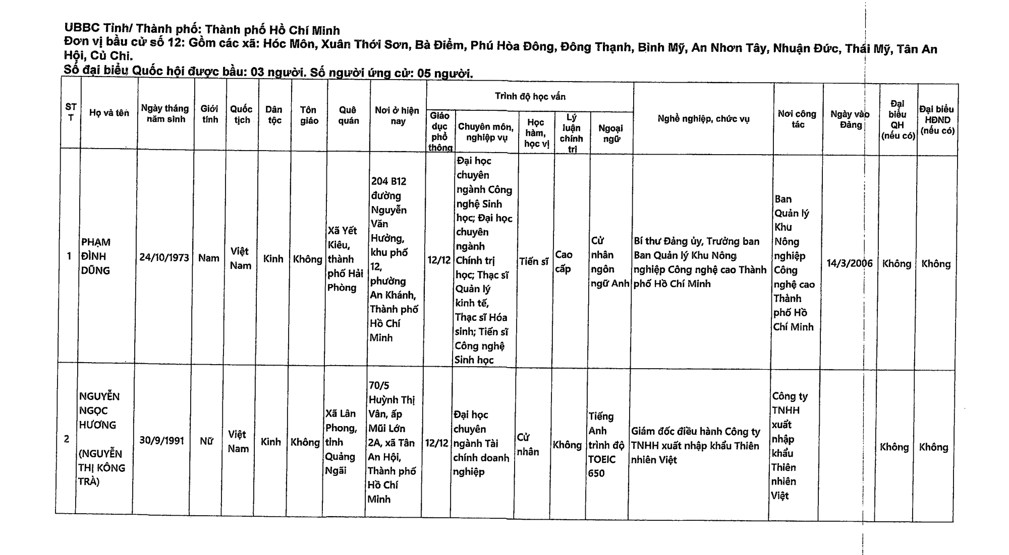 Đơn vị bầu cử số 12 gồm các xã: Hóc Môn, Xuân Thới Sơn, Bà Điểm, Phú Hòa Đông, Đông Thạnh, Bình Mỹ, An Nhơn Tây, Nhuận Đức, Thái Mỹ, Tân An Hội, Củ Chi