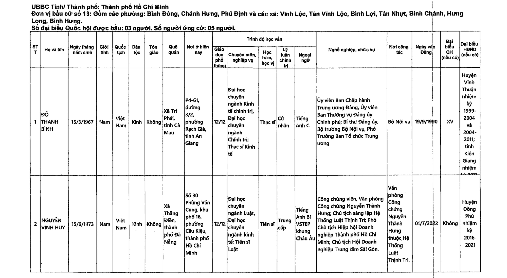 Đơn vị bầu cử số 13 gồm các phường: Bình Đông, Chánh Hưng, Phú Định và các xã: Vĩnh Lộc, Tân Vĩnh Lộc, Bình Lợi, Tân Nhựt, Bình Chánh, Hưng Long, Bình Hưng