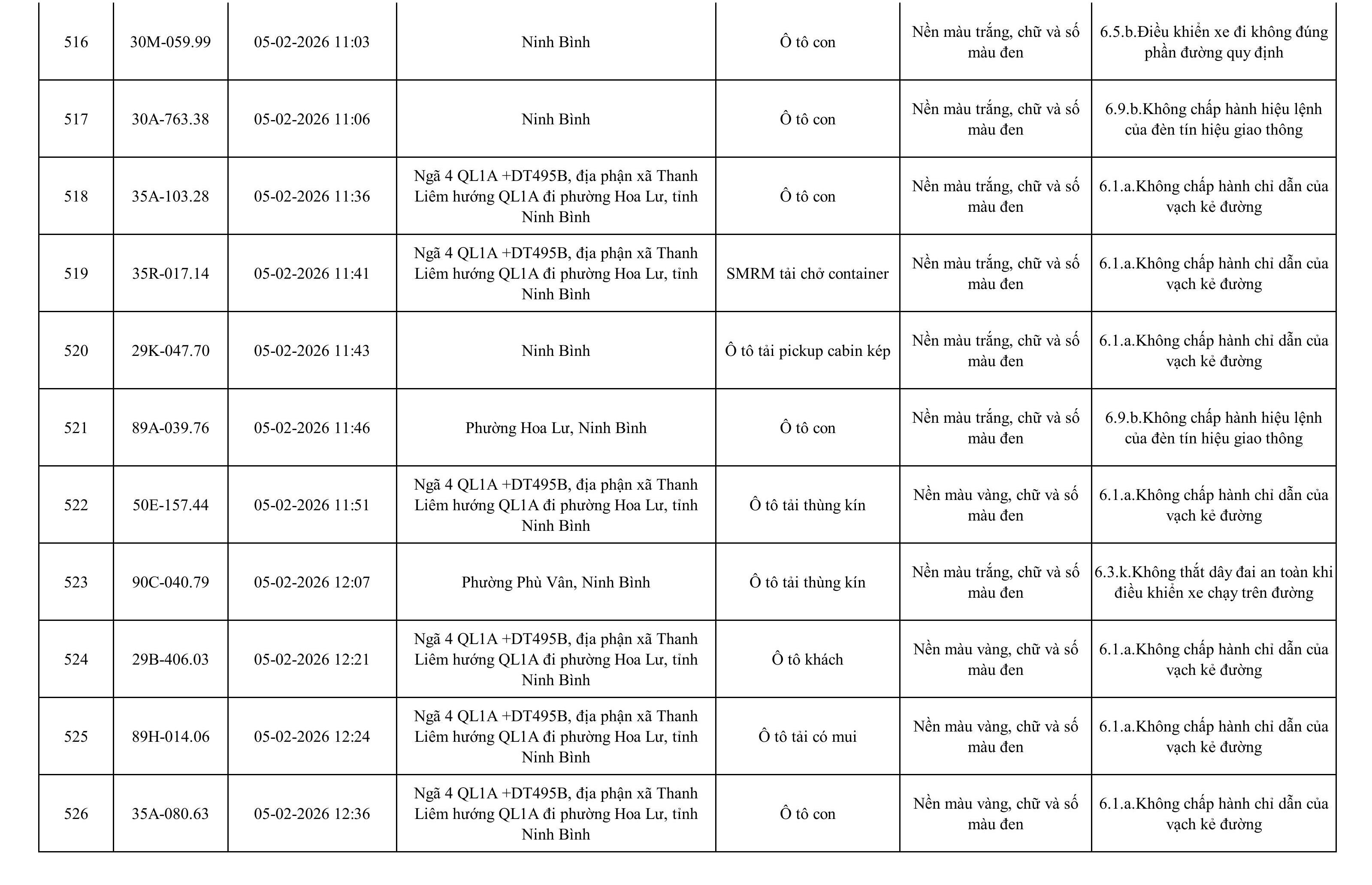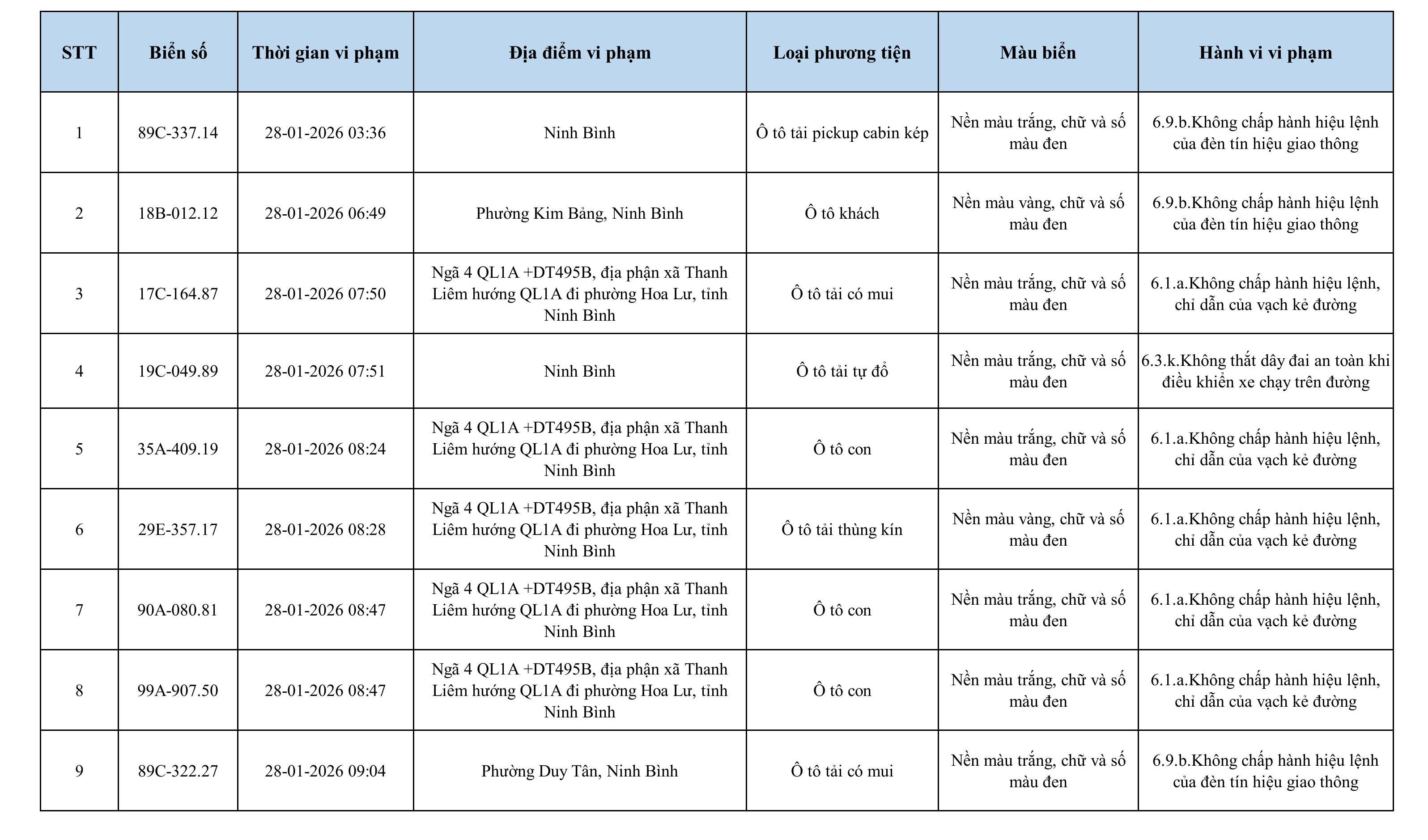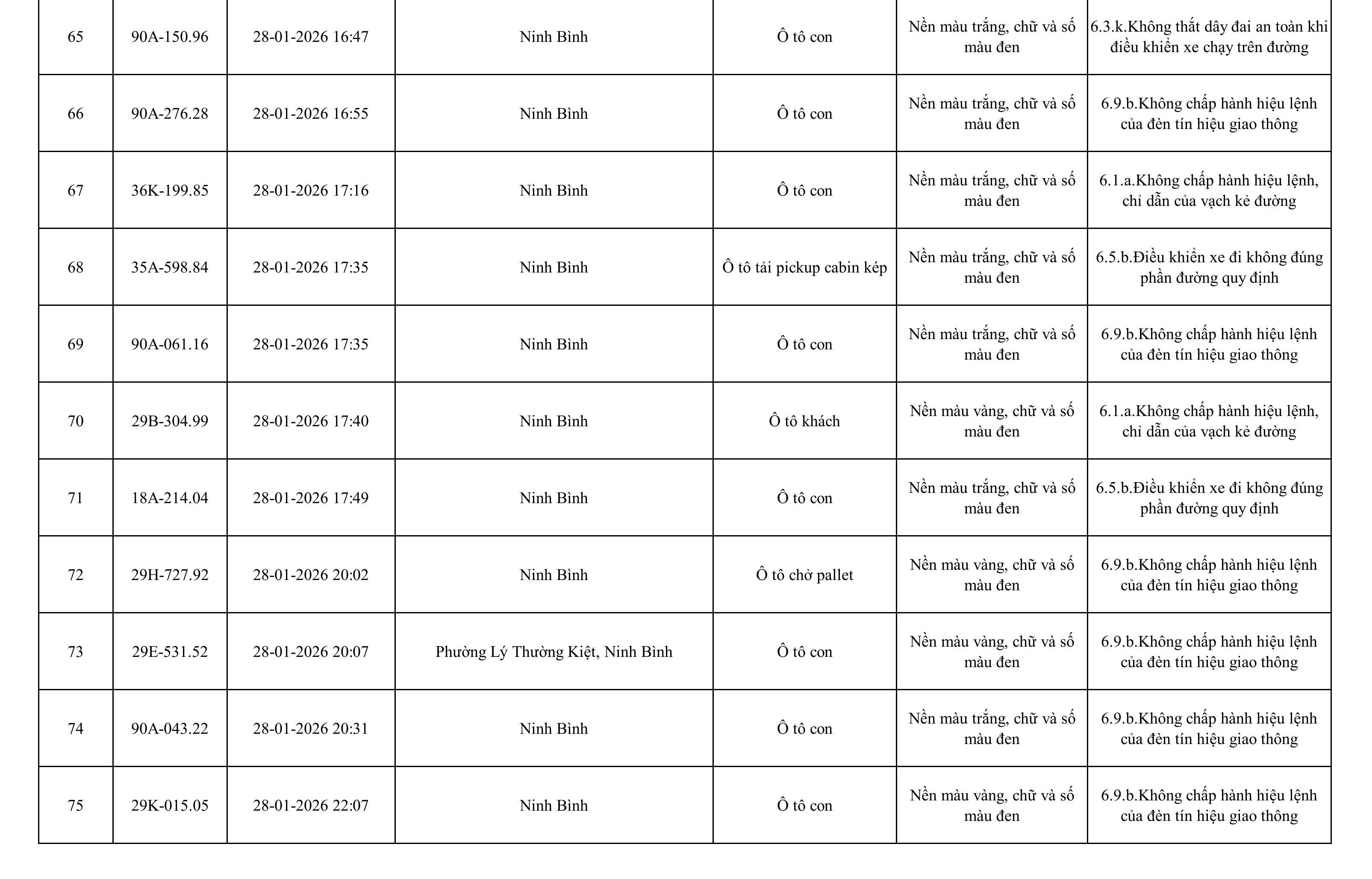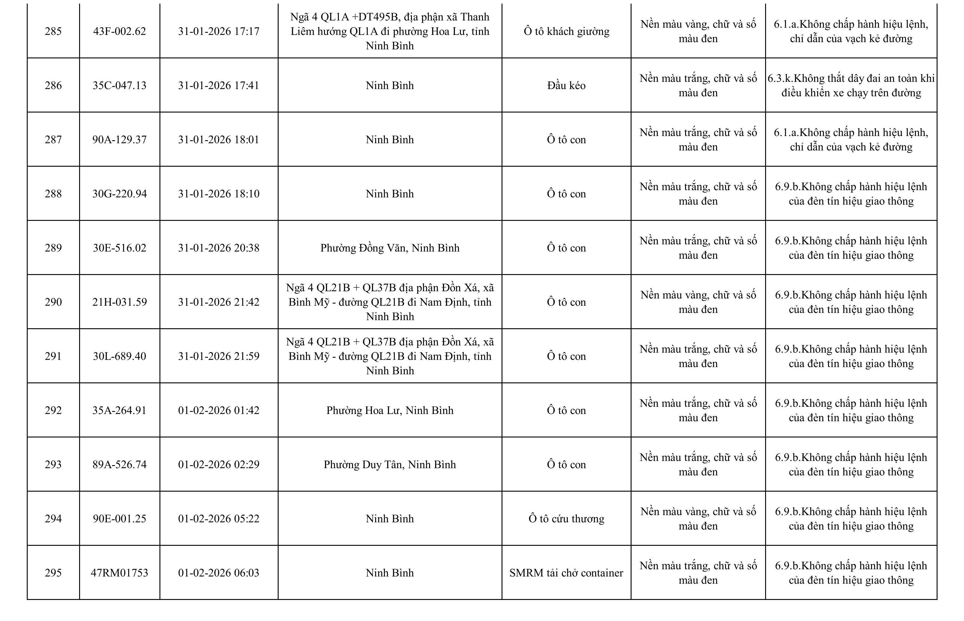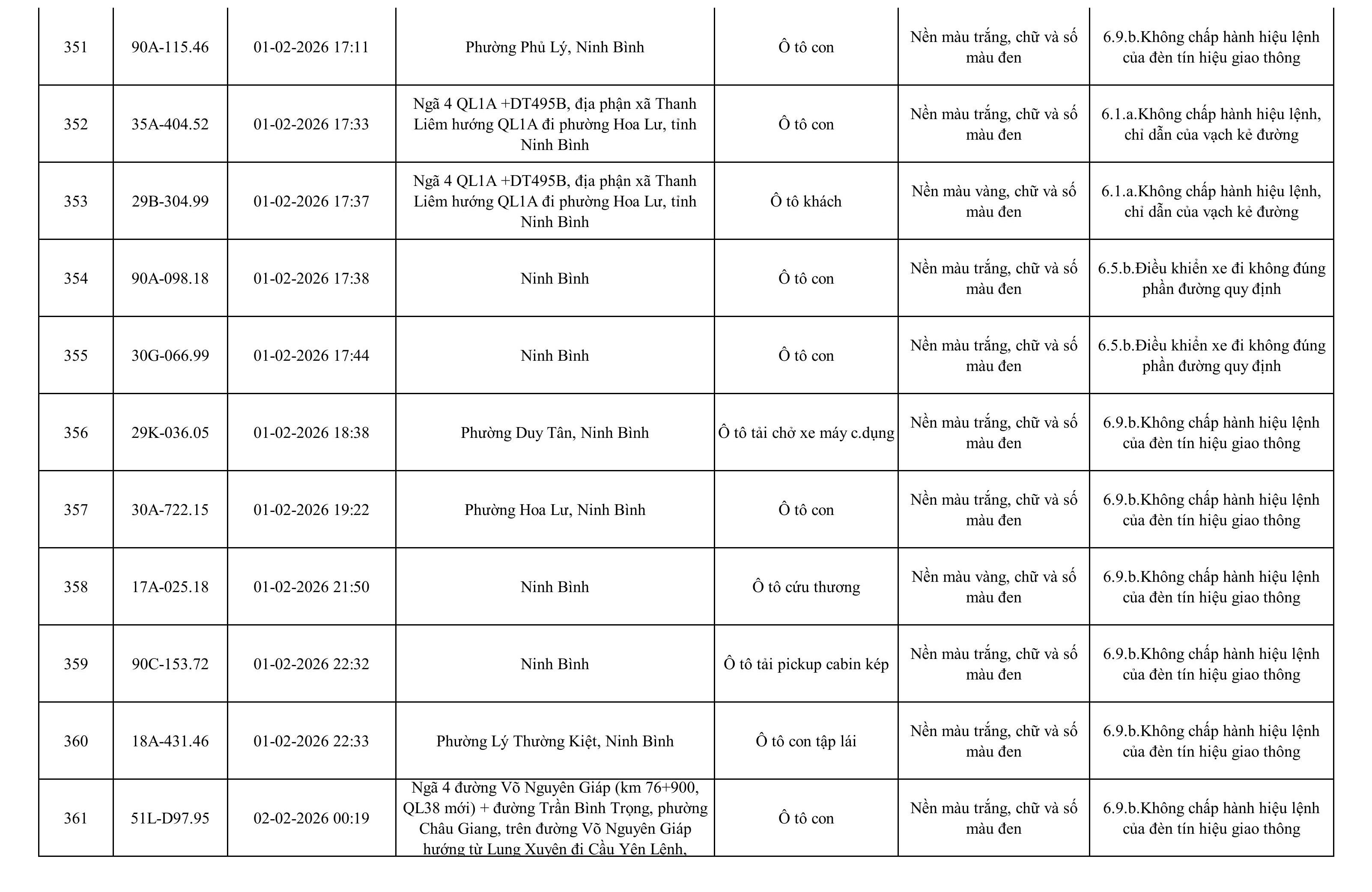 Danh sách phương tiện vi phạm được phát hiện qua hệ thống giám sát và thiết bị nghiệp vụ của Công an tỉnh Ninh Bình từ ngày 28/1/2026 đến ngày 5/2/2026.