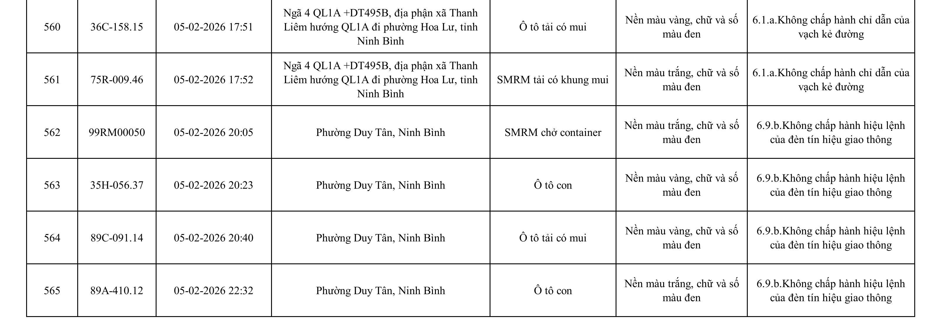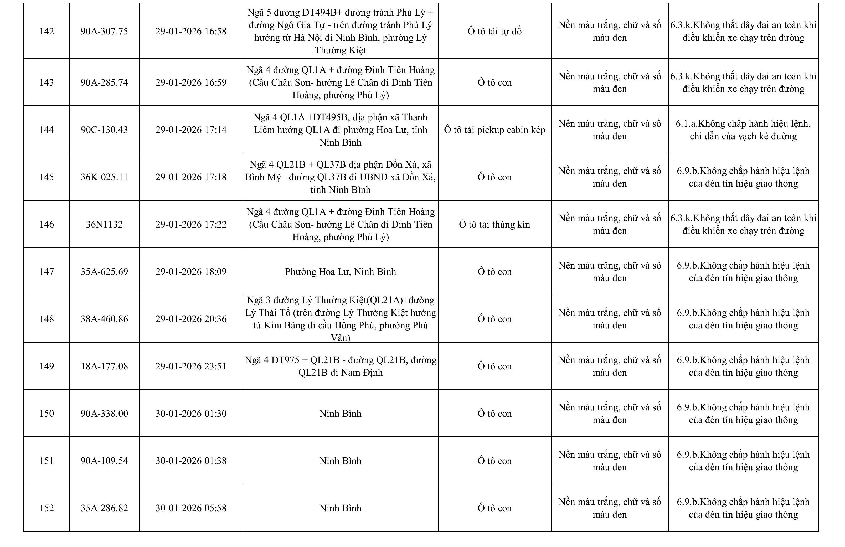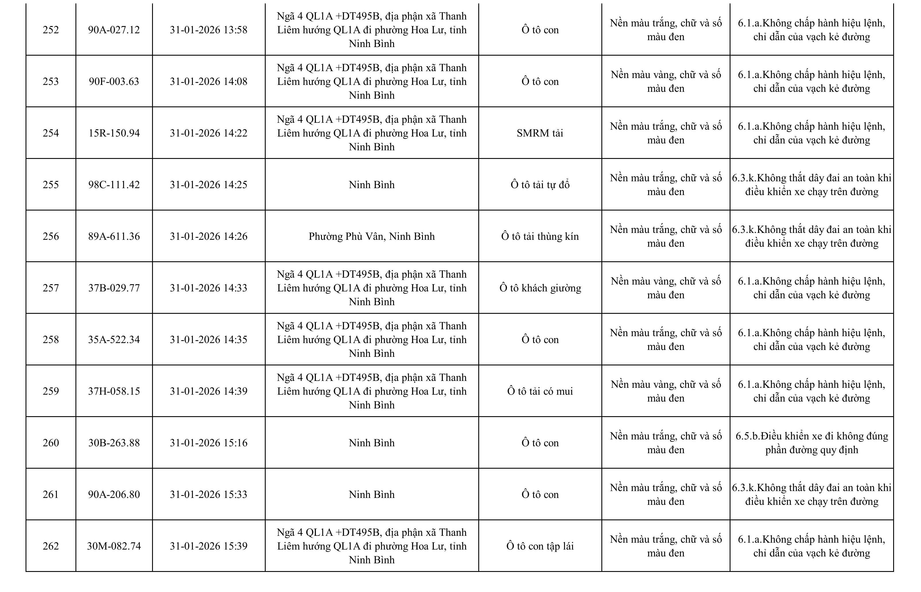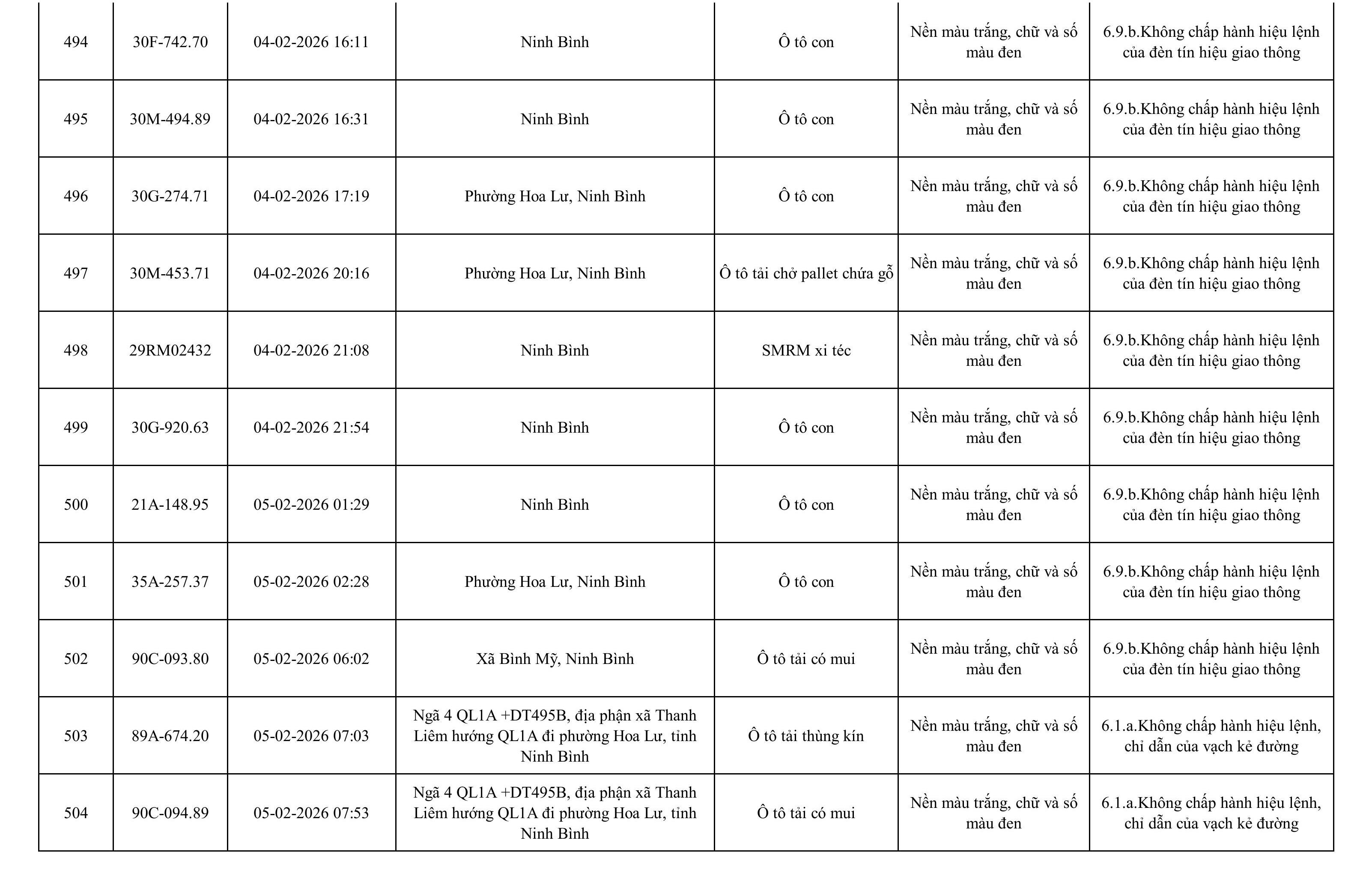 Danh sách phương tiện vi phạm được phát hiện qua hệ thống giám sát và thiết bị nghiệp vụ của Công an tỉnh Ninh Bình từ ngày 28/1/2026 đến ngày 5/2/2026.