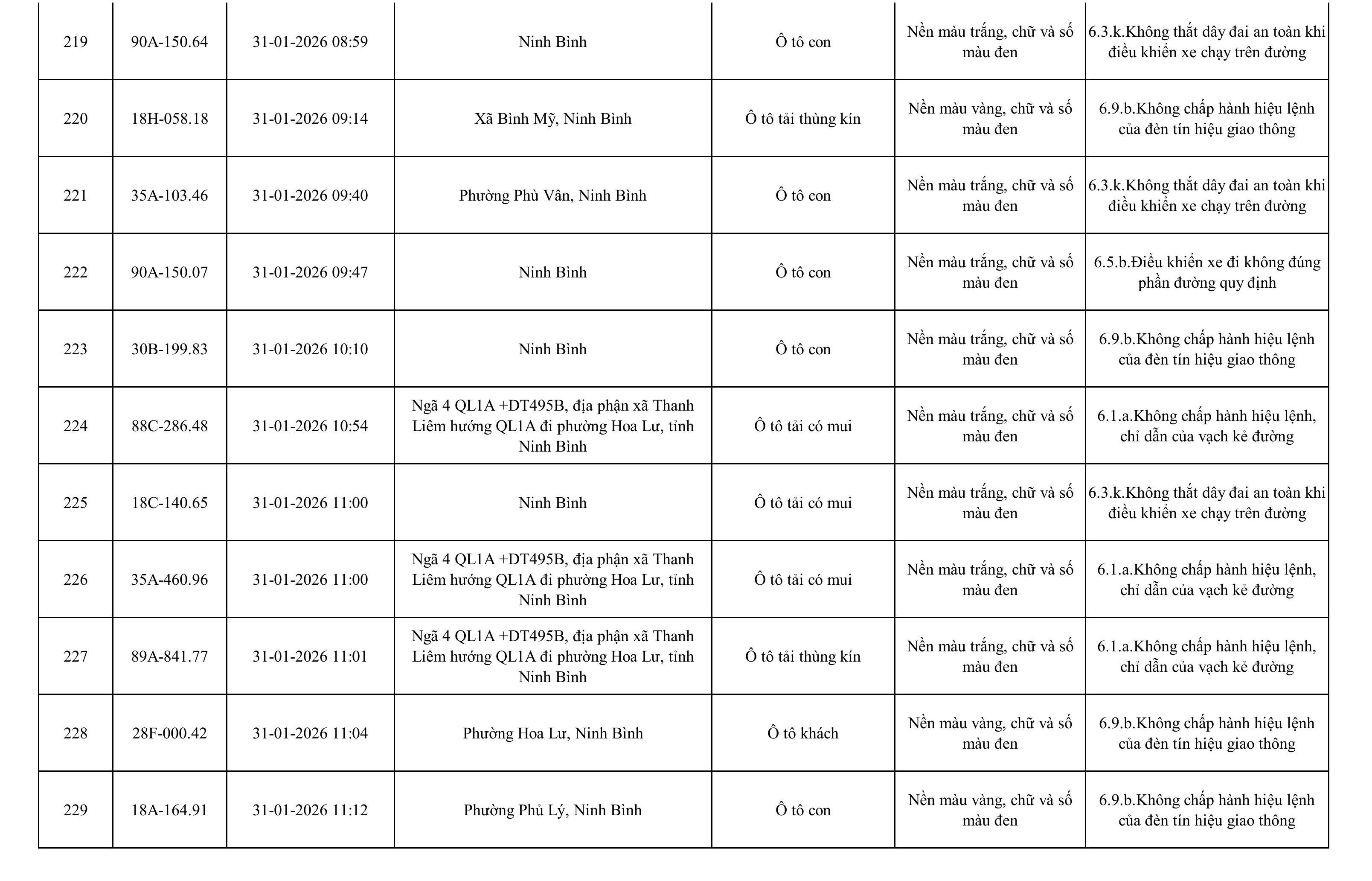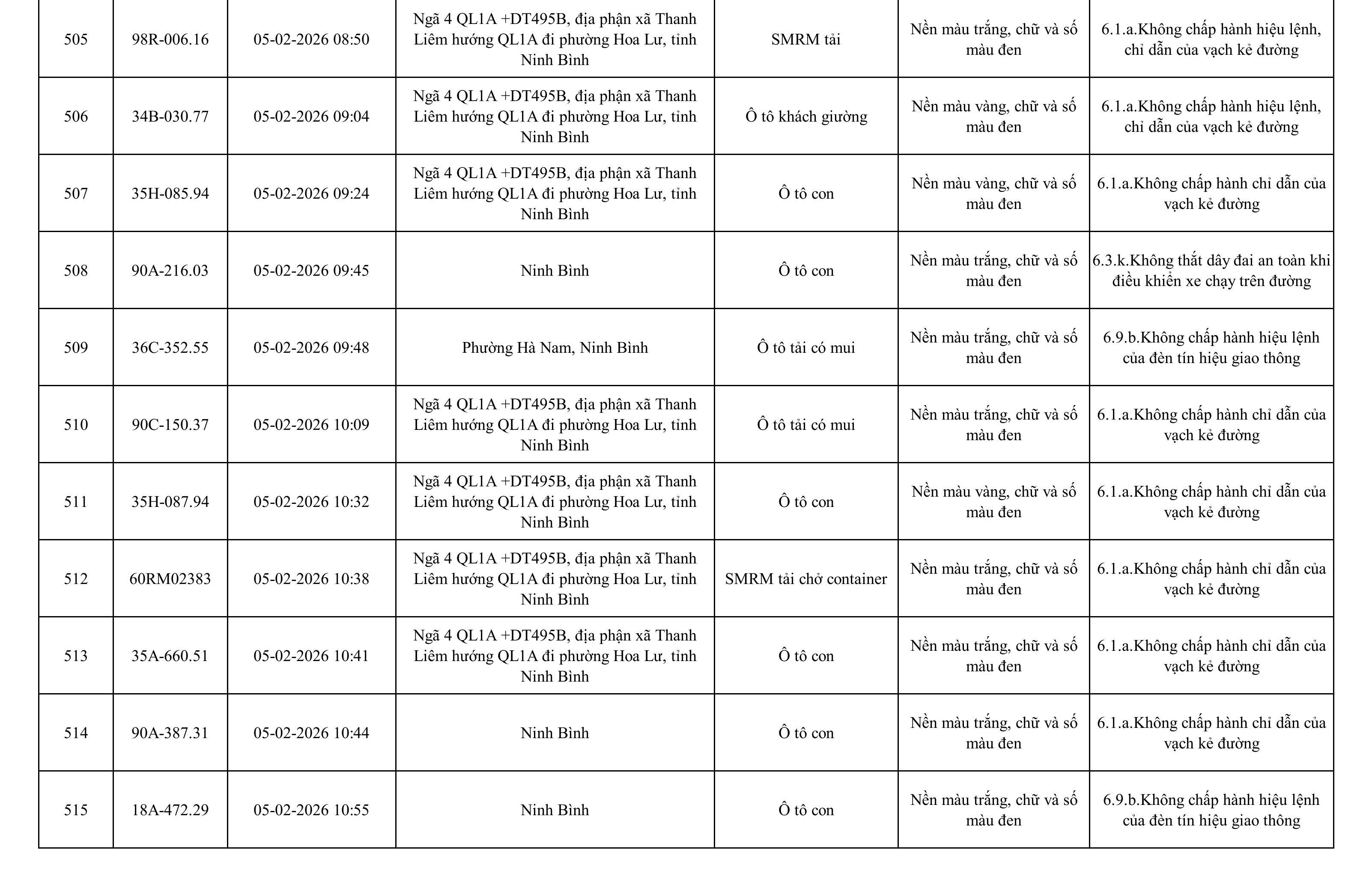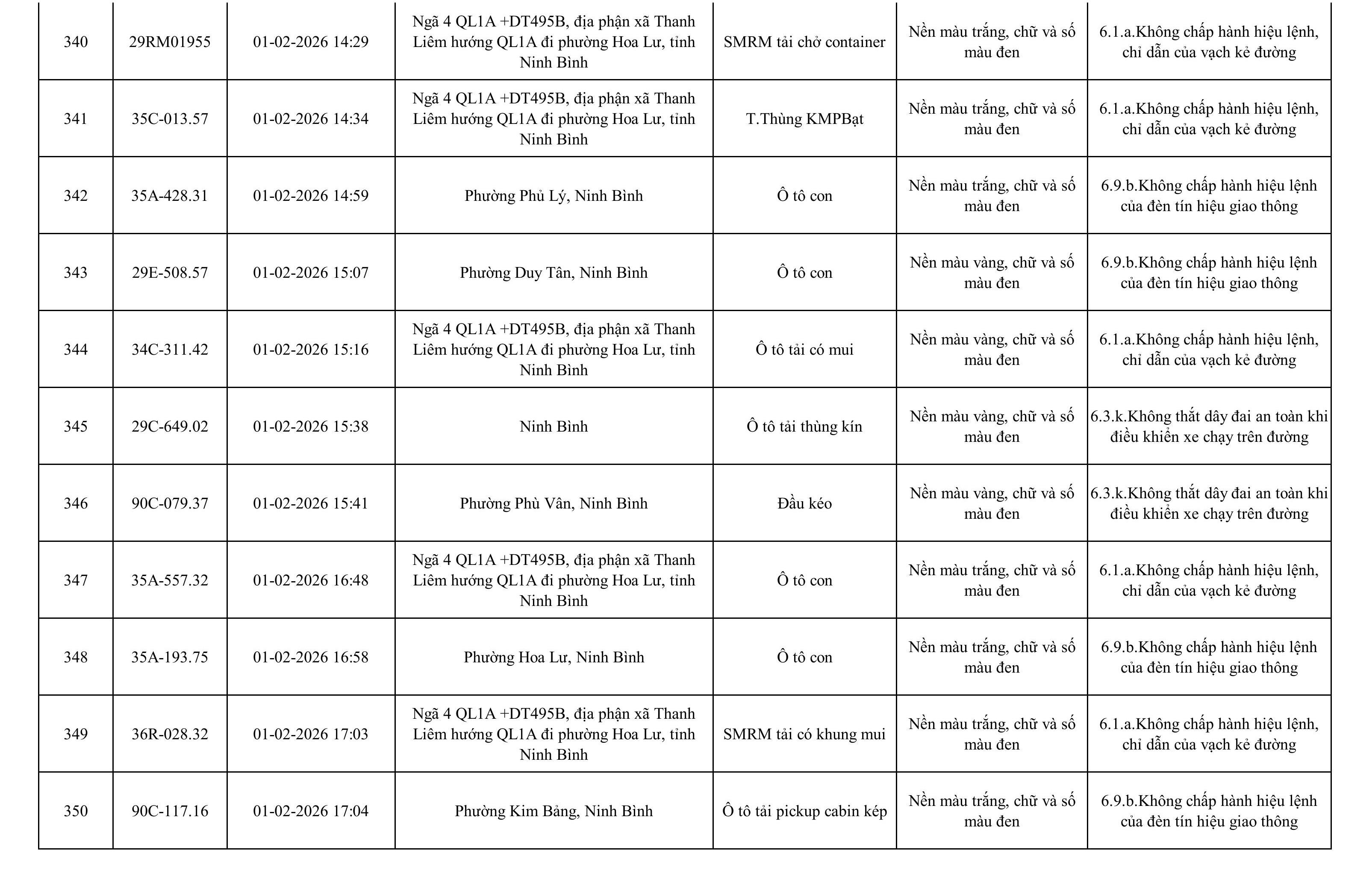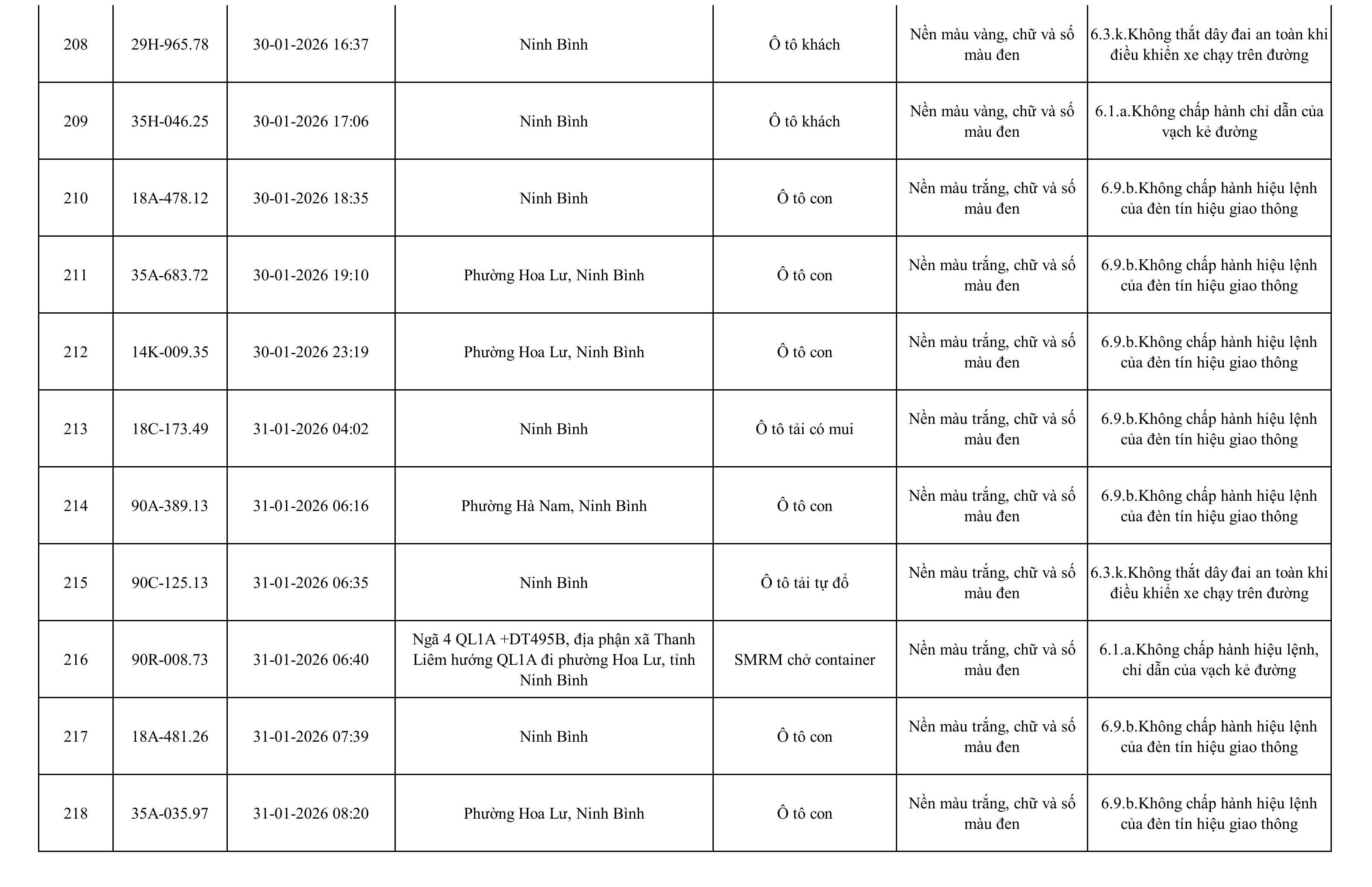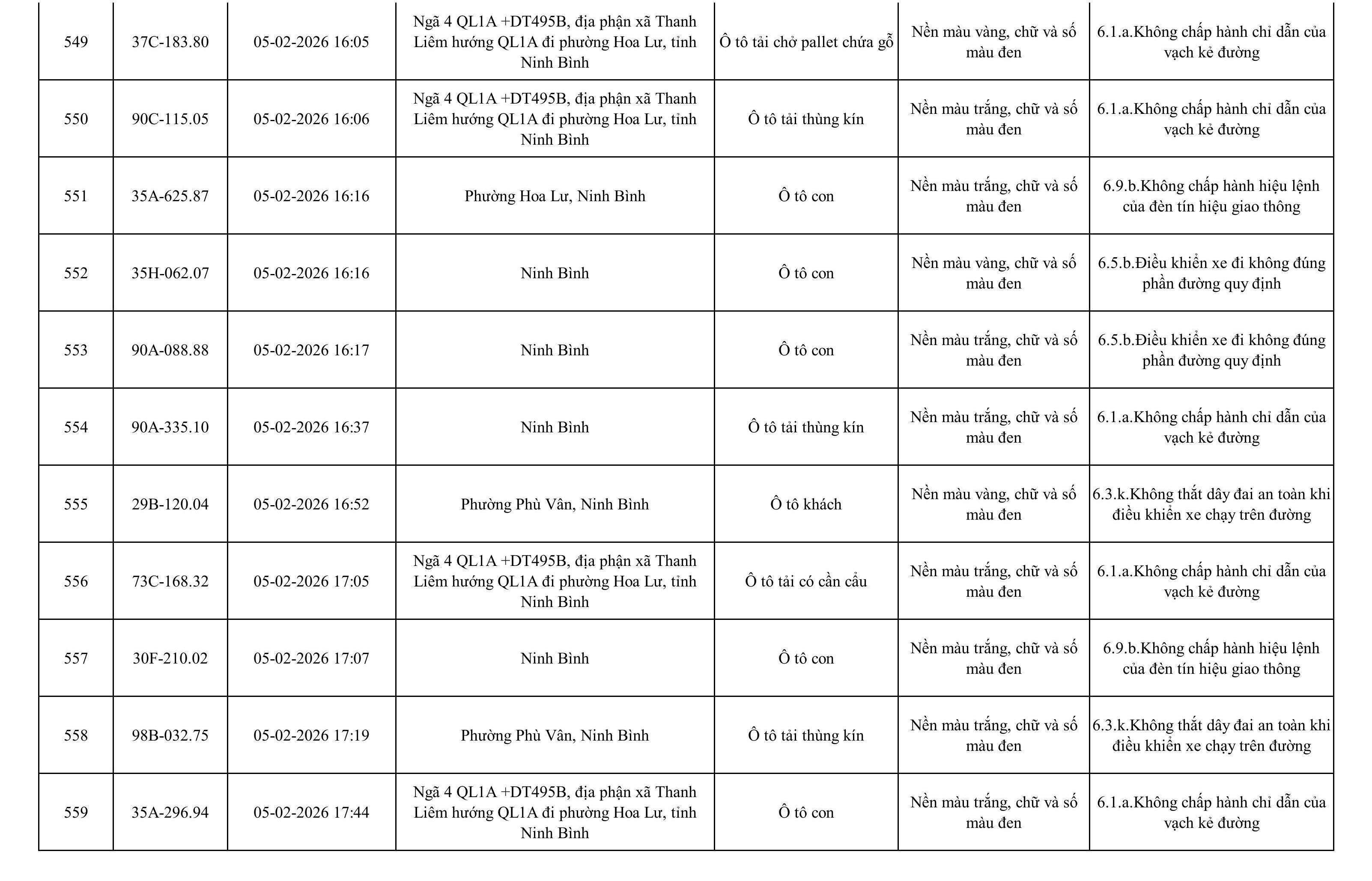 Danh sách phương tiện vi phạm được phát hiện qua hệ thống giám sát và thiết bị nghiệp vụ của Công an tỉnh Ninh Bình từ ngày 28/1/2026 đến ngày 5/2/2026.