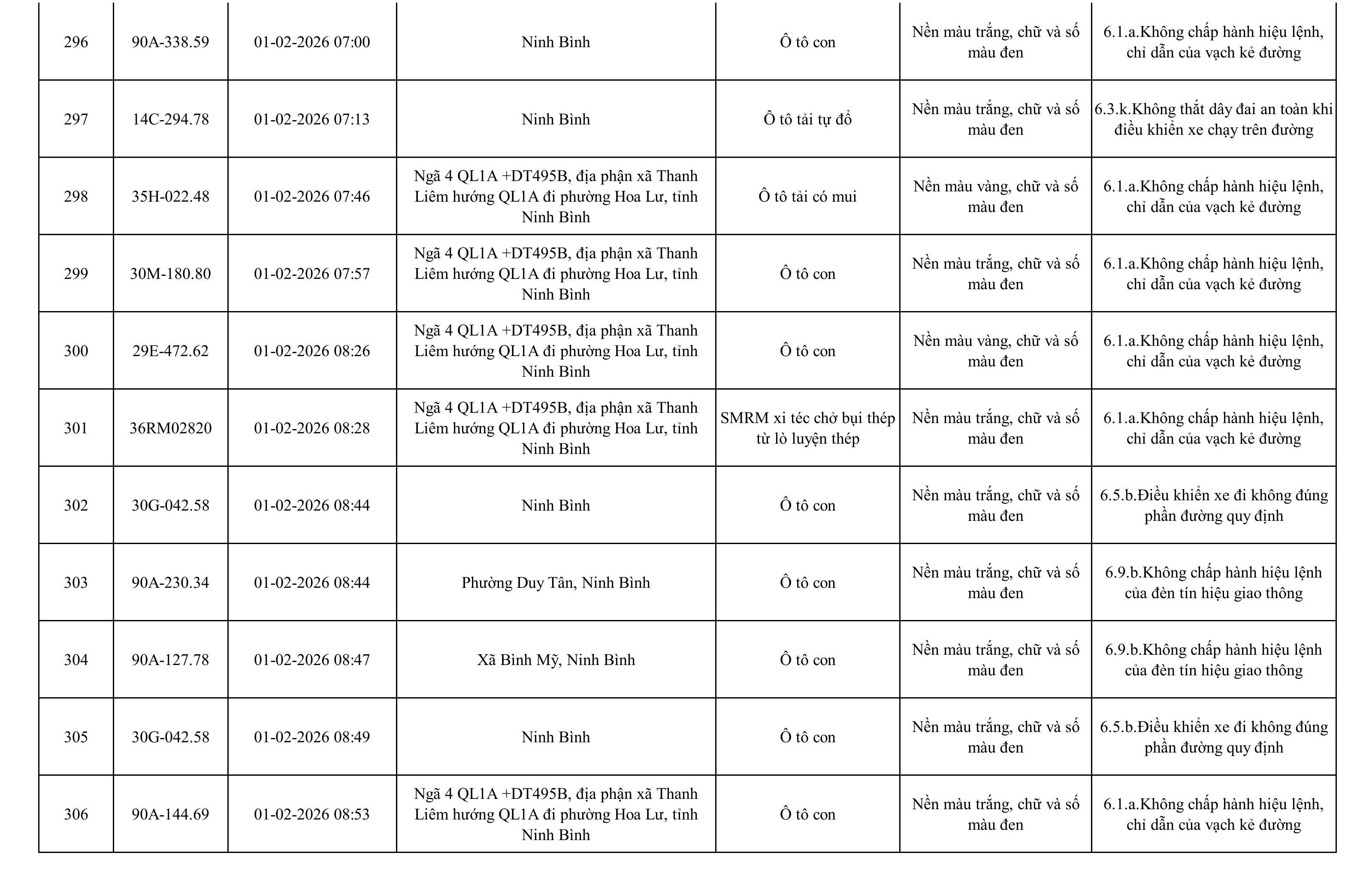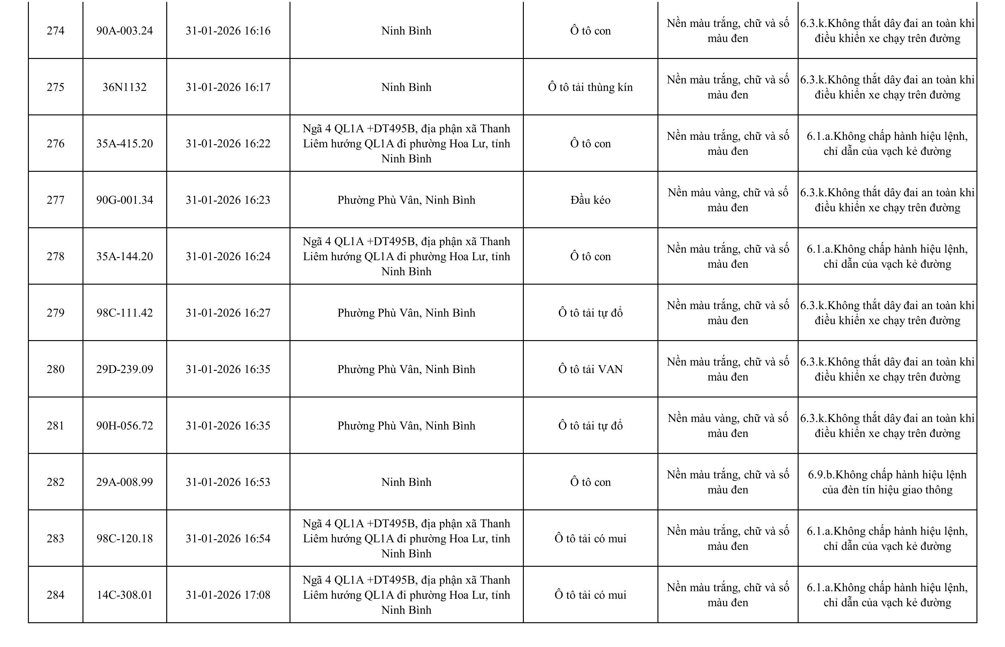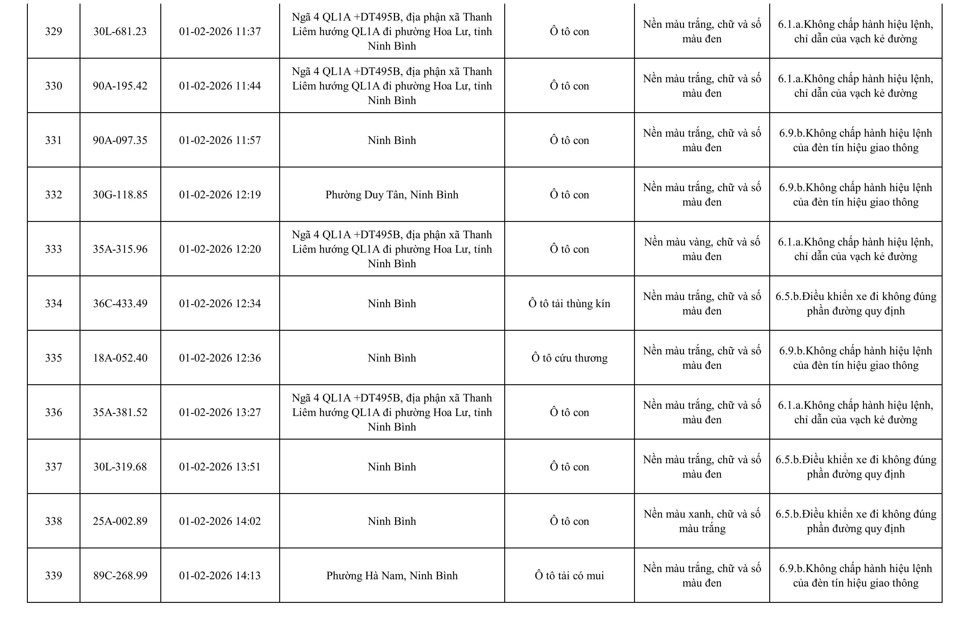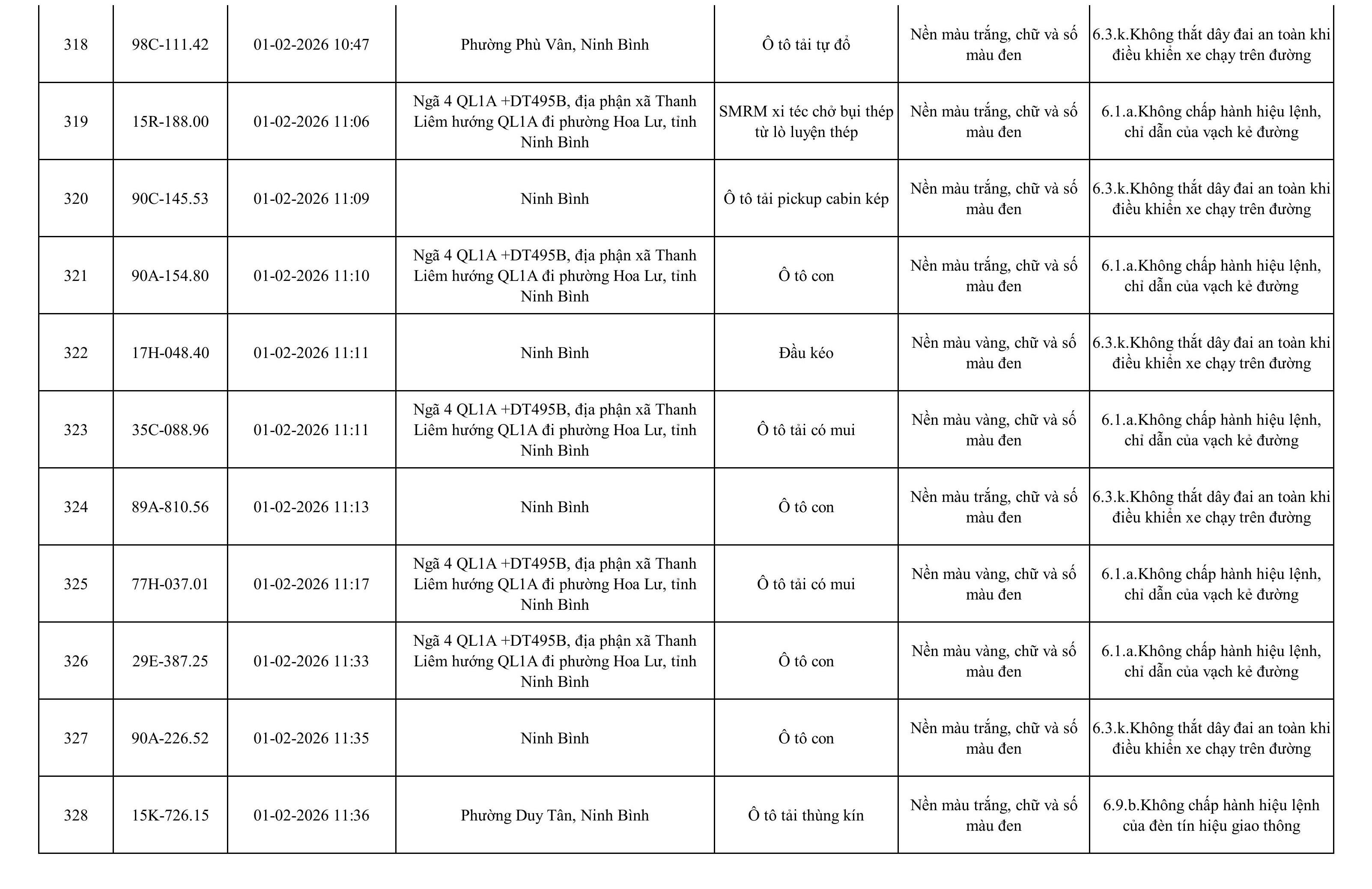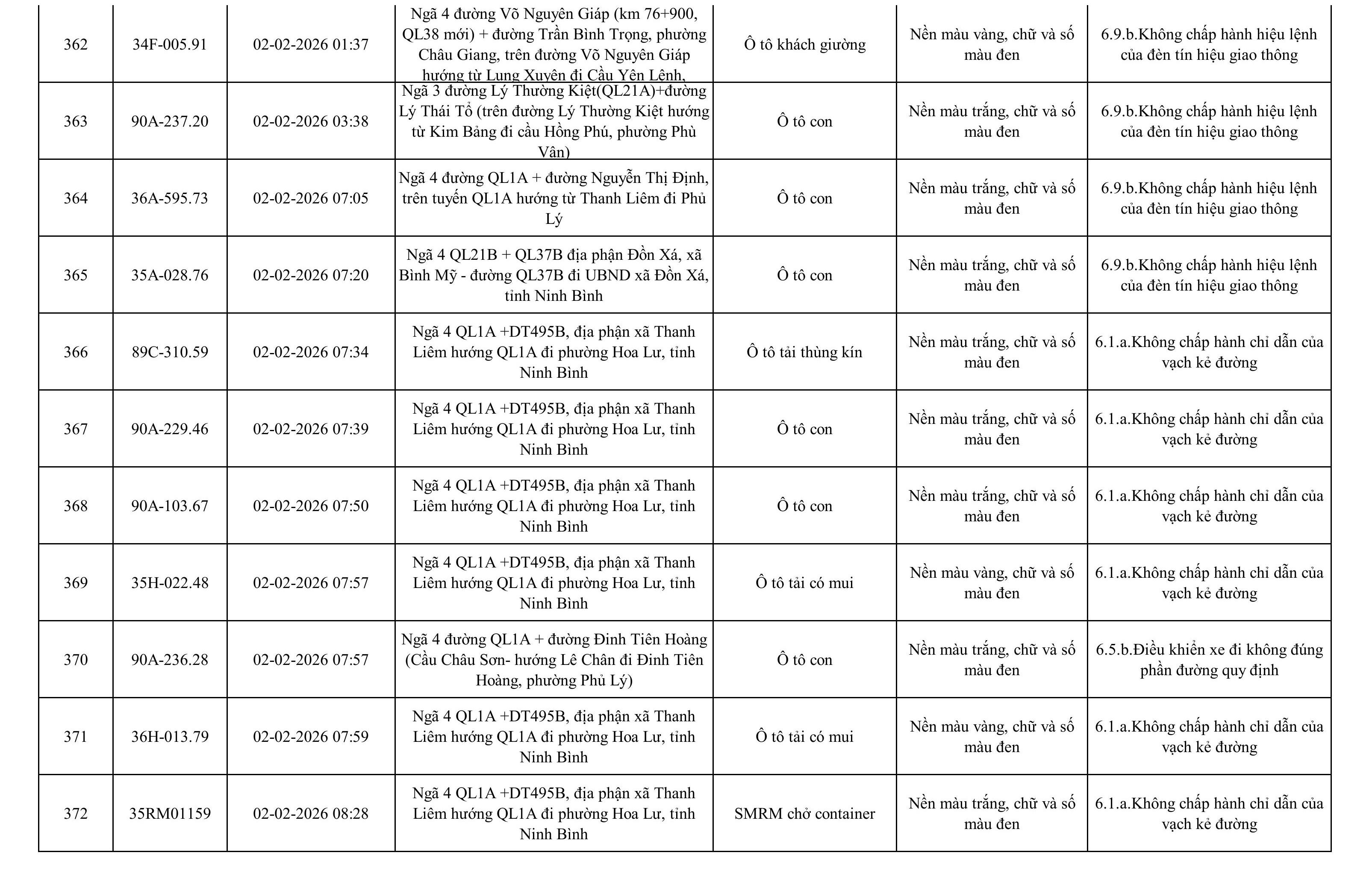 Danh sách phương tiện vi phạm được phát hiện qua hệ thống giám sát và thiết bị nghiệp vụ của Công an tỉnh Ninh Bình từ ngày 28/1/2026 đến ngày 5/2/2026.