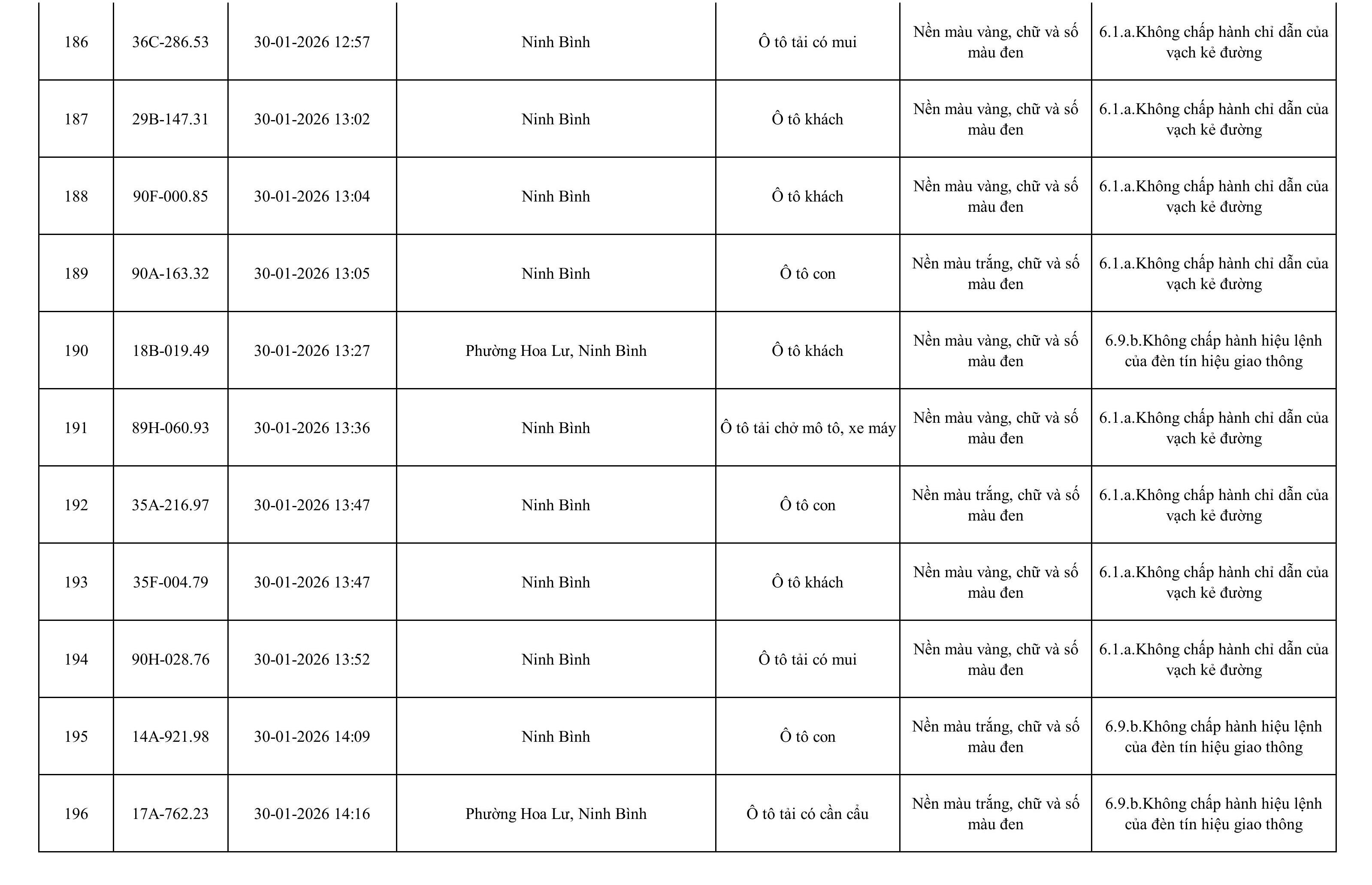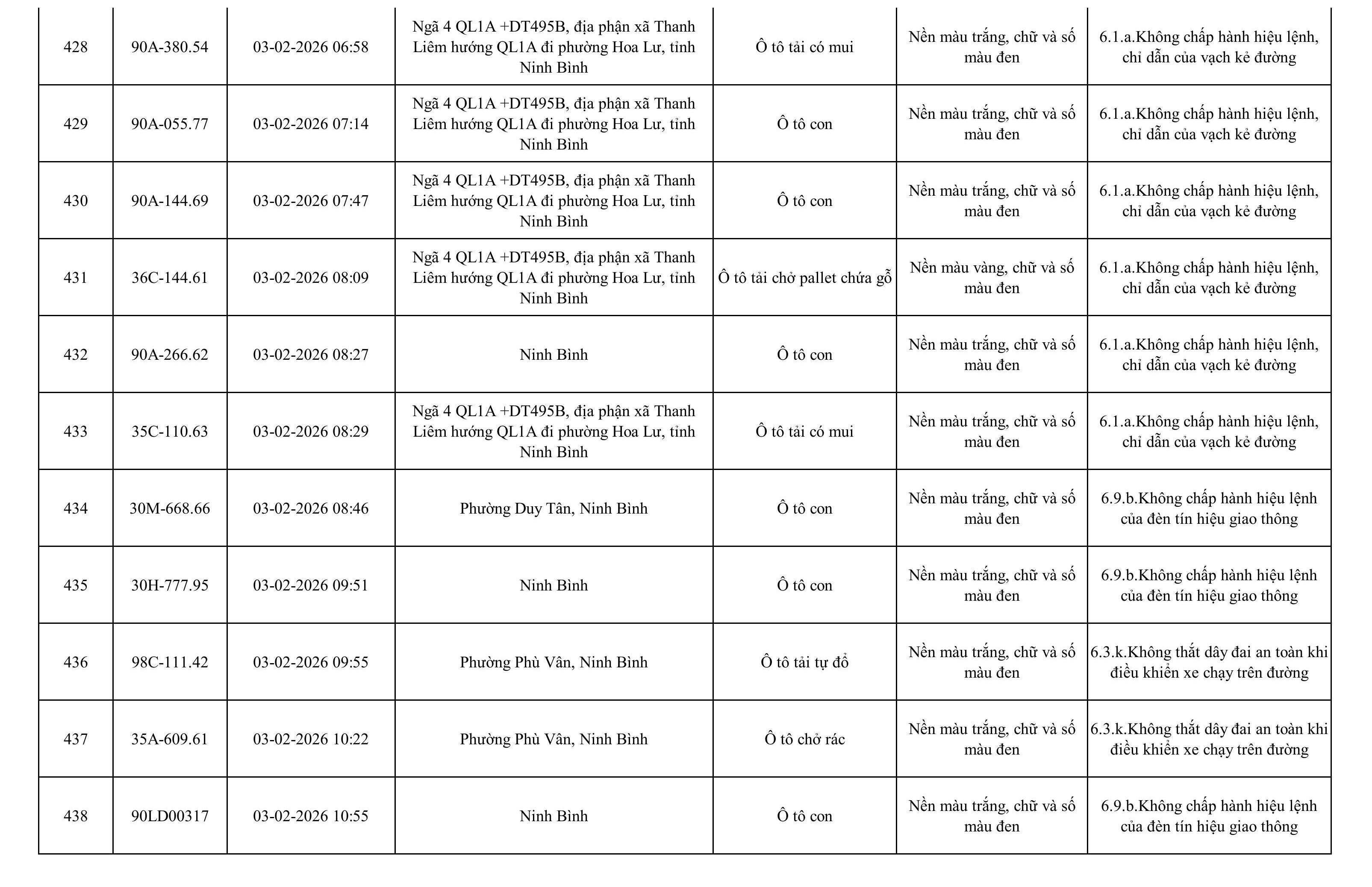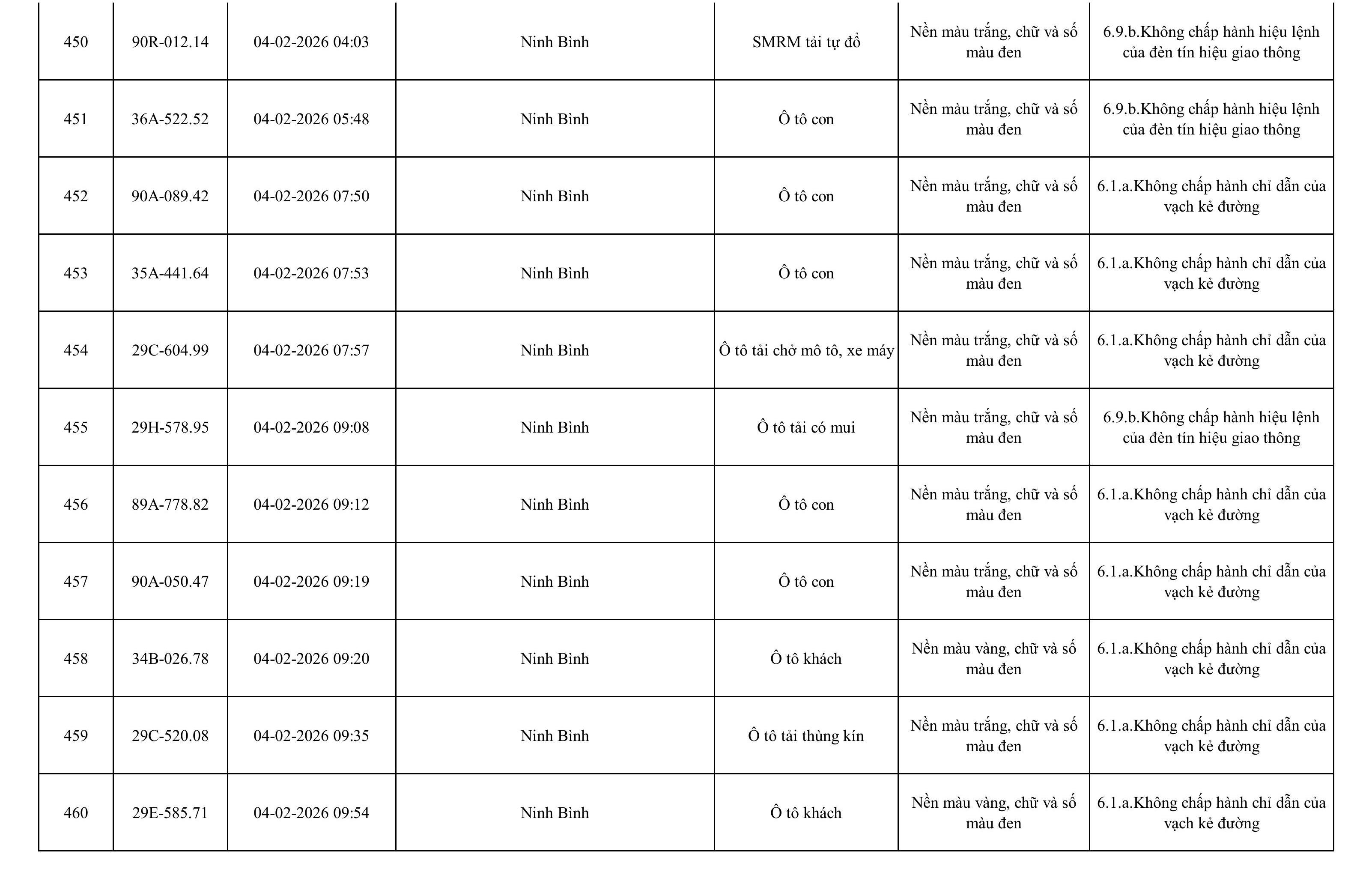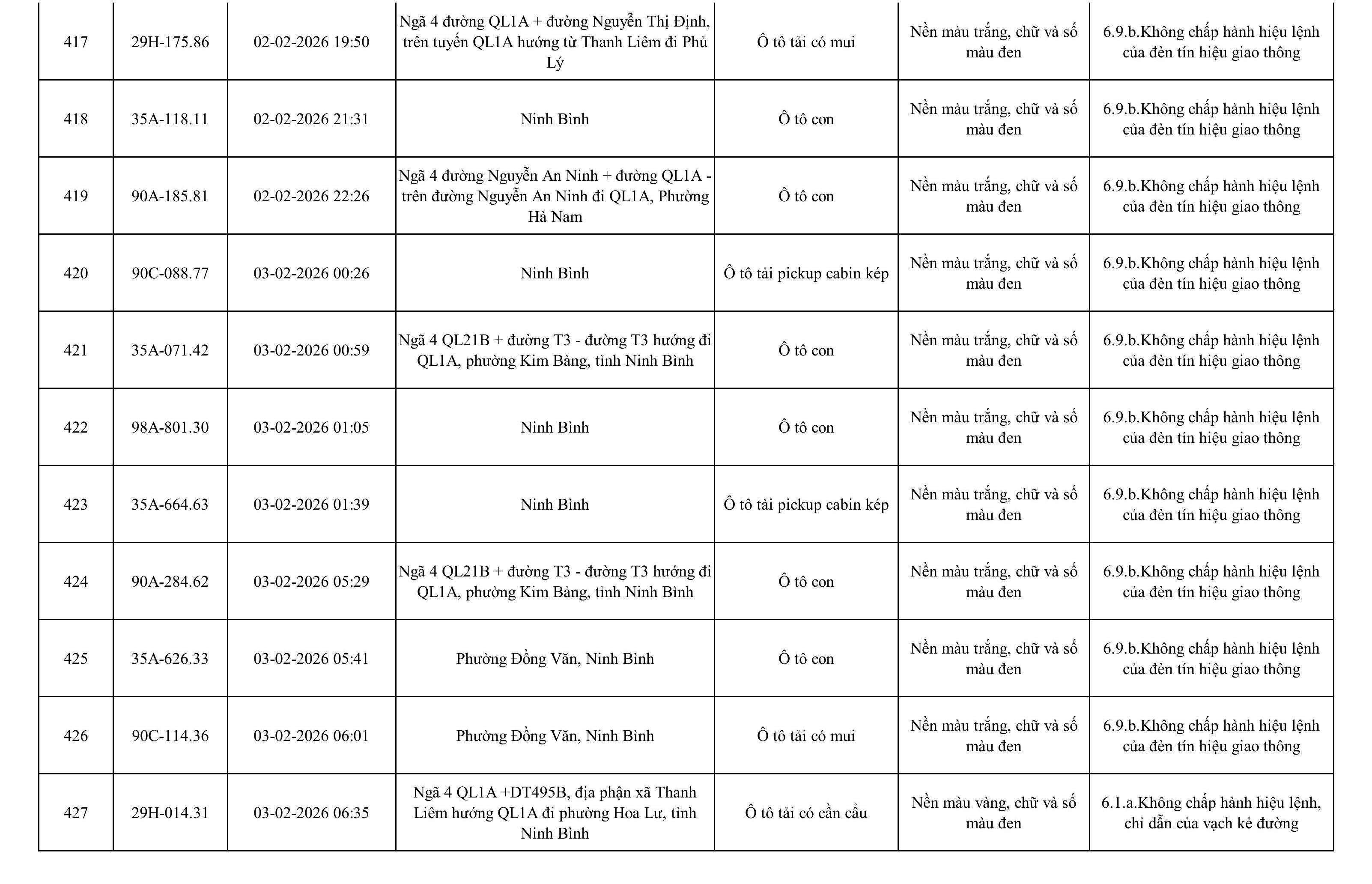 Danh sách phương tiện vi phạm được phát hiện qua hệ thống giám sát và thiết bị nghiệp vụ của Công an tỉnh Ninh Bình từ ngày 28/1/2026 đến ngày 5/2/2026.