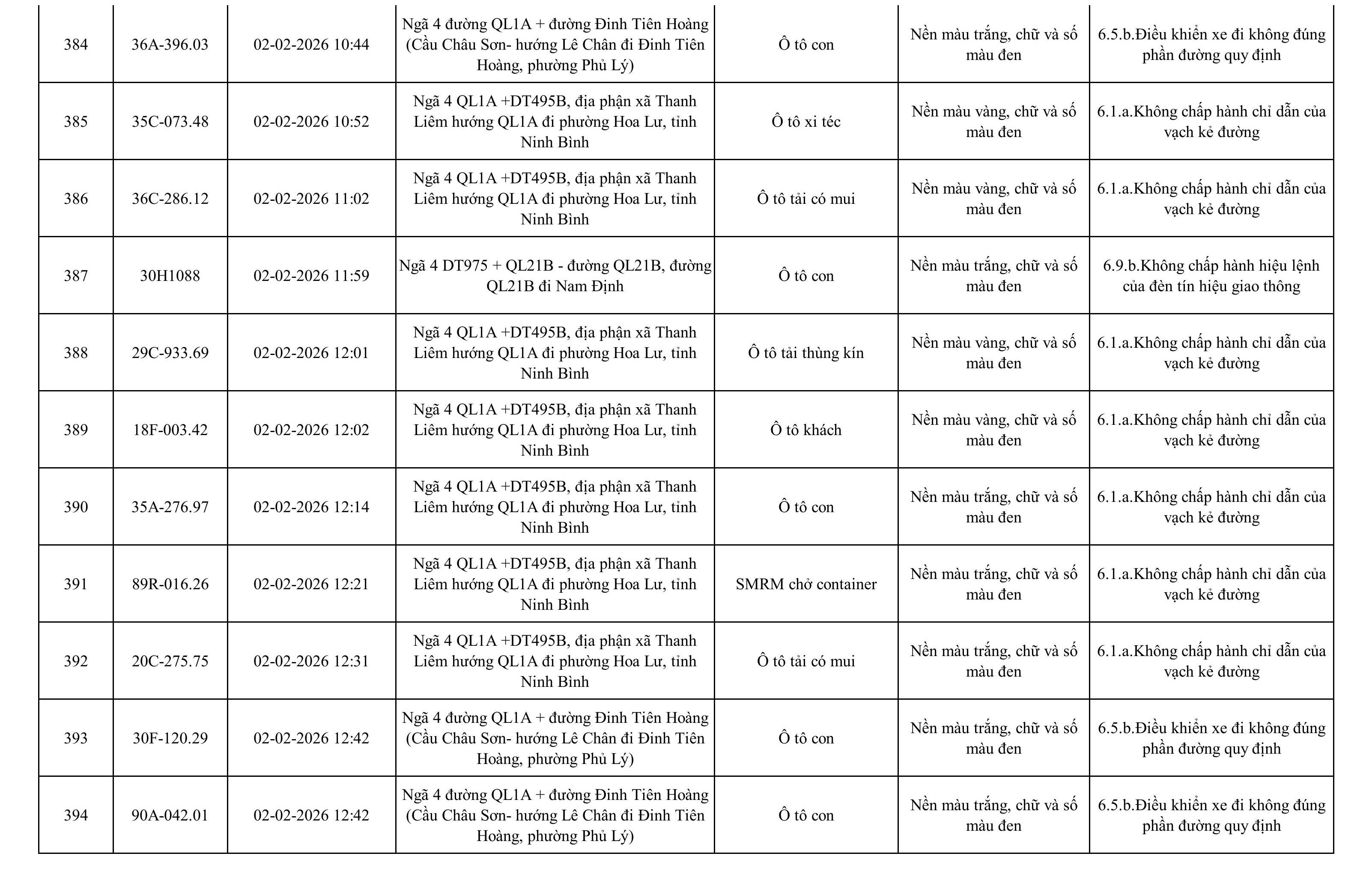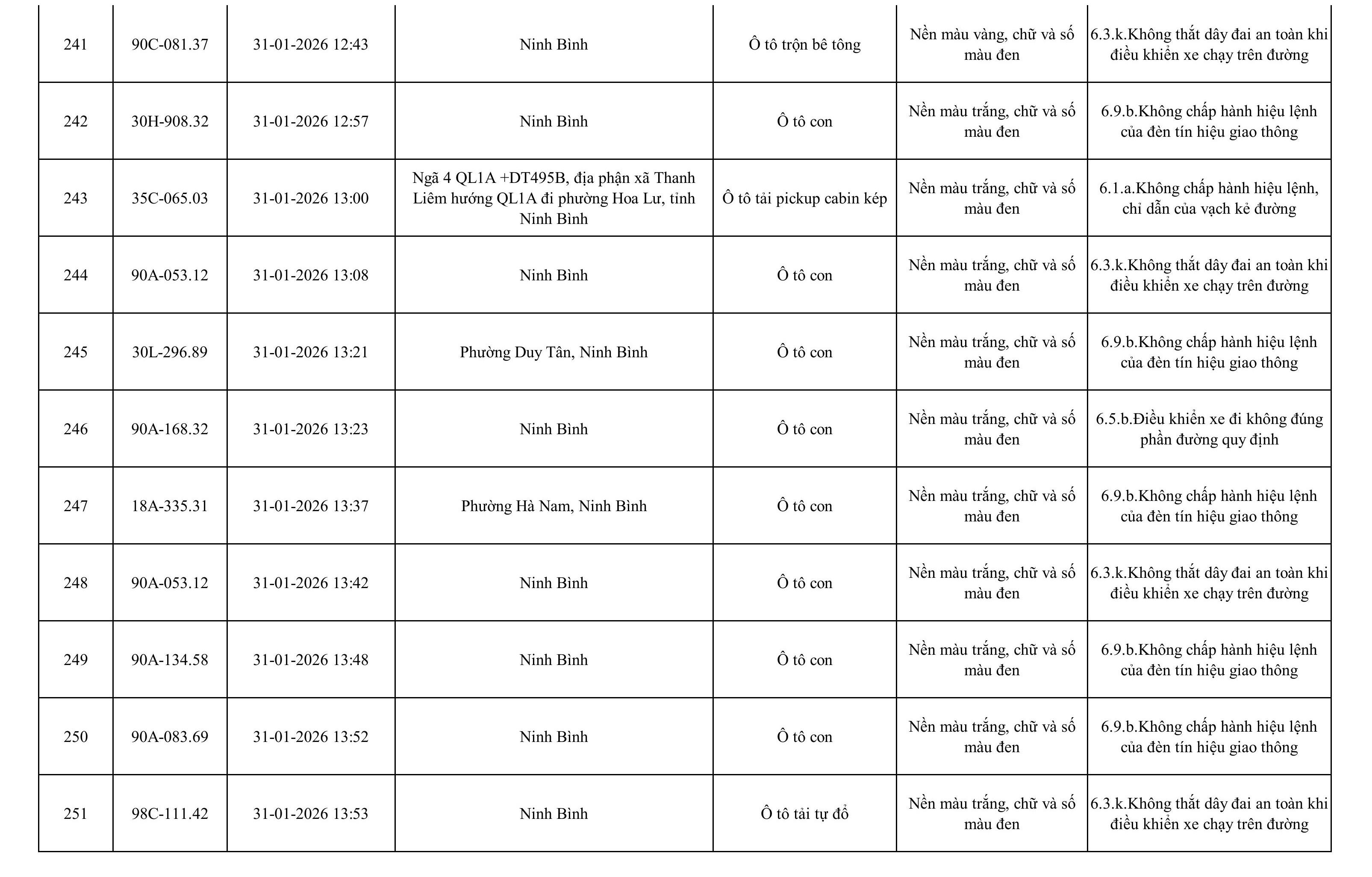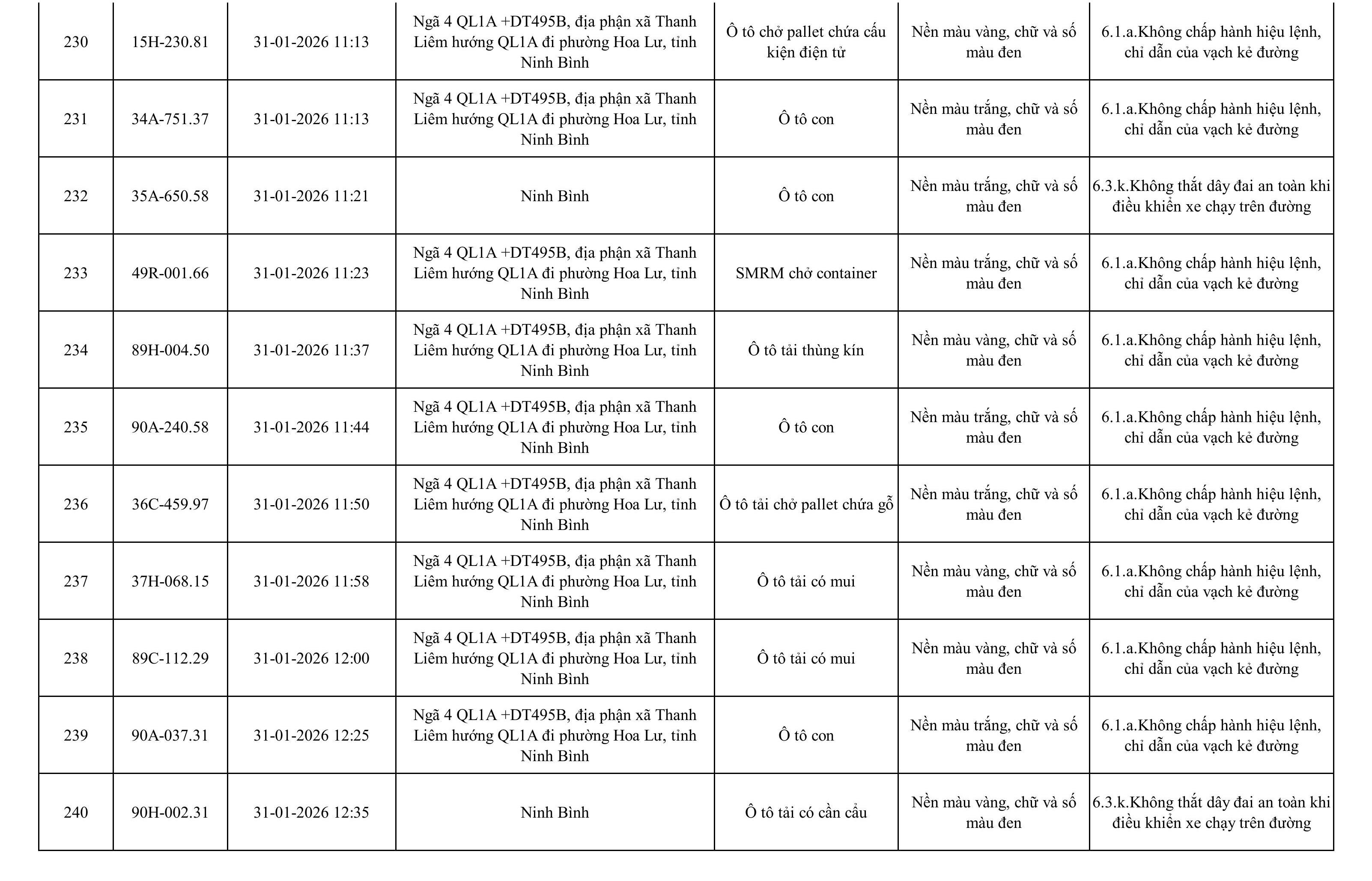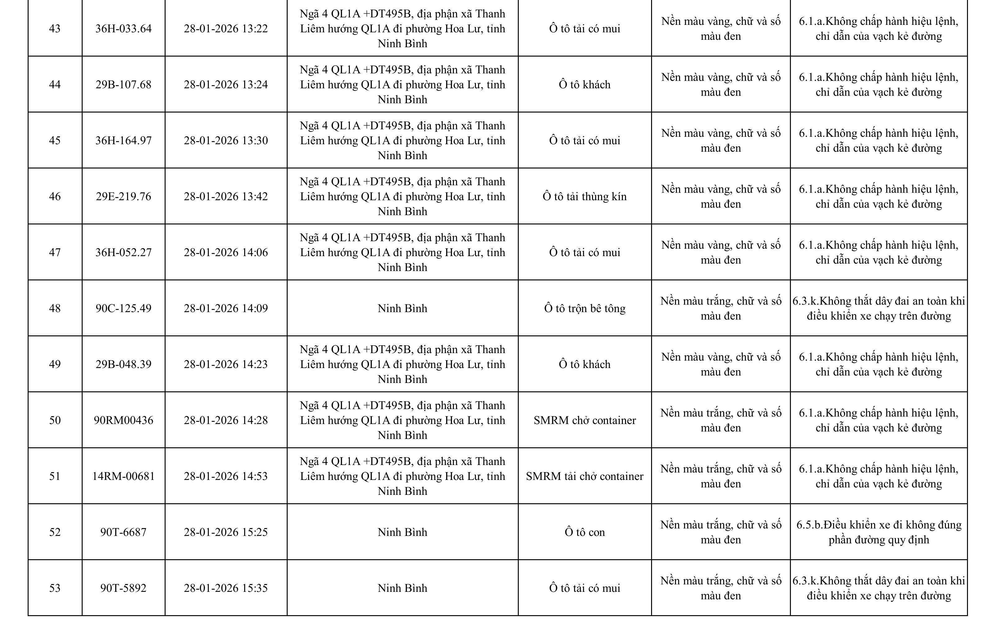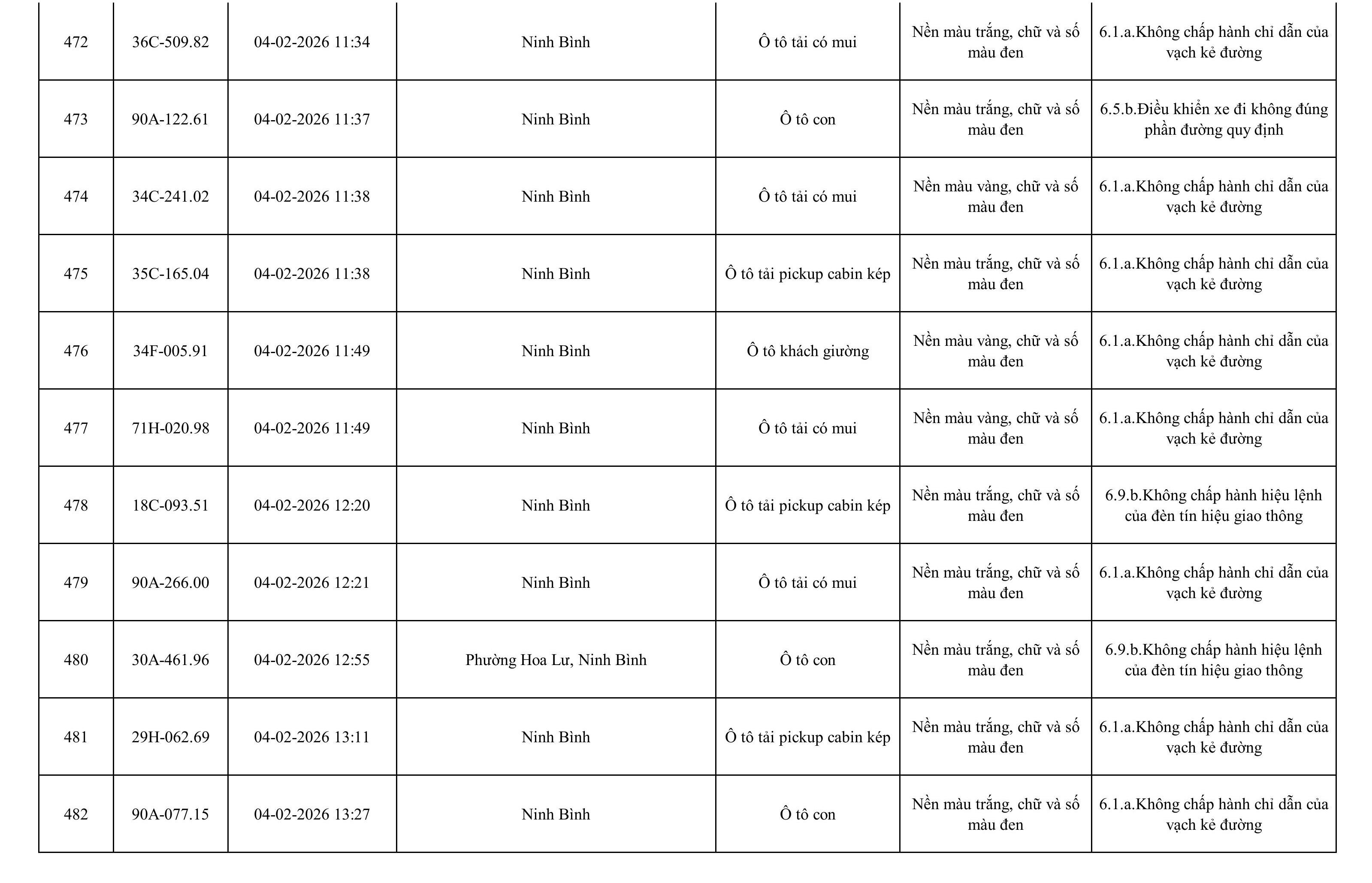 Danh sách phương tiện vi phạm được phát hiện qua hệ thống giám sát và thiết bị nghiệp vụ của Công an tỉnh Ninh Bình từ ngày 28/1/2026 đến ngày 5/2/2026.