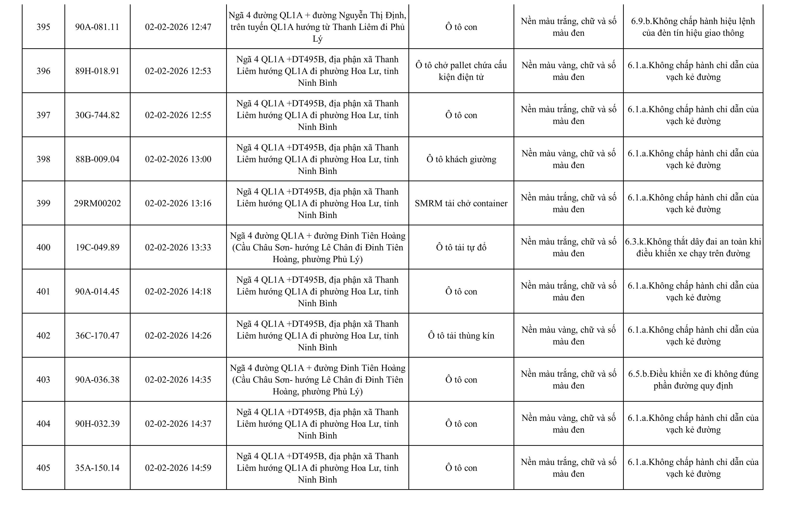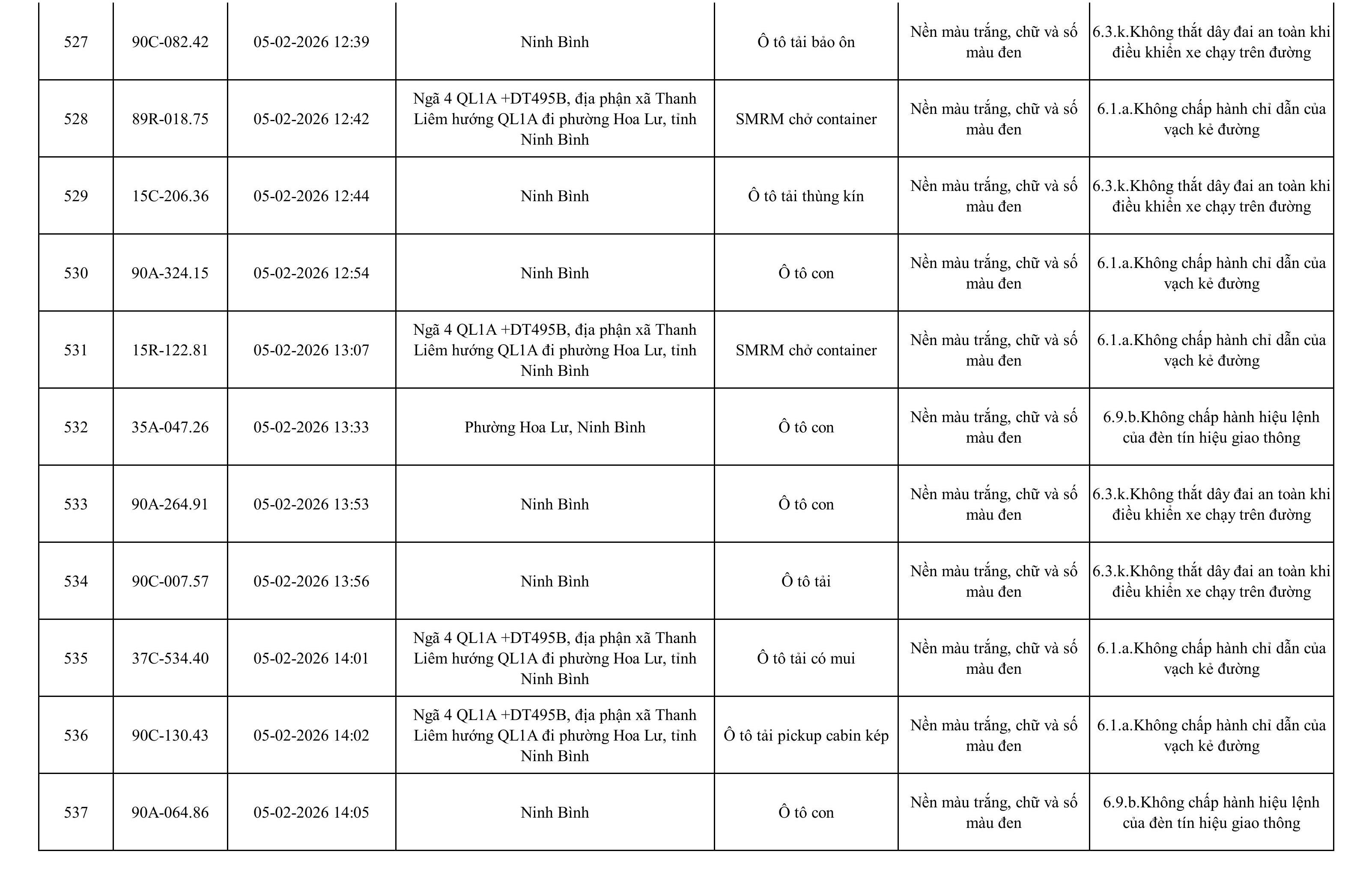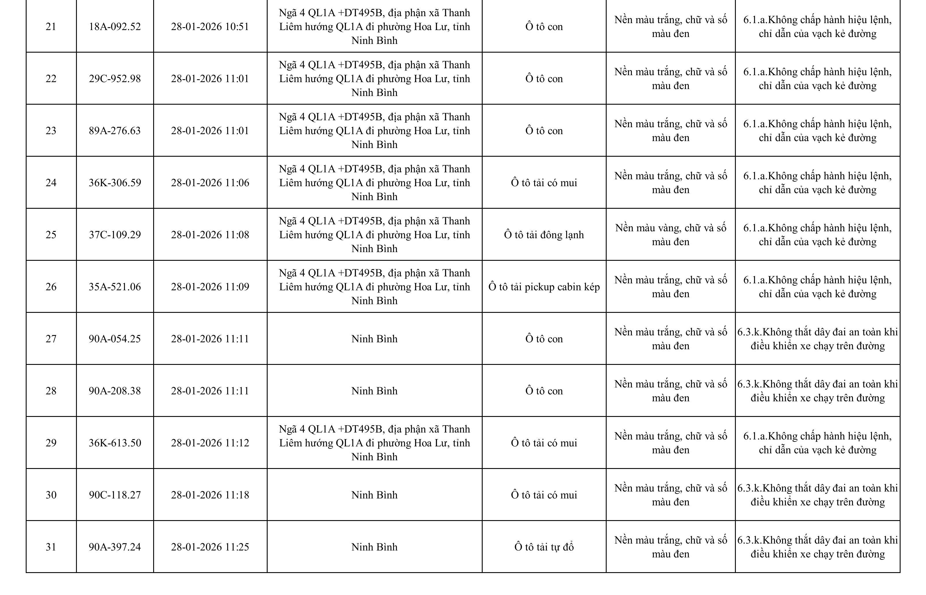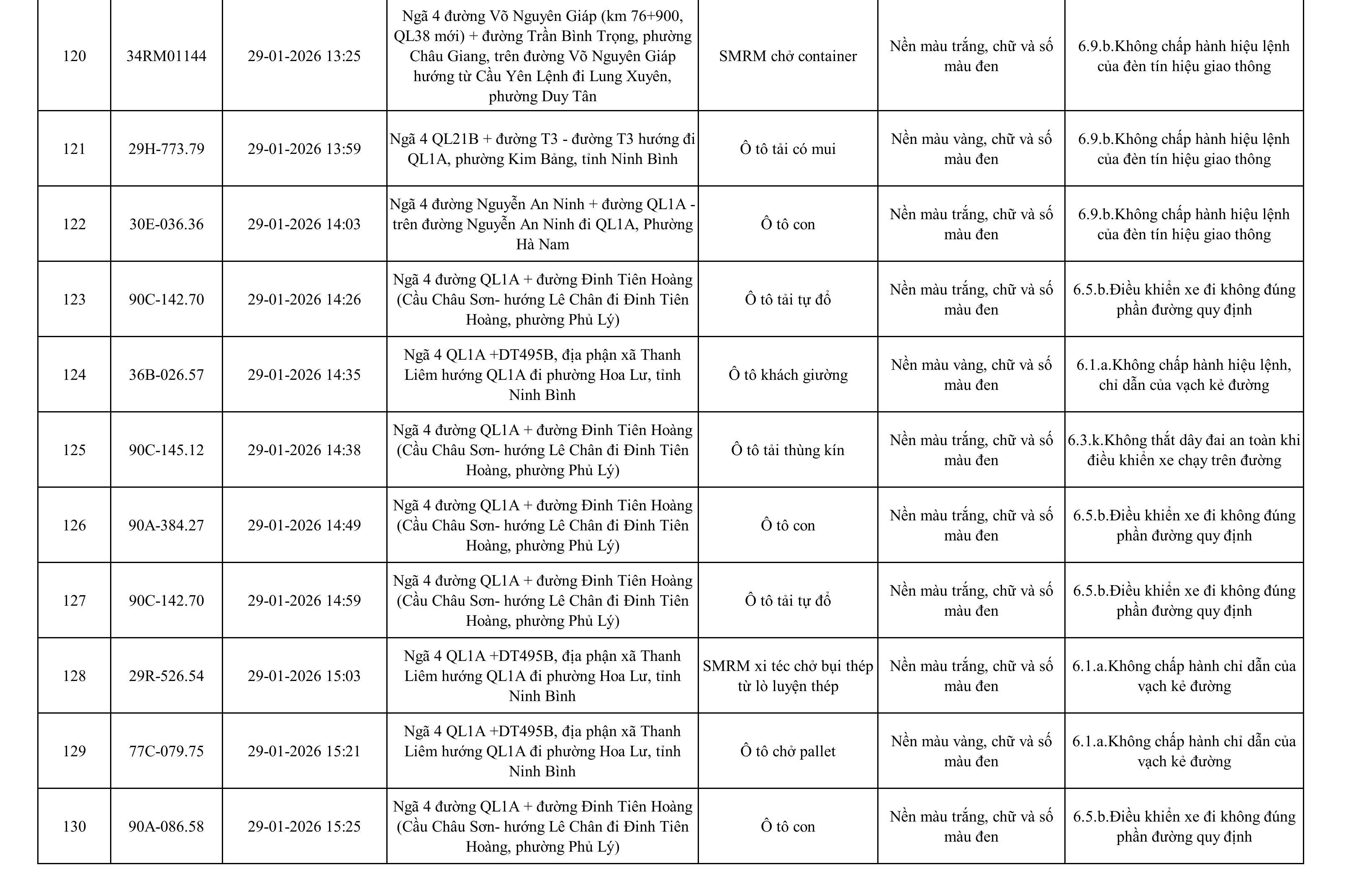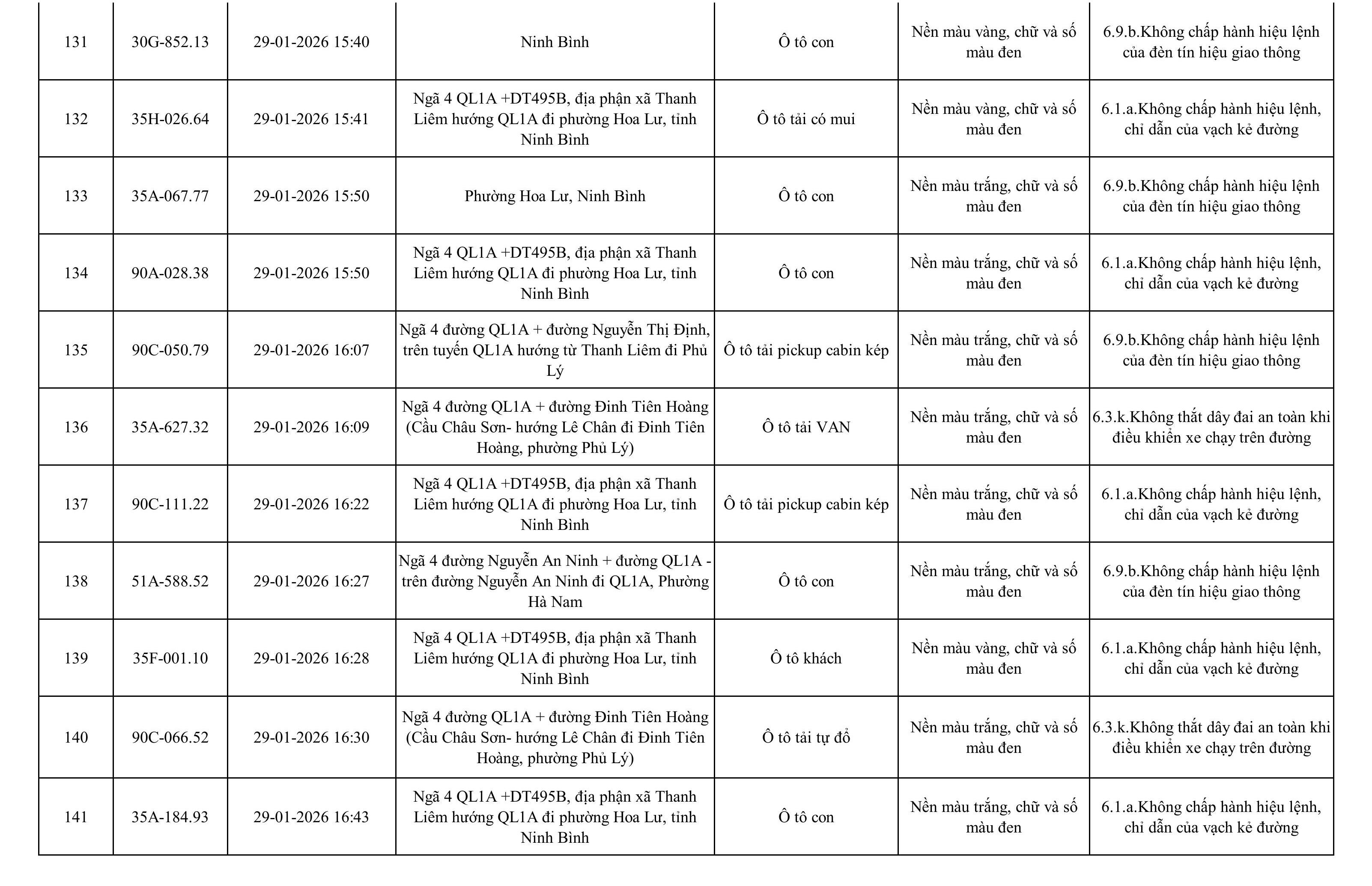 Danh sách phương tiện vi phạm được phát hiện qua hệ thống giám sát và thiết bị nghiệp vụ của Công an tỉnh Ninh Bình từ ngày 28/1/2026 đến ngày 5/2/2026.