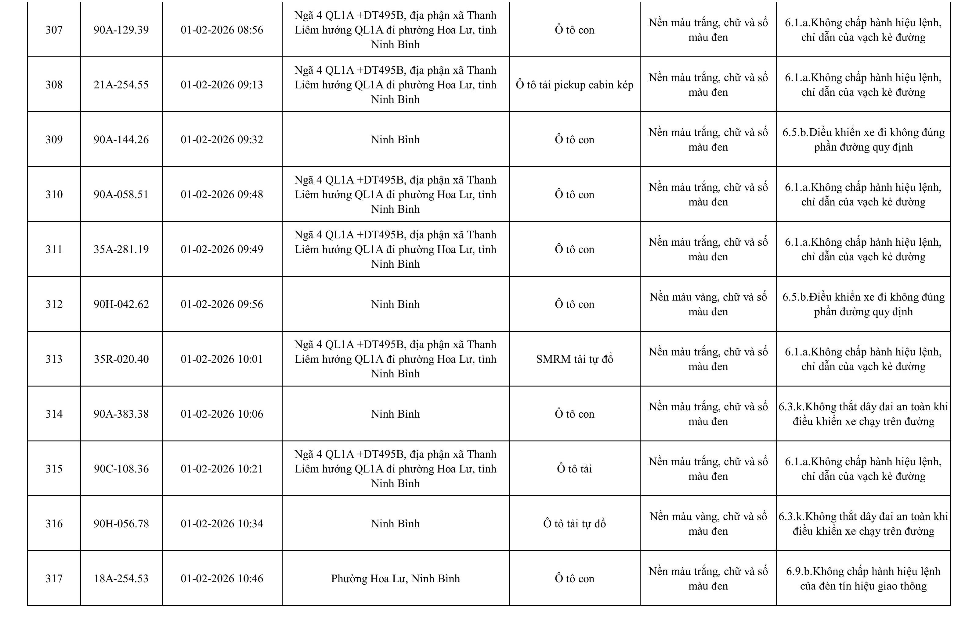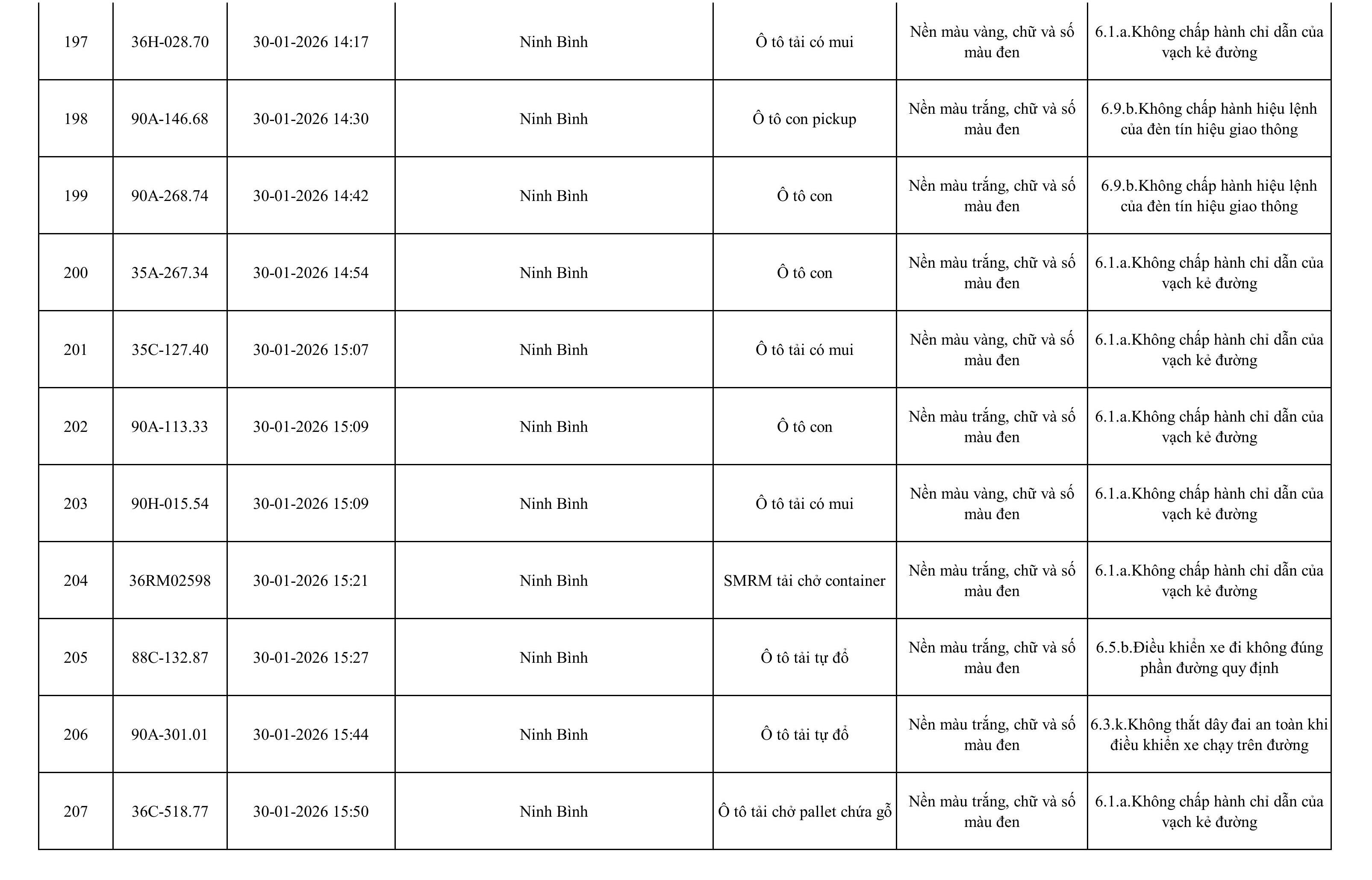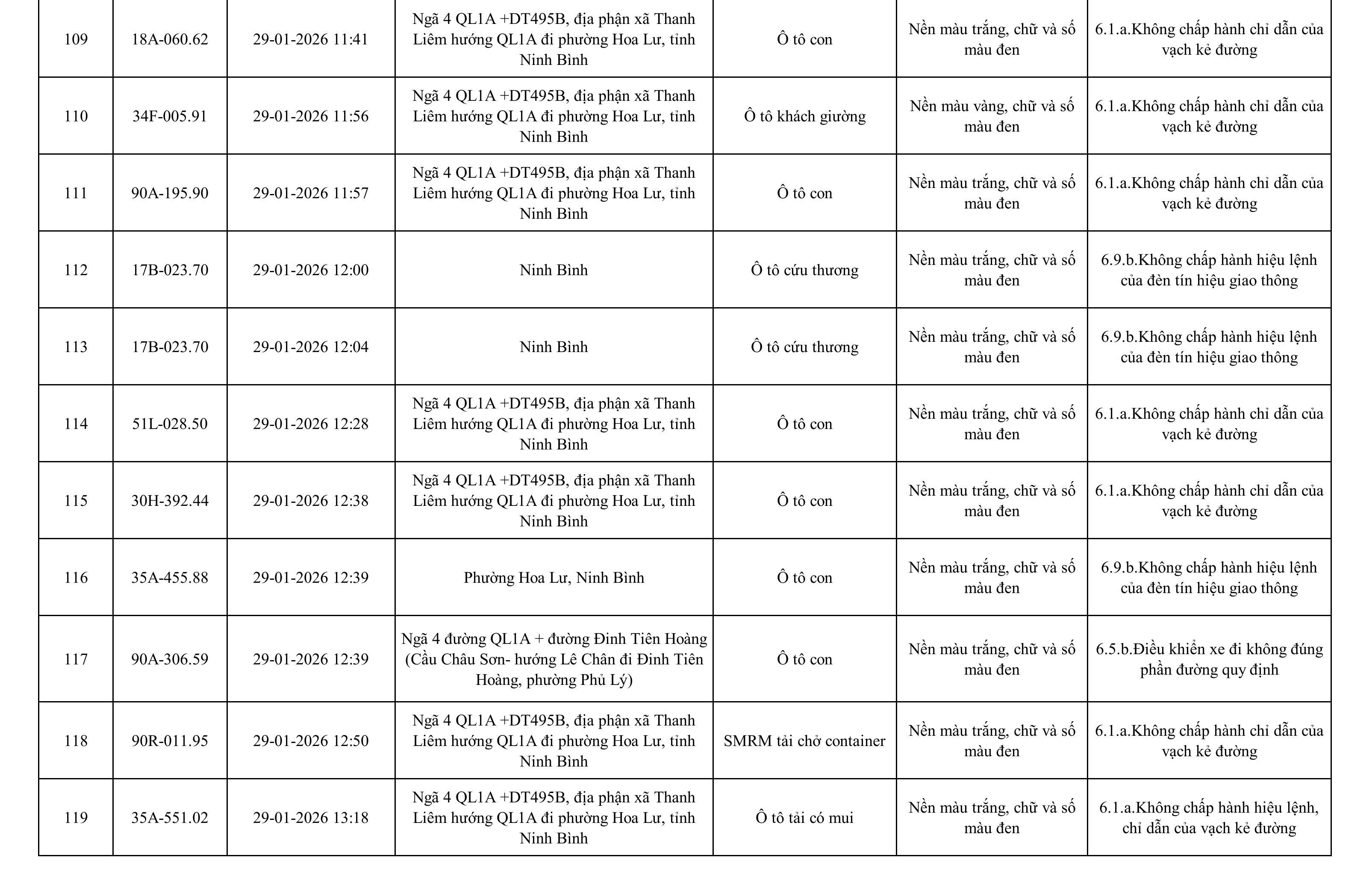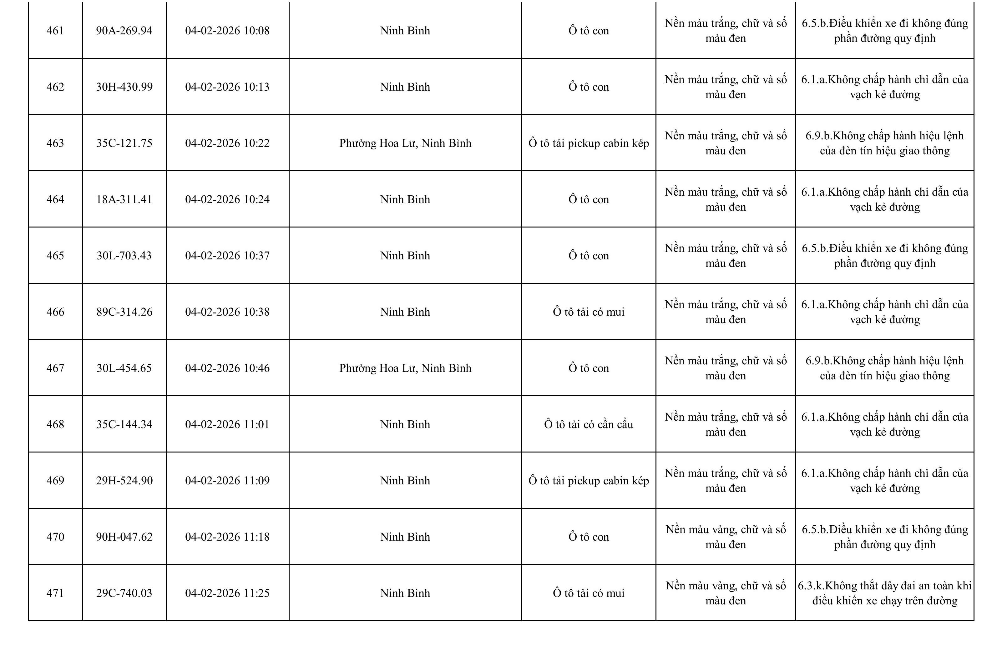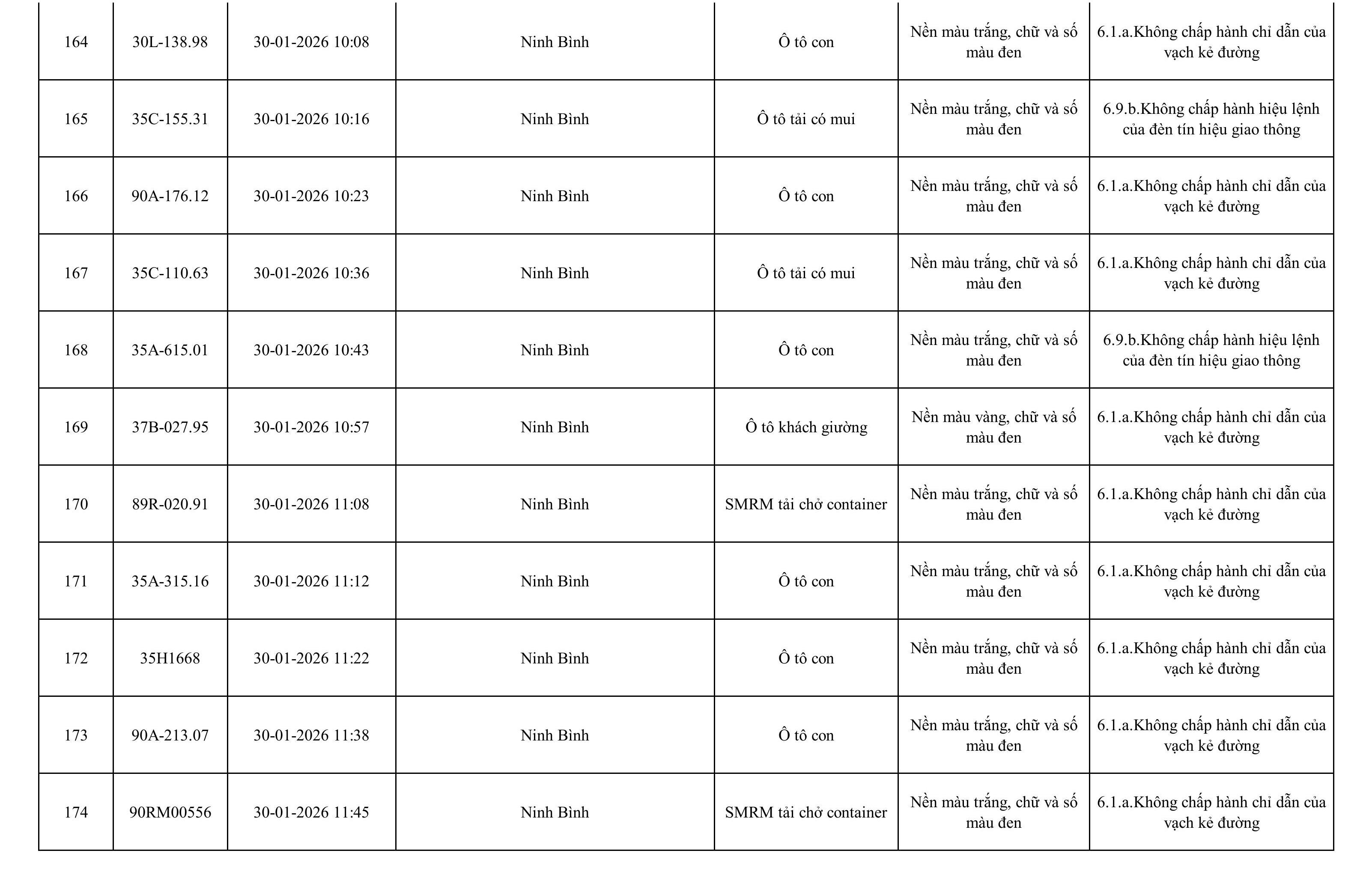 Danh sách phương tiện vi phạm được phát hiện qua hệ thống giám sát và thiết bị nghiệp vụ của Công an tỉnh Ninh Bình từ ngày 28/1/2026 đến ngày 5/2/2026.