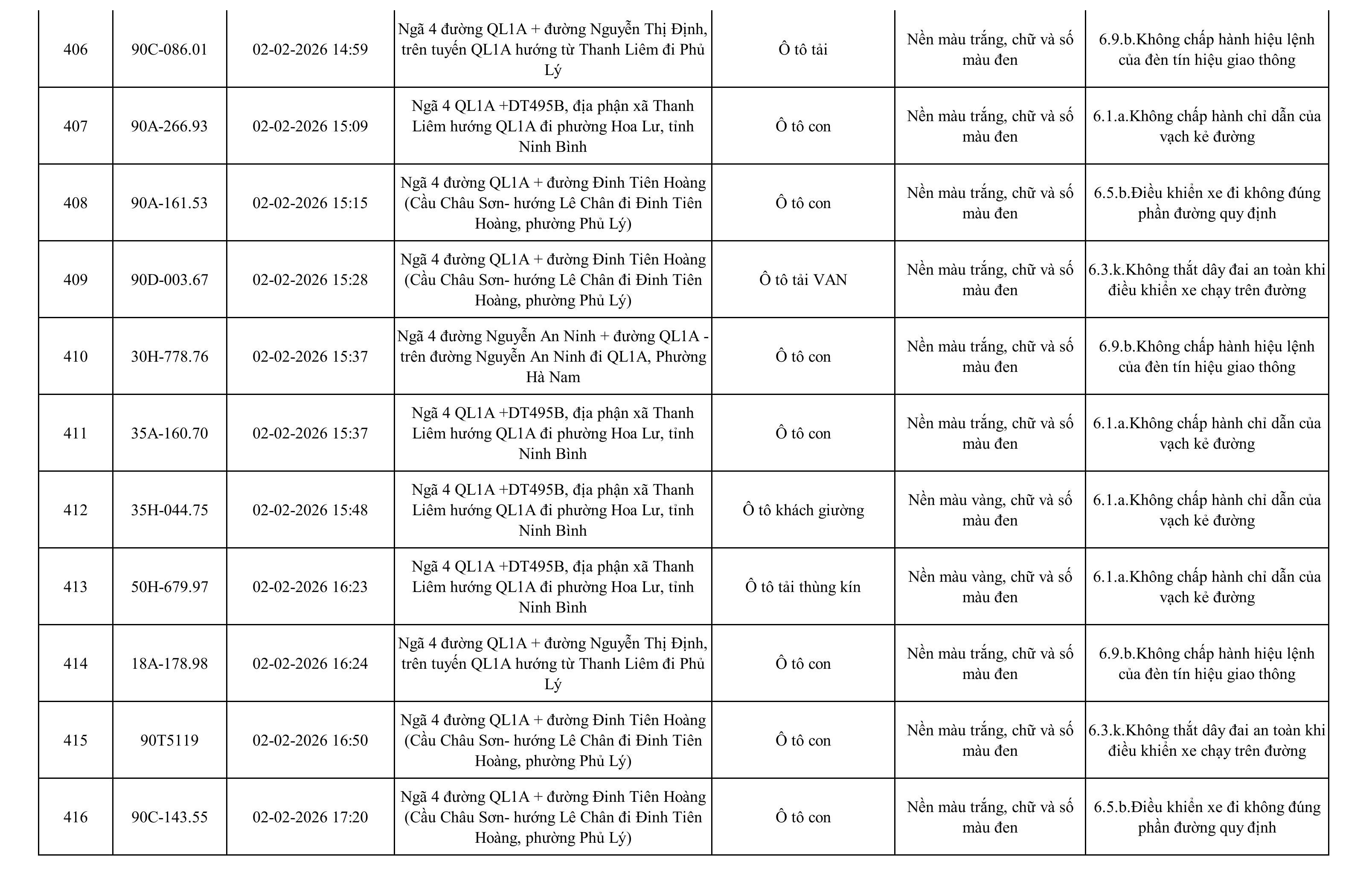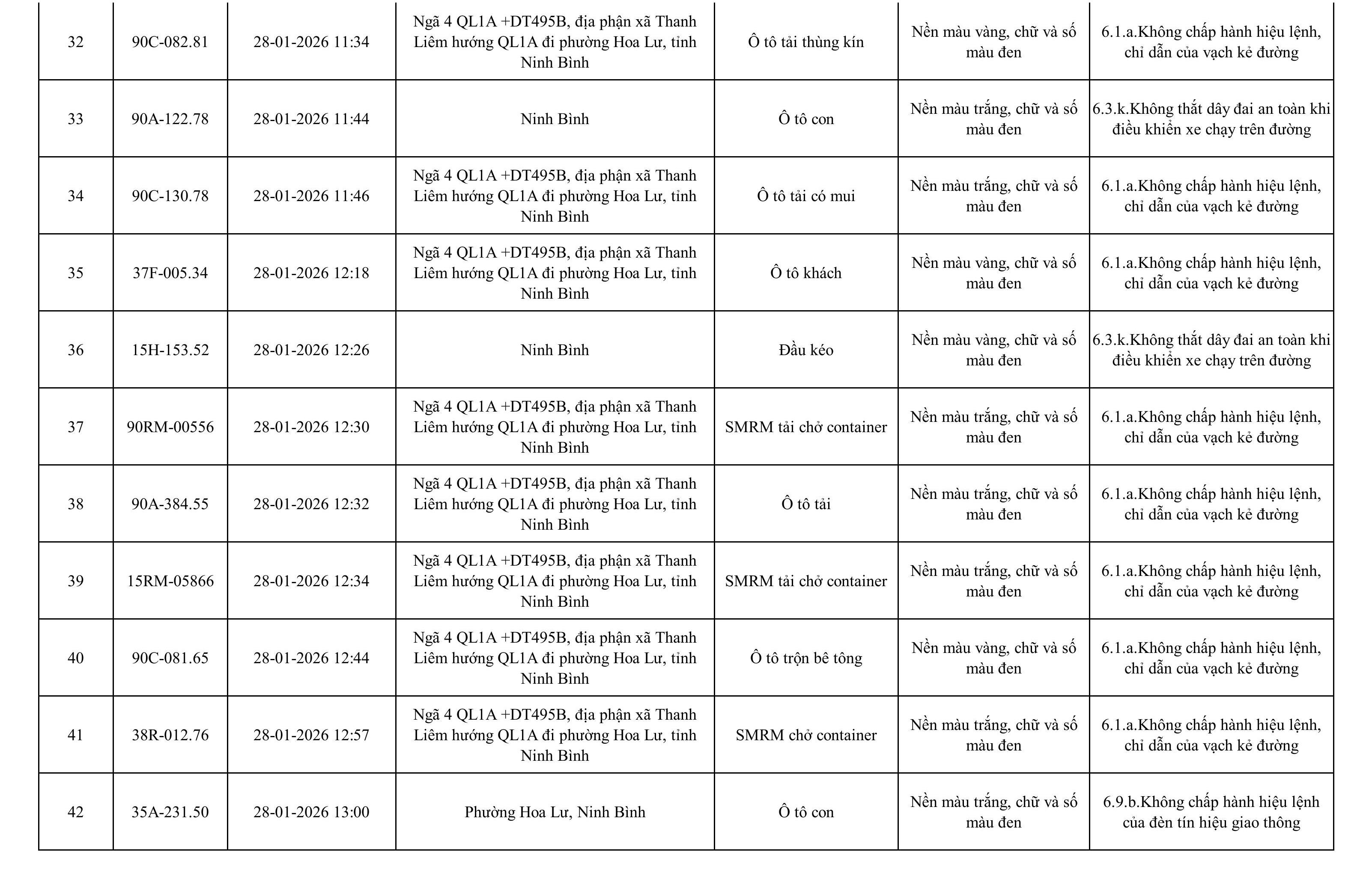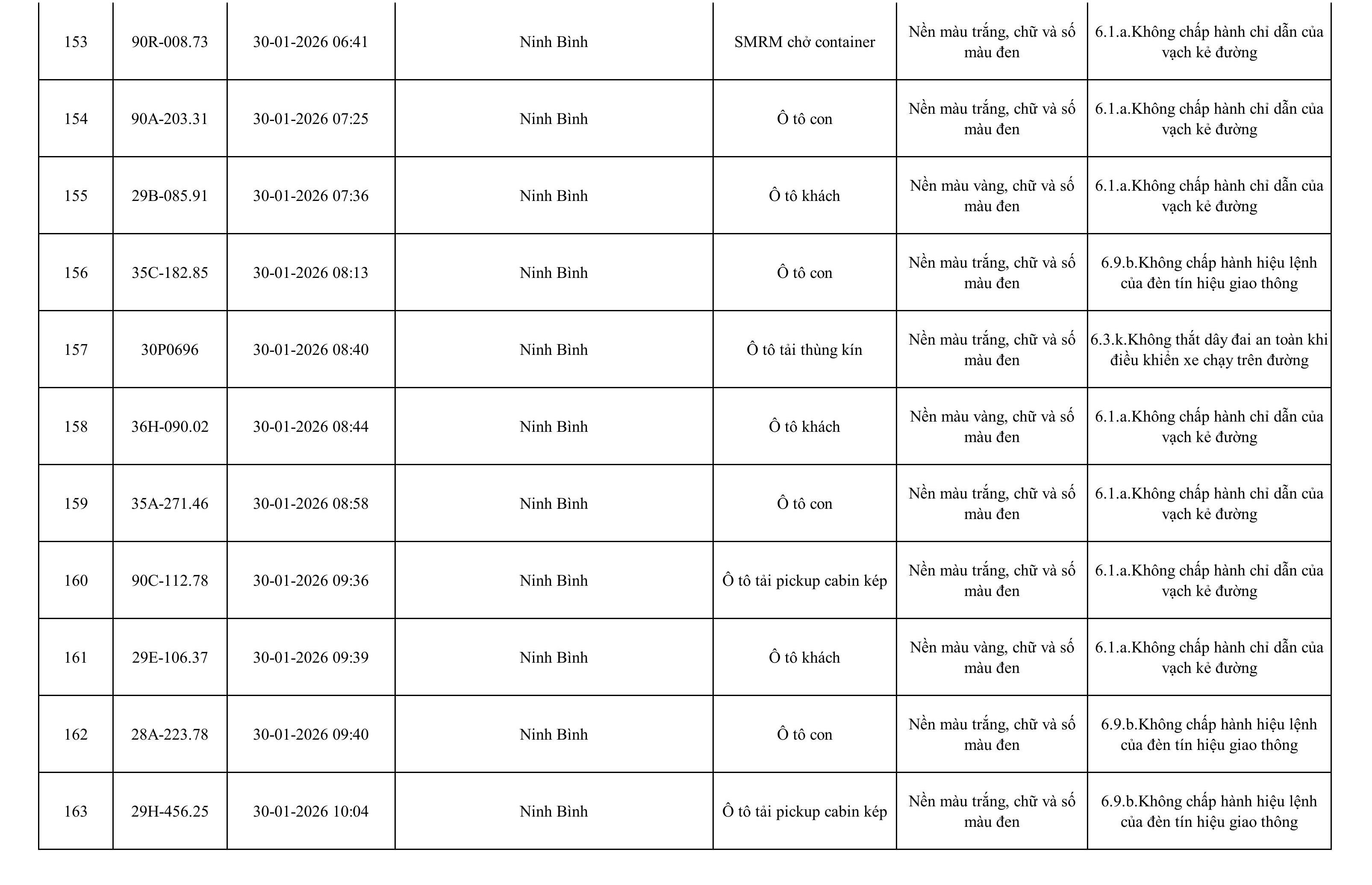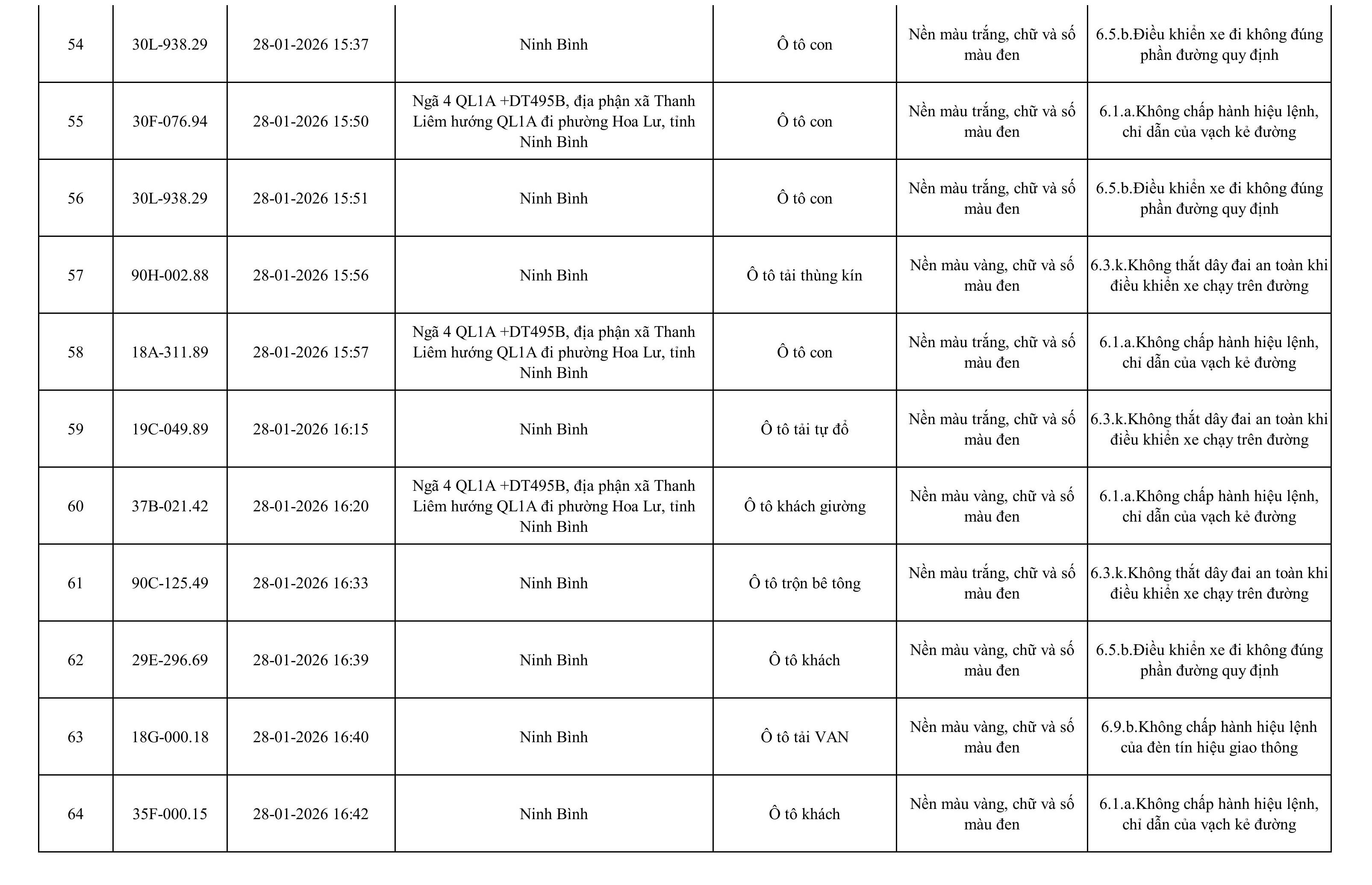Danh sách phương tiện vi phạm được phát hiện qua hệ thống giám sát và thiết bị nghiệp vụ của Công an tỉnh Ninh Bình từ ngày 28/1/2026 đến ngày 5/2/2026.