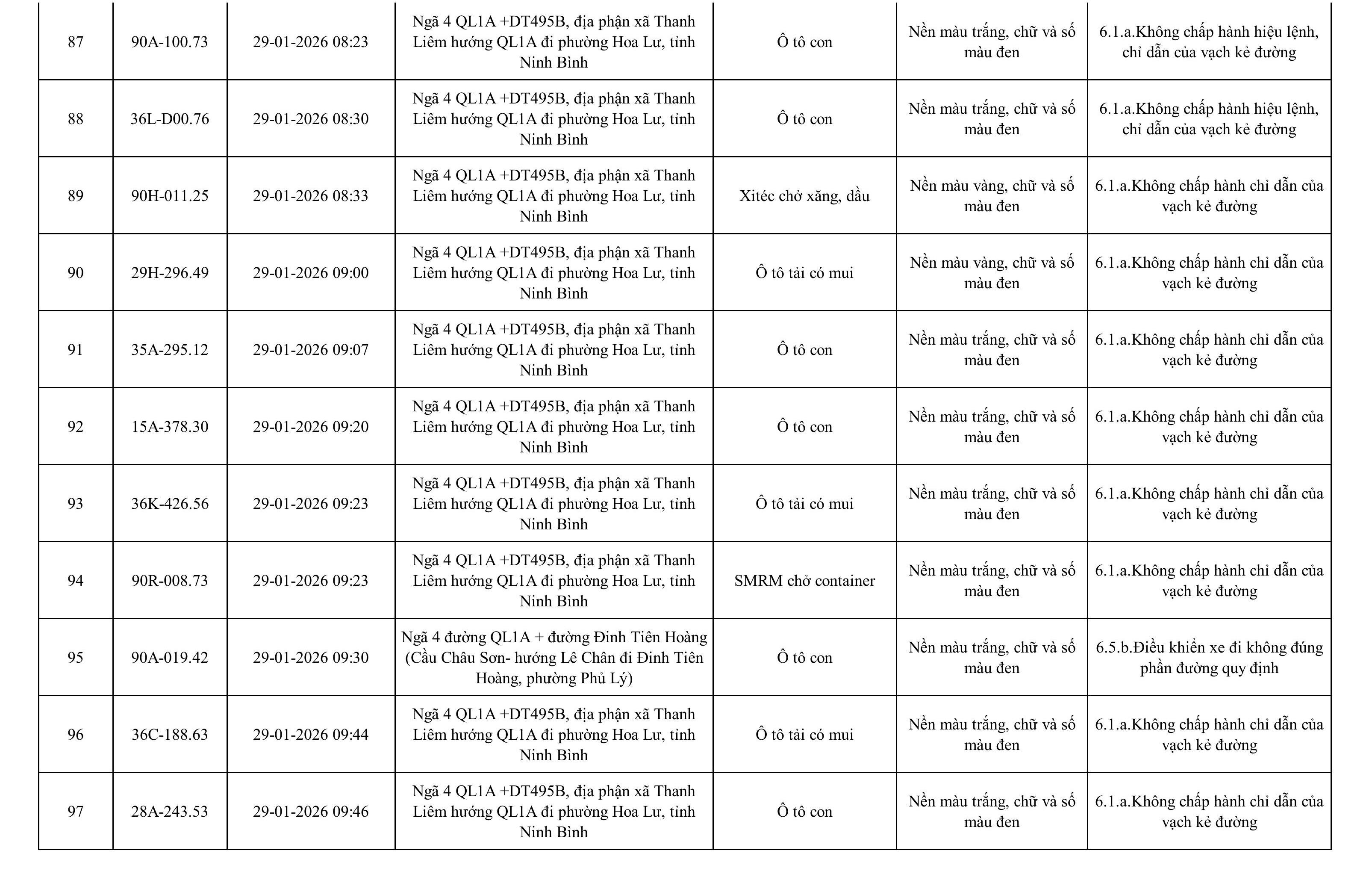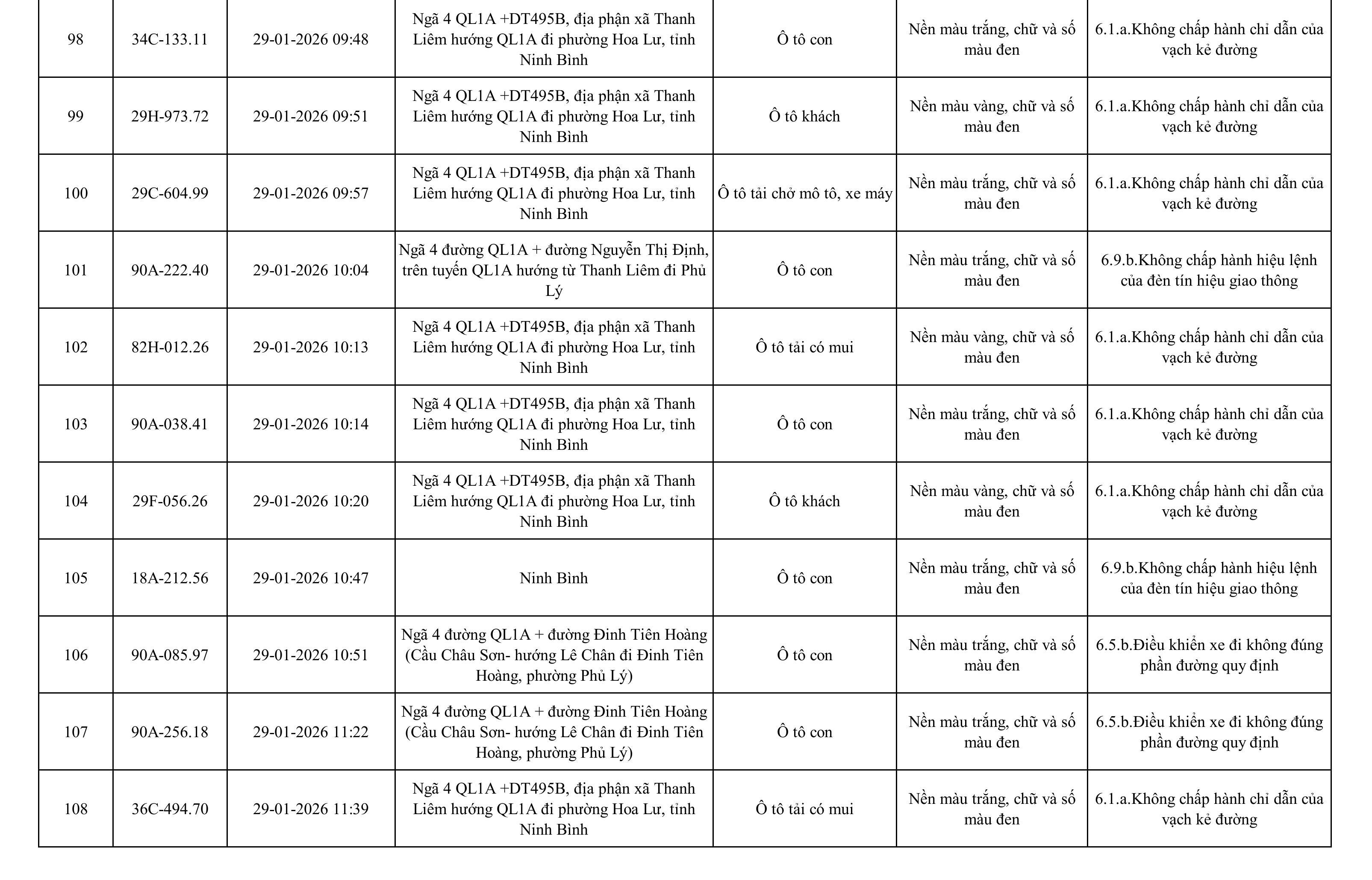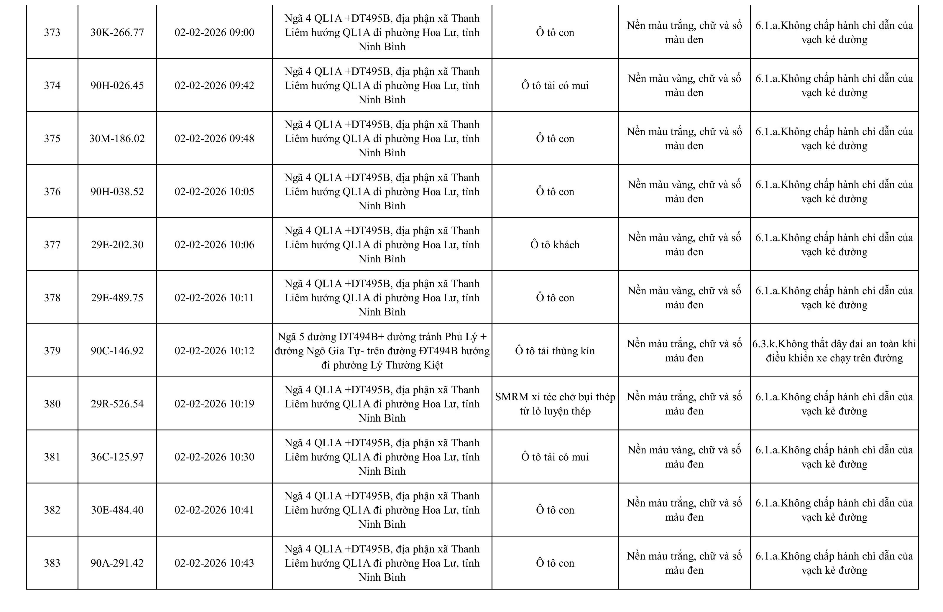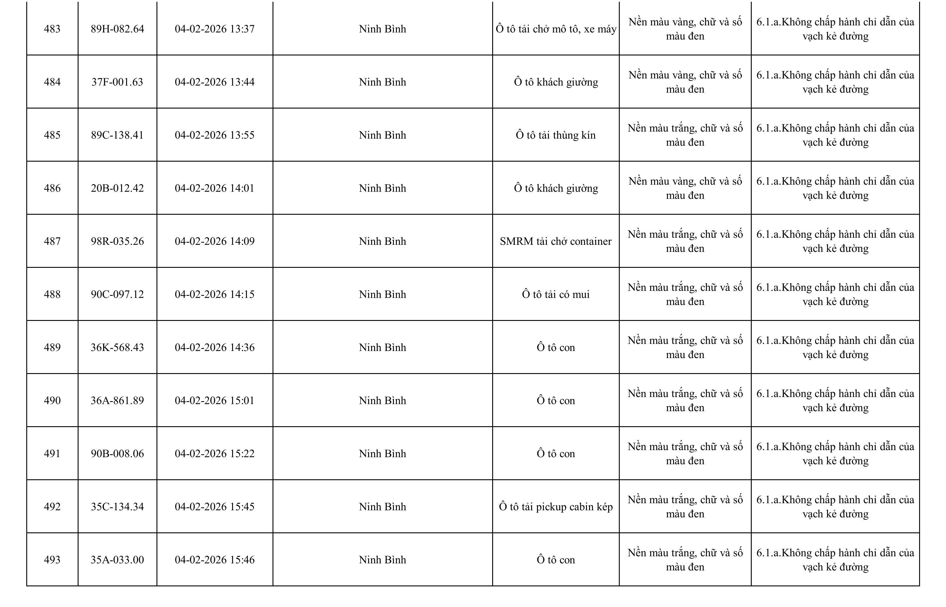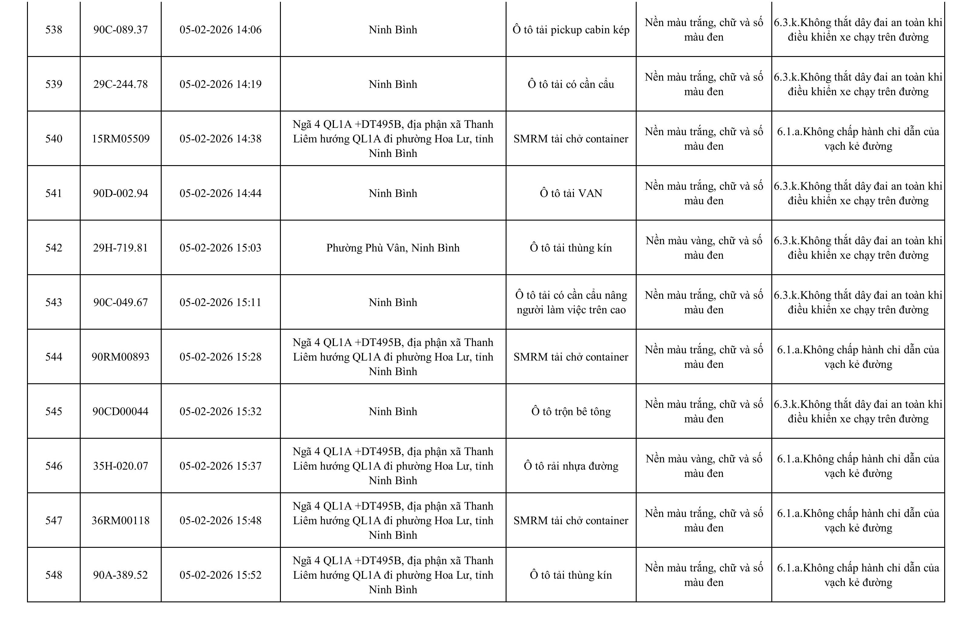 Danh sách phương tiện vi phạm được phát hiện qua hệ thống giám sát và thiết bị nghiệp vụ của Công an tỉnh Ninh Bình từ ngày 28/1/2026 đến ngày 5/2/2026.
