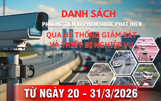 Danh sách phương tiện vi phạm giao thông được phát hiện qua hệ thống giám sát và thiết bị nghiệp vụ từ ngày 20-31/3/2026