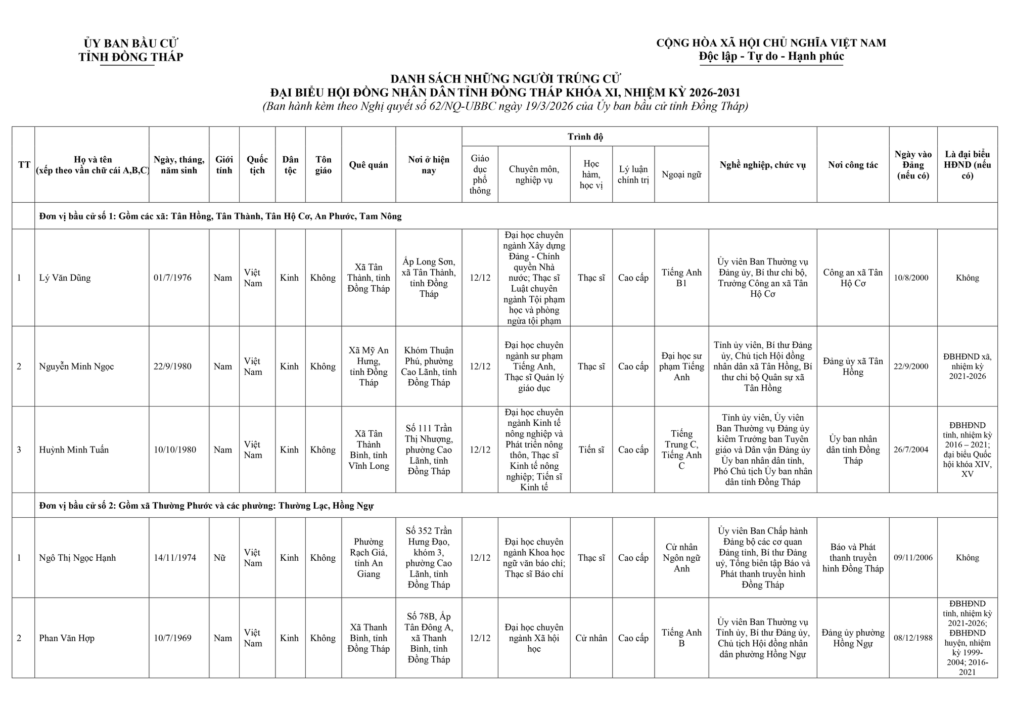Danh sách trúng cử Đại biểu HĐND tỉnh Đồng Tháp nhiệm kỳ 2026 - 2031