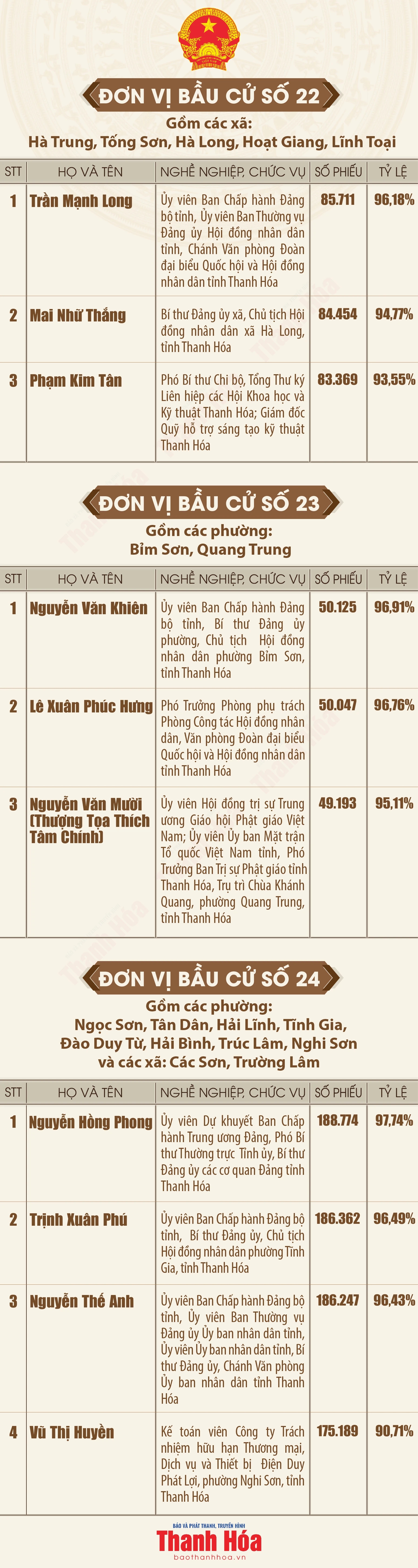 Theo đó, toàn tỉnh Thanh Hóa đã bầu đủ 85 đại biểu HĐND tỉnh, bảo đảm đúng cơ cấu, thành phần và số lượng được ấn định tại các đơn vị bầu cử.