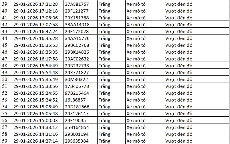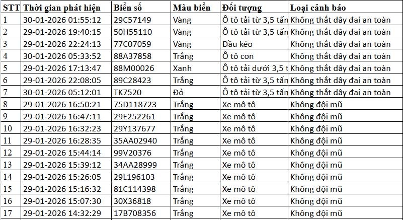 Danh sách phương tiện vi phạm được camera AI ghi nhận. Nguồn: Cục CSGT