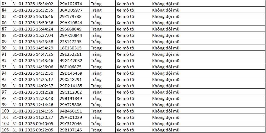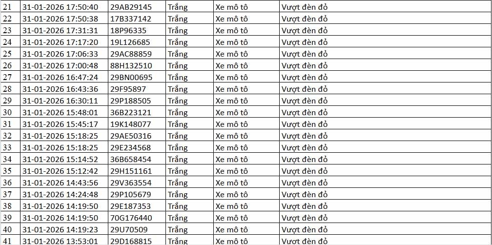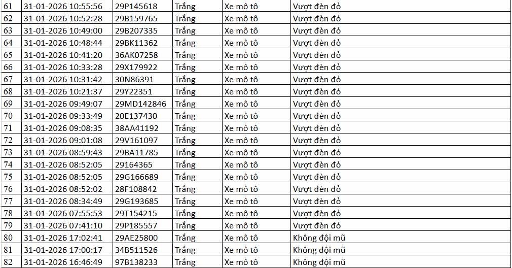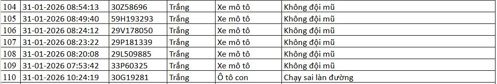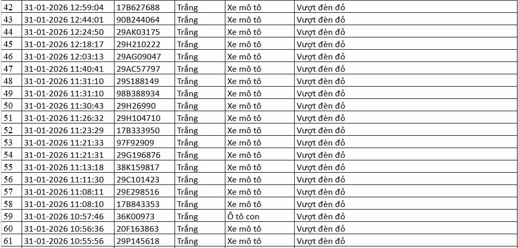 Thông tin từ Cục Cảnh sát giao thông (CSGT) - Bộ Công an cho hay, trong khoảng thời gian từ 12h ngày 31-1 đến 12h ngày 1-2-2026, hệ thống camera ứng dụng trí tuệ nhân tạo (AI) do đơn vị này vận hành đã ghi nhận nhiều trường hợp vi phạm trật tự, an toàn giao thông trên địa bàn Hà Nội và tuyến cao tốc Nội Bài - Lào Cai.