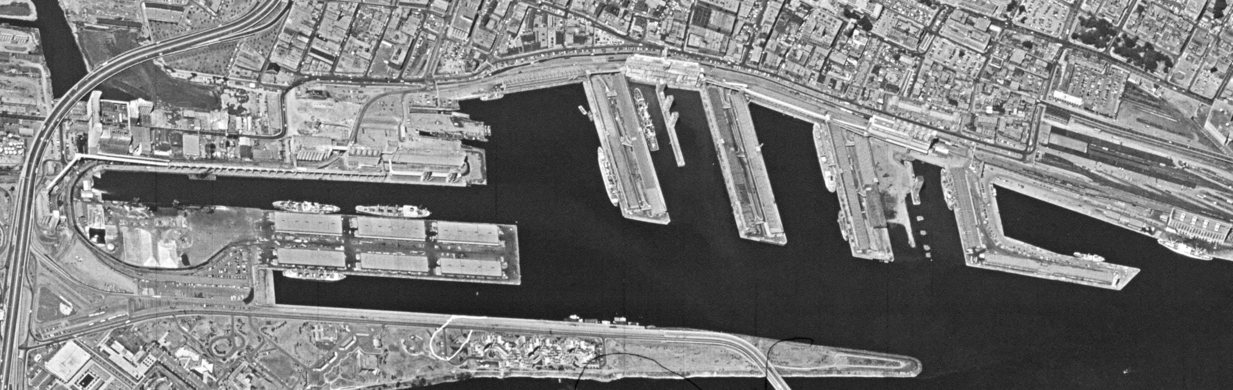 Về mặt không gian, Port de Montreál (Nay là Vieux-Port) được xây dựng như một quần thể "đa lớp", được kiến tạo qua nhiều thời kỳ, bao gồm các công trình cảng, kiến trúc công nghiệp, kết cấu hạ tầng và không gian bờ sông. Trong ảnh là tổng thể Port de Montreál được chụp không ảnh năm 1971. Nguồn: Ville de Montreál