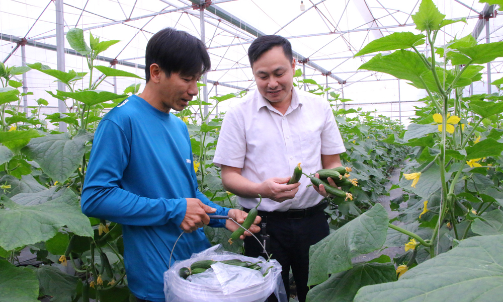 Lãnh đạo Trung tâm Cung ứng dịch vụ sự nghiệp công xã Bảo Đài thăm mô hình sản xuất dưa leo baby của gia đình anh Lê Hữu Kiên.