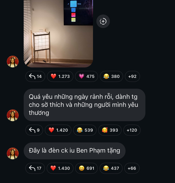 Mới đây, Phương Mỹ Chi khiến cư dân mạng rần rần khi khoe khoảnh khắc đời thường, đồng thời công khai gọi một nhân vật là "chồng iu" (chồng yêu - PV). Theo đó, Phương Mỹ Chi khoe món quà trên nhóm chat cá nhân kèm dòng chú thích: "Đây là đèn chồng iu Ben Phạm tặng".