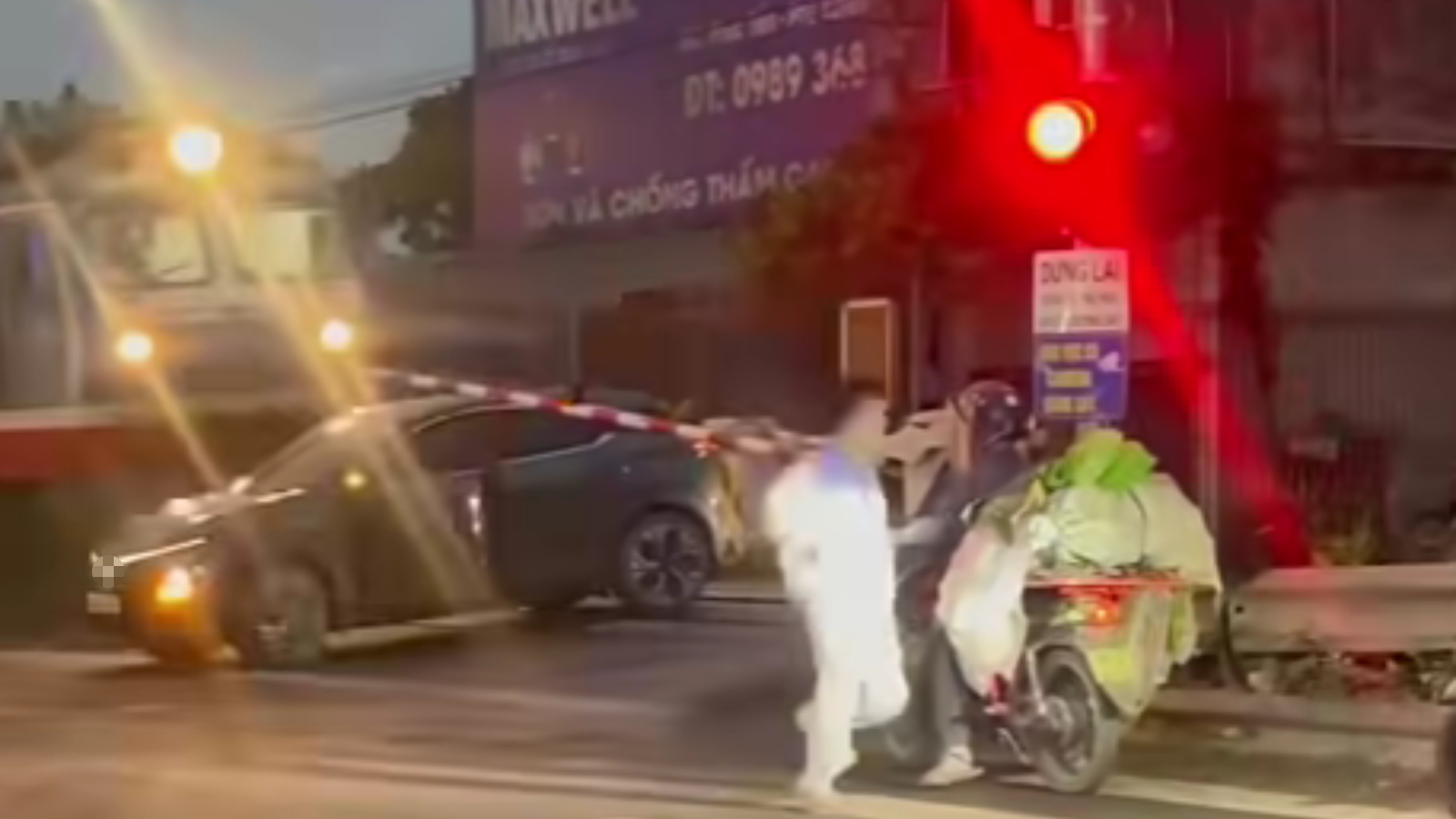 Vào thời điểm nêu trên, xe 30M-282.xx chạy từ đường trục Vân Từ hướng ra quốc lộ 1A. Clip ghi lại cho thấy, thay vì dừng xe theo hiệu lệnh của đèn tín hiệu và rào chắn để chờ tàu chạy qua thì người này đã điều khiển xe băng qua đường sắt khi thanh rào chắn đường ngang đang hạ xuống.