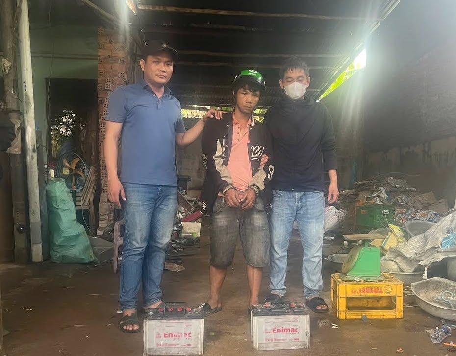 Đối tượng Nam bị bắt giữ cùng 2 bình ắc-quy tang vật vụ trộm.
