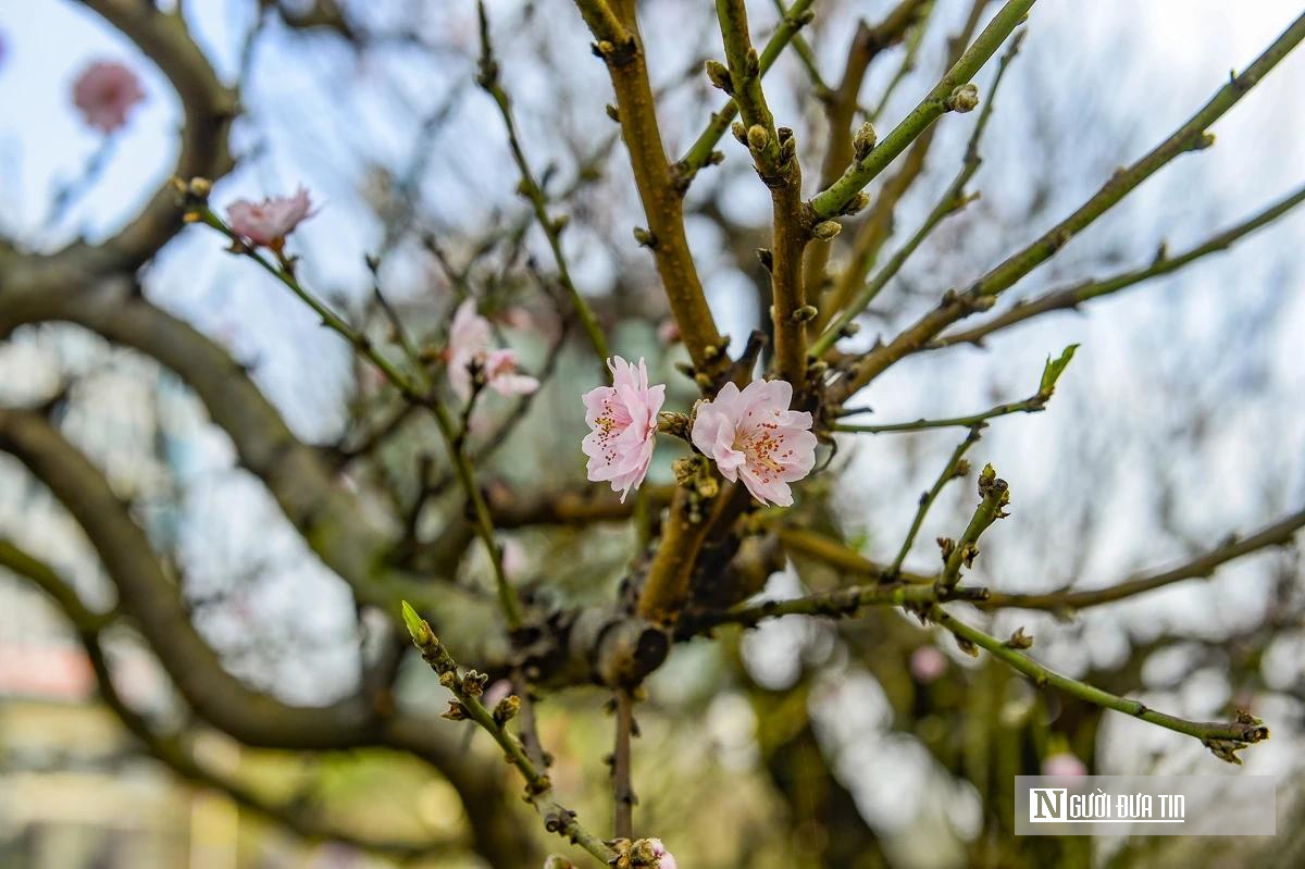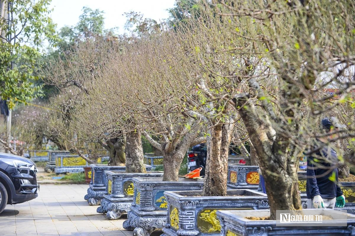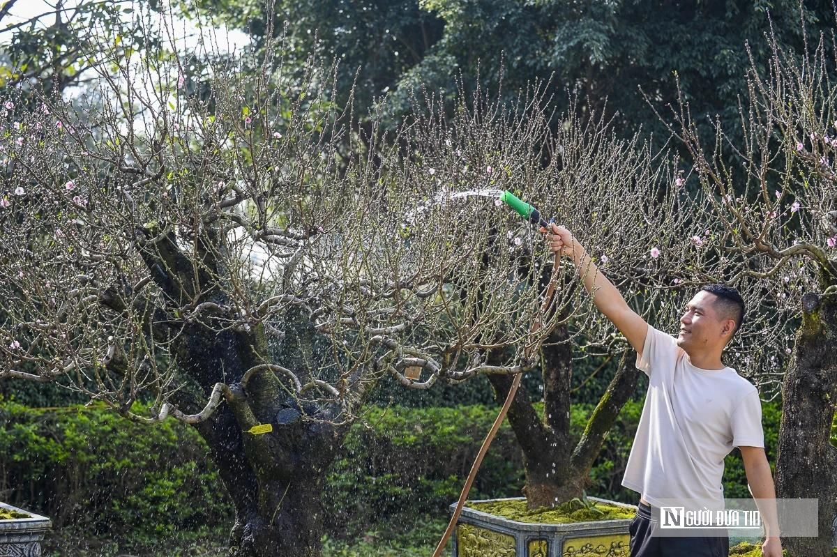 Trong khu vườn trưng bày, những gốc đào cổ thụ bung nở hoa màu hồng phai giữa không gian rộng mở, tạo nên khung cảnh rộn ràng sắc xuân. Các thợ vườn liên tục chỉnh sửa cành, tạo dáng, chăm sóc tỉ mỉ để mỗi gốc đào đạt trạng thái đẹp nhất trước thời khắc giao mùa, góp thêm sắc xuân cho phố phường những ngày cận Tết.