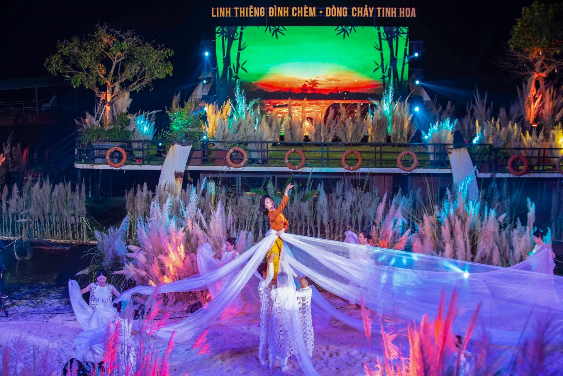 Sân khấu bán thực cảnh tại chương trình "Linh thiêng đình Chèm - Dòng chảy tinh hoa" do đạo diễn Mai Thanh Tùng thực hiện. Ảnh: Phạm Mạnh