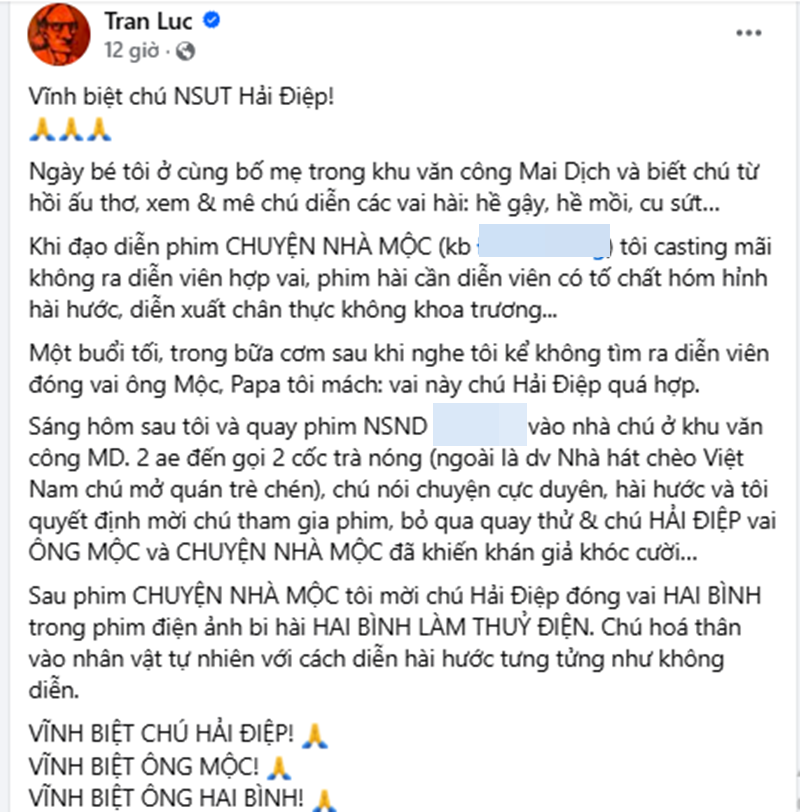Trên trang cá nhân, đạo diễn Trần Lực vừa bày tỏ sự tiếc thương nghệ sĩ Hải Điệp phim 'Chuyện nhà Mộc' qua đời. Trần Lực viết: “Vĩnh biệt chú NSƯT Hải Điệp! Ngày bé, tôi ở cùng bố mẹ trong khu văn công Mai Dịch và biết chú từ hồi ấu thơ, xem và mê chú diễn các vai hài như: hề gậy, hề mồi.