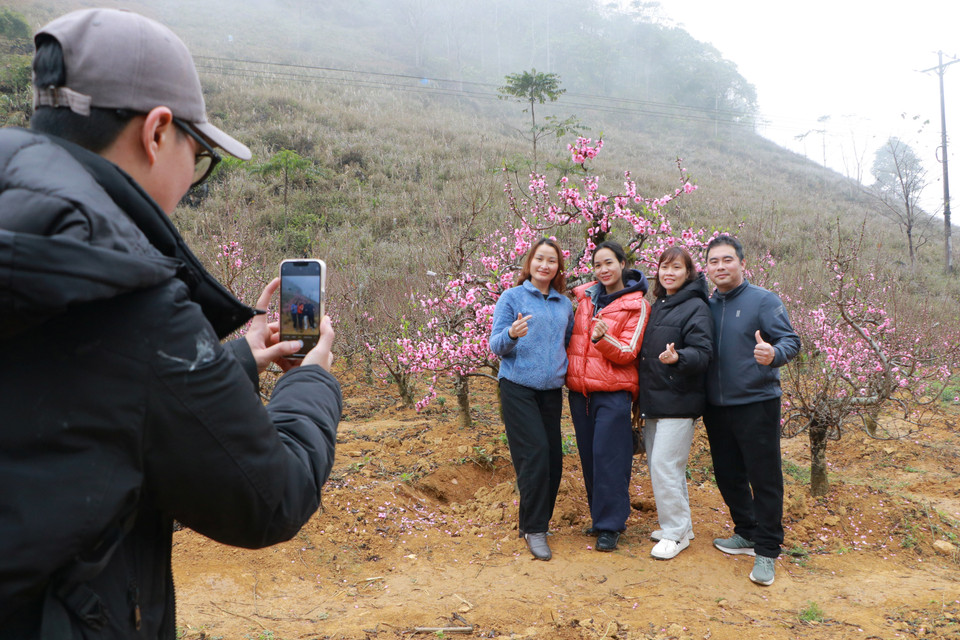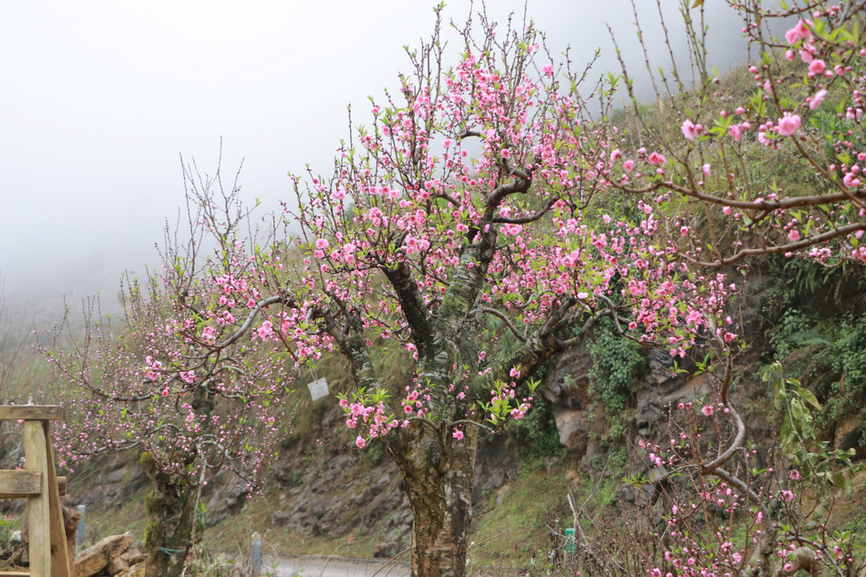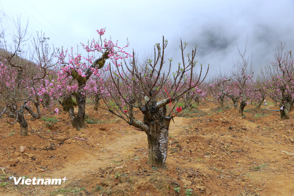 Nhờ khí hậu mát quanh năm, thổ nhưỡng phù hợp, du khách đến Lào Cai có thể gặp các vườn đào thế rực rỡ tại các huyện và thị xã như Bảo Thắng, Sa Pa, Si Ma Cai, Bát Xát... Mỗi gốc có giá từ hàng triệu đến hàng chục triệu đồng. (Ảnh: Minh Anh/Vietnam+)