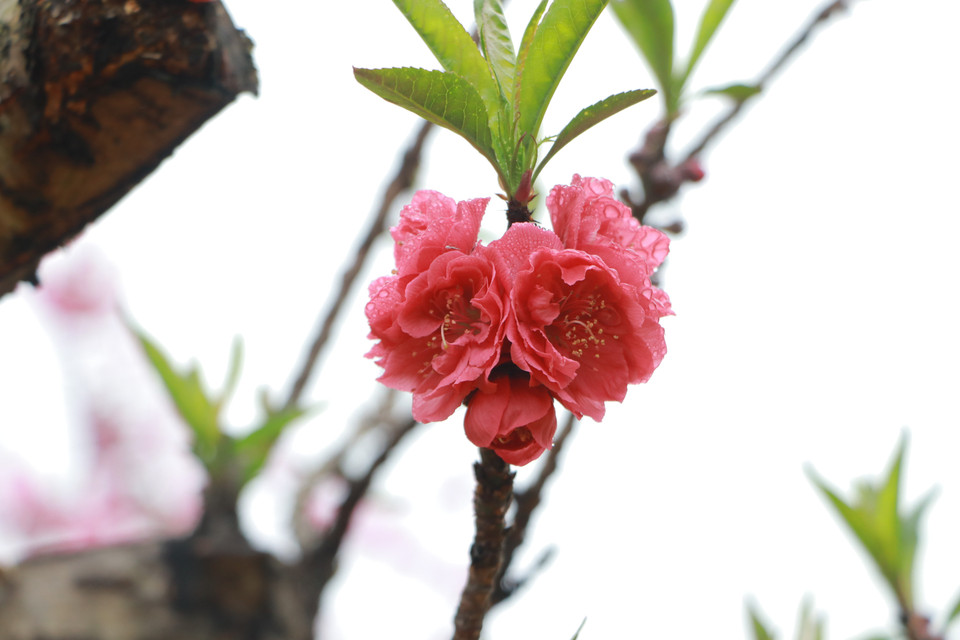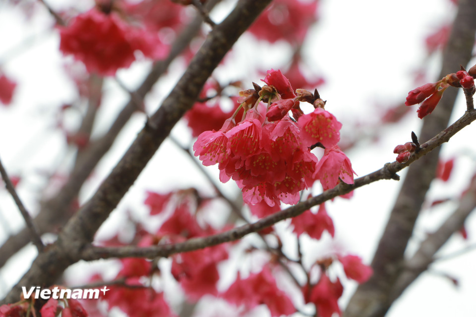 Đào Thất thốn dày bông, rực rỡ sắc hồng đỏ bên những lá non xanh mơn mởn. (Ảnh: Minh Anh/Vietnam+)