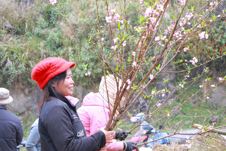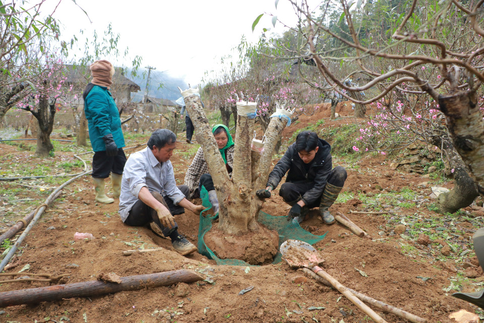 Chủ một vườn đào khác, ông Giàng A Pùa khác cũng đang tất bật những ngày cuối năm. Ông chia sẻ có hàng trăm cây đào nhưng một nửa cũng đã bung nở hết, chỉ phục vụ được cho các nhà hàng, khách sạn trưng bày trước Tết. (Ảnh: Minh Anh/Vietnam+)