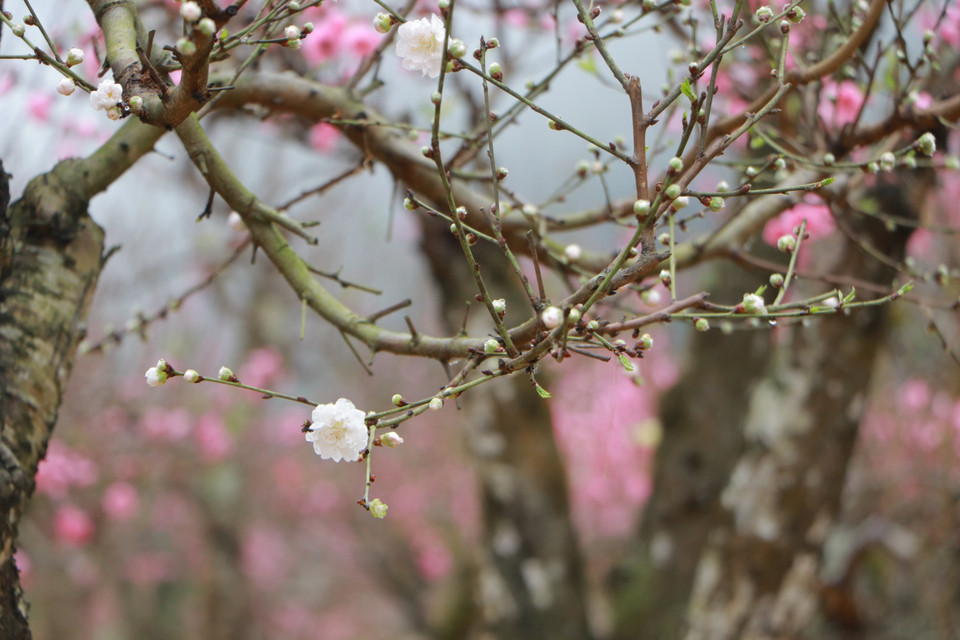Nếu hoa mận nở trắng tinh khôi thì hoa đào có màu sắc bắt mắt. (Ảnh: Minh Anh/Vietnam+)