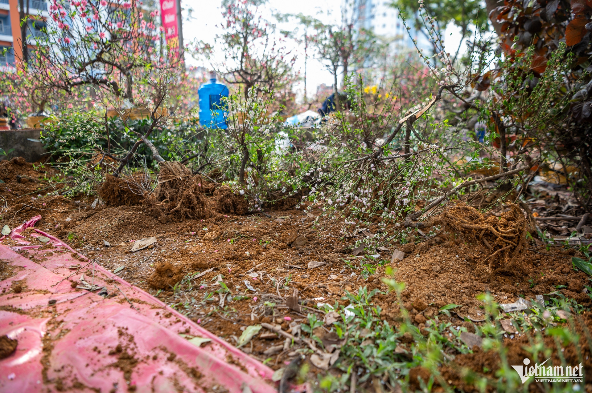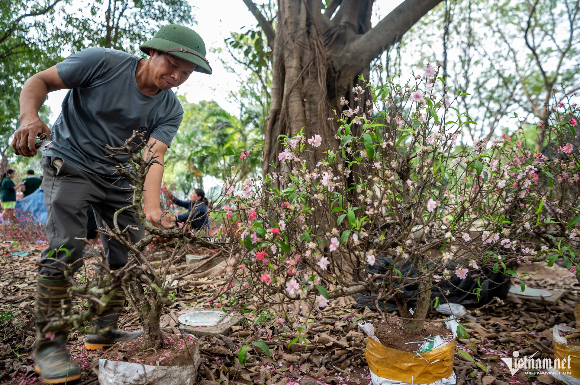 Còn hơn 30 tiếng nữa đến Giao thừa năm mới, không ít người đành chặt bỏ cây, thu dọn hàng hóa. Anh Hùng (chủ vườn đào) cho biết, nhà có hơn 1.000 cây nhưng hiện tại chỉ mới bán được khoảng vài trăm cây.